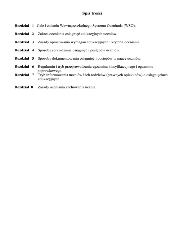 Spis treści Rozdział 1 Cele i zadania Wewnątrzszkolnego Systemu Oceniania (WSO). Rozdział 2 Zakres oceniania osiągnięć edukacyjnych uczniów. Rozdział 3 Zasady opracowania wymagań edukacyjnych i kryteria oceniania. Rozdział 4 Sposoby sprawdzania osiągnięć i postępów uczniów. Rozdział 5 Sposoby dokumentowania osiągnięć i postępów w nauce uczniów. Rozdział 6 Regulamin i tryb przeprowadzania egzaminu klasyfikacyjnego i egzaminu poprawkowego. Rozdział 7 Tryb informowania uczniów i ich rodziców (prawnych opiekunów) o osiągnięciach edukacyjnych. Rozdział 8 Zasady oceniania zachowania ucznia. Rozdział 1 Cele i zadania WSO § 1. 1. Ocenianiu podlegają: osiągnięcia edukacyjne ucznia, zachowanie ucznia. § 2. 1. Ocenianie wewnątrzszkolne ma na celu: oparcie pracy edukacyjnej o podstawy programowe o kryterialny system sprawdzania i oceniania , zwiększenie rangi stopnia opanowania umiejętności i wiadomości w ramach finalnej oceny przedmiotowej, dostarczanie uczniom i nauczycielom możliwie precyzyjnej informacji o poziomie osiągania założonych celów kształcenia, szczególnie w zakresie umiejętności, wdrażania ucznia do efektywnej samooceny, rozwijania poczucia odpowiedzialności ucznia za osobiste postępy w dziedzinie edukacji, wdrażanie uczniów do systematycznej pracy, motywowanie ucznia do dalszej pracy, pobudzanie rozwoju umysłowego ucznia, dostarczanie rodzicom (prawnym opiekunom) informacji o postępach, trudnościach i specjalnych uzdolnieniach ucznia, umożliwienie nauczycielom doskonalenia organizacji i metod dydaktyczno wychowawczych. § 3. 1. Ocenianie wewnątrzszkolne obejmuje: formułowanie przez nauczycieli wymagań edukacyjnych oraz informowanie o nich uczniów i rodziców (prawnych opiekunów), formułowanie trybu oceniania oraz informowania o nim uczniów i rodziców, bieżące ocenianie i śródroczne klasyfikowanie, według skali przyjętej w szkole. Polega na podsumowaniu osiągnięć edukacyjnych ucznia z zajęć edukacyjnych, określonym w szkolnym planie nauczania, oraz zachowania ucznia, przeprowadzania egzaminów klasyfikacyjnych i poprawkowych, przeprowadzanie egzaminów wynikających z zastrzeżeń do wystawionej oceny, ustalanie ocen rocznych. Polega na podsumowaniu osiągnięć edukacyjnych ucznia, z zajęć edukacyjnych, określonym w szkolnym planie nauczania, oraz zachowania ucznia, klasyfikację śródroczną przeprowadza się raz w ciągu roku szkolnego w terminie określonym w kalendarzu roku szkolnego. 2. Ocenianie pełni funkcję: diagnostyczną (monitorowanie postępów ucznia i określenie jego indywidualnych potrzeb), klasyfikacyjną (różnicuje i uporządkowuje uczniów zgodnie z pewną skalą). 2 3. Oceny dzielą się na: bieżące (cząstkowe), klasyfikacyjne śródroczne, klasyfikacyjne roczne. § 4. 1. Śródroczna i roczna z praktycznej nauki zawodu i praktyki zawodowej wystawiana jest przez nauczycieli praktycznej nauki zawodu. Końcową ocenę z praktyki zawodowej ustala dyrektor szkoły na podstawie opinii opiekunów praktyk. 2. Oceny są jawne dla uczniów i jego rodziców (prawnych opiekunów): na wniosek ucznia lub jego rodziców (prawnych opiekunów) nauczyciel uzasadnia ocenę, na wniosek ucznia lub jego rodziców (prawnych opiekunów) sprawdzone i ocenione pisemne prace kontrolne oraz inna dokumentacja dotycząca oceniania ucznia jest udostępniana uczniowi lub jego rodzicom (prawnym opiekunom). § 5. Oceny bieżące, klasyfikacyjne śródroczne i roczne ustala się wg następującej skali: Lp. 1. 2. 3. 4. 5. 6. 7. Ocena słowna Ocena cyfrowa Celujący Bardzo dobry Dobry Dostateczny Dopuszczający Niedostateczny Niesklasyfikowany 6 5 4 3 2 1 - Dopuszcza się stosowanie plusów (+) i minusów (-). Wprowadza się dodatkowe oznaczenia: nb - nieobecny na pracach pisemnych (ćwiczeniach sprawdzających), 1 / 3 - poprawa oceny pracy pisemnej, + - przy ocenach cząstkowych dopuszczalne są (+) za wyjątkiem oceny celującej. Prace pisemne oceniane są według skali procentowej ustalonej przez nauczyciela w zależności od stopnia trudności pracy. W tygodniu mogą odbyć się 3 prace pisemne ( powyżej 40 minut) zapowiedziane tydzień wcześniej z wpisem do dziennika. Prace klasowe są przechowywane przez nauczycieli do 31 sierpnia danego roku szkolnego. Szczegółowe kryteria oceniania z poszczególnych przedmiotów ustalają nauczyciele. Kolor oceny – czerwony, kartkówki zielony. 3 § 6. Ocenę zachowania śródroczną i roczną ustala się wg następującej skali: Lp. 1. 2. 3. 4. 5. 6. Ocena słowna Wzorowe Bardzo dobre Dobre Poprawne Nieodpowiednie Naganne 1. Ustala się skalę ocen i ich kryteria: Wzorowe wz. - uczeń szczególnie wyróżniający się swoją postawą, godnie reprezentuje swoją szkołę, rzetelnie wywiązuje się ze swoich obowiązków, aktywnie działa na rzecz szkoły i środowiska, jego kultura osobista jest bez zarzutu, Bardzo dobre bdb. - bierze odpowiedzialność za swoje błędy i potrafi je korygować, jest życzliwy i koleżeński, jego nieobecności na zajęciach i sprawdzianach zdarzają się sporadycznie i są usprawiedliwiane, angażuje się w życie szkoły, klasy, Dobre db. - uczeń, który swoim zachowaniem nie odbiega od powszechnie przyjętych norm postępowania a zarazem wyróżnia się przynajmniej w jednej dziedzinie, Poprawne pop. - otrzymuje uczeń, który swoim zachowaniem nie odbiega od powszechnie przyjętych norm postępowania a zarazem nie wyróżnia się ani pozytywnie ani negatywnie, ma negatywne wpisy dotyczące kultury osobistej, Nieodpowiednie ndp.- opuszcza bez usprawiedliwienia zajęcia szkolne, stosuje używki, nieodpowiednio traktuje inne osoby oraz mienie, często otrzymuje uwagi o złym zachowaniu, łamie regulamin szkoły, Naganne ng. - wchodzi w konflikt z prawem, swoim zachowaniem spowodował uszkodzenie ciała lub mienia innych osób, jest agresywny i wulgarny, wagaruje, nie stosuje się do zasad regulaminu szkoły 2. Kultura osobista