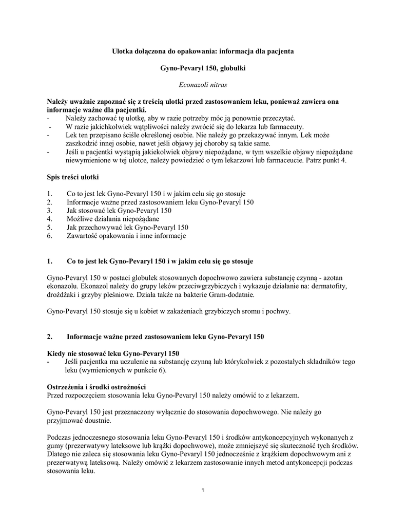 Ulotka dołączona do opakowania: informacja dla pacjenta Gyno-Pevaryl 150, globulki Econazoli nitras Należy uważnie zapoznać się z treścią ulotki przed zastosowaniem leku, ponieważ zawiera ona informacje ważne dla pacjentki. Należy zachować tę ulotkę, aby w razie potrzeby móc ją ponownie przeczytać. W razie jakichkolwiek wątpliwości należy zwrócić się do lekarza lub farmaceuty. Lek ten przepisano ściśle określonej osobie. Nie należy go przekazywać innym. Lek może zaszkodzić innej osobie, nawet jeśli objawy jej choroby są takie same. Jeśli u pacjentki wystąpią jakiekolwiek objawy niepożądane, w tym wszelkie objawy niepożądane niewymienione w tej ulotce, należy powiedzieć o tym lekarzowi lub farmaceucie. Patrz punkt 4. Spis treści ulotki 1. 2. 3. 4. 5. 6. Co to jest lek Gyno-Pevaryl 150 i w jakim celu się go stosuje Informacje ważne przed zastosowaniem leku Gyno-Pevaryl 150 Jak stosować lek Gyno-Pevaryl 150 Możliwe działania niepożądane Jak przechowywać lek Gyno-Pevaryl 150 Zawartość opakowania i inne informacje 1. Co to jest lek Gyno-Pevaryl 150 i w jakim celu się go stosuje Gyno-Pevaryl 150 w postaci globulek stosowanych dopochwowo zawiera substancję czynną - azotan ekonazolu. Ekonazol należy do grupy leków przeciwgrzybiczych i wykazuje działanie na: dermatofity, drożdżaki i grzyby pleśniowe. Działa także na bakterie Gram-dodatnie. Gyno-Pevaryl 150 stosuje się u kobiet w zakażeniach grzybiczych sromu i pochwy. 2. Informacje ważne przed zastosowaniem leku Gyno-Pevaryl 150 Kiedy nie stosować leku Gyno-Pevaryl 150 Jeśli pacjentka ma uczulenie na substancję czynną lub którykolwiek z pozostałych składników tego leku (wymienionych w punkcie 6). Ostrzeżenia i środki ostrożności Przed rozpoczęciem stosowania leku Gyno-Pevaryl 150 należy omówić to z lekarzem. Gyno-Pevaryl 150 jest przeznaczony wyłącznie do stosowania dopochwowego. Nie należy go przyjmować doustnie. Podczas jednoczesnego stosowania leku Gyno-Pevaryl 150 i środków antykoncepcyjnych wykonanych z gumy (prezerwatywy lateksowe lub krążki dopochwowe), może zmniejszyć się skuteczność tych środków. Dlatego nie zaleca się stosowania leku Gyno-Pevaryl 150 jednocześnie z krążkiem dopochwowym ani z prezerwatywą lateksową. Należy omówić z lekarzem zastosowanie innych metod antykoncepcji podczas stosowania leku. 1 Globulek Gyno-Pevaryl 150 nie należy stosować razem z innym, miejscowym (zewnętrznym lub dopochwowym) sposobem leczenia narządów płciowych. Jeśli wystąpią nasilone objawy podrażnienia lub uczulenia, leczenie należy przerwać i ponownie zgłosić się do lekarza. Jeśli pacjentka jest uczulona na pochodne imidazolowe, może być także uczulona na azotan ekonazolu – substancję czynną leku. Dzieci i młodzież Nie należy stosować leku u pacjentek w wieku do 16 lat, gdyż nie określono bezpieczeństwa stosowania ani skuteczności działania leku w tej grupie wiekowej. Lek Gyno-Pevaryl 150 a inne leki Należy powiedzieć lekarzowi lub farmaceucie o wszystkich lekach stosowanych przez pacjentkę obecnie lub ostatnio, a także o lekach, które pacjentka planuje stosować. Skuteczność plemnikobójczych środków antykoncepcyjnych może ulegać znacznemu osłabieniu pod wpływem stosowanych miejscowo leków dopochwowych, w tym leku Gyno-Pevaryl 150. Należy unikać kontaktu leku Gyno Pevaryl 150 z produktami lateksowymi, takimi jak krążki lateksowe lub prezerwatywy, gdyż składniki globulek mogą uszkadzać lateks. Ze względu na niewielkie wchłanianie substancji czynnej do organizmu po podaniu dopochwowym jest mało prawdopodobne, aby oddziaływała ona w sposób istotny z innymi lekami. Stwierdzano jednak oddziaływanie azotanu ekonazolu z doustnymi lekami przeciwzakrzepowymi (zmniejszającymi krzepliwość krwi). Jeśli pacjentka przyjmuje doustne leki przeciwzakrzepowe, takie jak warfaryna lub acenokumarol, powinna powiedzieć o tym lekarzowi, który będzie kontrolował ich działanie przeciwzakrzepowe. Stosowanie leku Gyno-Pevaryl 150 u pacjentek w podeszłym wieku Dane dotyczące stosowania leku u kobiet w wieku powyżej 65 lat są niewystarczające. Ciąża i karmienie piersią Jeśli pacjentka jest w ciąży lub karmi piersią, przypuszcza, że może być w ciąży lub gdy planuje mieć dziecko, powinna poradzić się lekarza lub farmaceuty przed zastosowaniem tego leku. Substancja czynna leku Gyno-Pevaryl 150 wchłania się z pochwy, dlatego też leku nie należy stosować w pierwszym trymestrze ciąży, chyba że lekarz uzna, iż ma to istotne znaczenie dla zdrowia pacjentki. Gyno-Pevaryl 150 może być stosowany w drugim lub trzecim trymestrze ciąży, jeśli spodziewane korzyści dla matki przeważają nad możliwym ryzykiem dla płodu. Stosując lek Gyno-Pevaryl 150 w okresie karmienia piersią należy zachować ostrożność. Prowadzenie pojazdów i obsługiwanie maszyn Nie jest znany wpływ leku na zdolność prowadzenia pojazdów i obsługiwania maszyn. 2 3. Jak stosować lek Gyno-Pevaryl 150 Gyno-Pevaryl 150 należy zawsze stosować zgodnie z zaleceniami lekarza. W razie wątpliwości należy skontaktować się z lekarzem lub farmaceutą. Nie stosować leku Gyno-Pevaryl 150 doustnie. Globulkę należy wprowadzać głęboko do pochwy, najlepiej pozostając w pozycji półleżącej. Lek stosuje się raz w ciągu doby, przed spoczynkiem nocnym, przez kolejne 3 dni. W razie nawrotu choroby lub pozytywnego wyniku posiewu tydzień po zakończeniu leczenia, kurację należy ponowić. Jeśli pacjentka jest w ciąży, powinna dokładnie umyć ręce przed zastosowaniem globulki. Zastosowanie większej niż zalecana dawki leku Gyno-Pevaryl 150 Gyno-Pevaryl 150 stosuje się wyłącznie miejscowo. W razie przypadkowego, doustnego przyjęcia globulki należy zastosować leczenie objawowe. W razie przypadkowego dostania się leku do oczu należy przepłukać je czystą wodą lub roztworem fizjologicznym soli, a j