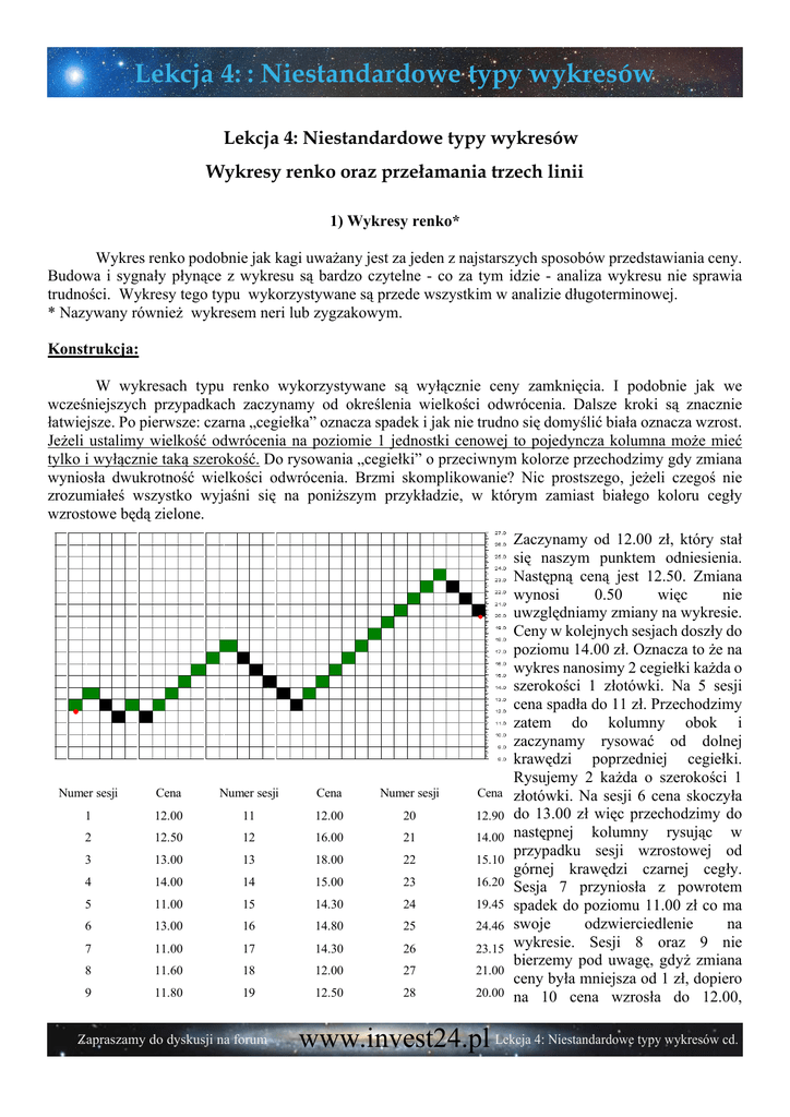 Lekcja 4: : Niestandardowe typy wykresów Lekcja 4: Niestandardowe typy wykresów Wykresy renko oraz przełamania trzech linii 1) Wykresy renko* Wykres renko podobnie jak kagi uwaŜany jest za jeden z najstarszych sposobów przedstawiania ceny. Budowa i sygnały płynące z wykresu są bardzo czytelne - co za tym idzie - analiza wykresu nie sprawia trudności. Wykresy tego typu wykorzystywane są przede wszystkim w analizie długoterminowej. * Nazywany równieŜ wykresem neri lub zygzakowym. Konstrukcja: W wykresach typu renko wykorzystywane są wyłącznie ceny zamknięcia. I podobnie jak we wcześniejszych przypadkach zaczynamy od określenia wielkości odwrócenia. Dalsze kroki są znacznie łatwiejsze. Po pierwsze: czarna „cegiełka” oznacza spadek i jak nie trudno się domyślić biała oznacza wzrost. JeŜeli ustalimy wielkość odwrócenia na poziomie 1 jednostki cenowej to pojedyncza kolumna moŜe mieć tylko i wyłącznie taką szerokość. Do rysowania „cegiełki” o przeciwnym kolorze przechodzimy gdy zmiana wyniosła dwukrotność wielkości odwrócenia. Brzmi skomplikowanie? Nic prostszego, jeŜeli czegoś nie zrozumiałeś wszystko wyjaśni się na poniŜszym przykładzie, w którym zamiast białego koloru cegły wzrostowe będą zielone. Numer sesji Cena Numer sesji Cena Numer sesji Cena 1 12.00 11 12.00 20 12.90 2 12.50 12 16.00 21 14.00 3 13.00 13 18.00 22 15.10 4 14.00 14 15.00 23 16.20 5 11.00 15 14.30 24 19.45 6 13.00 16 14.80 25 24.46 7 11.00 17 14.30 26 23.15 8 11.60 18 12.00 27 21.00 9 11.80 19 12.50 28 20.00 Zapraszamy do dyskusji na forum Zaczynamy od 12.00 zł, który stał się naszym punktem odniesienia. Następną ceną jest 12.50. Zmiana wynosi 0.50 więc nie uwzględniamy zmiany na wykresie. Ceny w kolejnych sesjach doszły do poziomu 14.00 zł. Oznacza to Ŝe na wykres nanosimy 2 cegiełki kaŜda o szerokości 1 złotówki. Na 5 sesji cena spadła do 11 zł. Przechodzimy zatem do kolumny obok i zaczynamy rysować od dolnej krawędzi poprzedniej cegiełki. Rysujemy 2 kaŜda o szerokości 1 złotówki. Na sesji 6 cena skoczyła do 13.00 zł więc przechodzimy do następnej kolumny rysując w przypadku sesji wzrostowej od górnej krawędzi czarnej cegły. Sesja 7 przyniosła z powrotem spadek do poziomu 11.00 zł co ma swoje odzwierciedlenie na wykresie. Sesji 8 oraz 9 nie bierzemy pod uwagę, gdyŜ zmiana ceny była mniejsza od 1 zł, dopiero na 10 cena wzrosła do 12.00, www.invest24.pl Lekcja 4: Niestandardowe typy wykresów cd. Lekcja 4: : Niestandardowe typy wykresów jednak nie mogliśmy tego nanieść gdyŜ w przypadku zmiany kierunku wielkość zmiany musi być przynajmniej 2-krotnie większa od wielkości odwrócenia. Ceny poszybowały do poziomu 18.00 zł. Rysujemy zatem tyle cegiełek ile jest zmian o wartości 1. Na następnej sesji przyszło odreagowanie i spadek do 15.00 zł. Rysujemy zatem 2 cegły. Kolejnych 3 sesji nie bierzemy pod uwagę i przechodzimy do następnej kolumny, gdyŜ na sesji 18.00 cena spadła do 12.00 zł i od tamtego momentu urosła do 24.46 zł na 25 sesji. Oczywiście na wykresie widoczny jest tylko poziom 24.00 zł. Kolejne dwie sesje przyniosły rozczarowanie i w rezultacie czego nastąpił spadek do poziomu 20.00 zł – na wykresie powstały 3 czarne cegły. 2) Wykresy przełamania trzech linii* W przeciwieństwie do wykresu renko, wykres przełamania trzech linii zdobył większa choć nie oszałamiającą popularność. Z tego typu wykresu płynie duŜo więcej informacji, jednak konstrukcja nie jest juŜ taka prosta. Z początku wydaje się, Ŝe jedyną rzeczą, która róŜni wykres renko od przełamania trzech linii, jest tylko wielkość słupka. Jednak to tylko pozory. * Inne nazwy wykresów przełamania trzech linii to : nowa cena trzech kroków, przejście trzech linii, trzy-liniowe przełamanie nowej ceny, metoda trzy-liniowego odwrotu. Konstrukcja: Pojedynczy słupek w terminologii japońskiej to linia, a nie jak to było wcześniej cegiełka. Co więcej nie ustalamy na początku wielkości odwrócenia. Jest ona określona, ale nie jest stała dlatego jej ustalanie jest czynnością bezsensowną. Jak zatem rysujemy kolejne linie? Jeśli rynek osiąga nowe maksimum do wykresu dodaje się białą linię (na poniŜszym przykładzie będę uŜywał koloru zielonego), gdy zaś osiągnięte przez cenę zostaje nowe minimum do wykresu dodaje się czarną linię. JeŜeli kolejna sesja nie posiada Ŝadnego nowego ekstremum nie korygujemy wykresu. Skąd w nazwie liczba 3 ? OtóŜ jeśli zwyŜka, bądź spadek jest na tyle silne, Ŝe na wykresie powstają 3 kolejne linie tego samego koloru, to w takiej sytuacji linię przeciwnego koloru narysować moŜemy tylko i wyłącznie gdy osiągnięte zostało minimum bądź maksimum (w zaleŜności od koloru poprzedzających bloków) z trzech ostatnich sesji. Przejdźmy do konkretnego przykładu: Numer sesji Cena Numer sesji Cena Numer sesji Cena 1 12.00 11 12.00 20 12.90 2 12.50 12 16.00 21 14.00 3 13.00 13 18.00 22 15.00 4 14.00 14 15.00 23 16.00 5 11.00 15 14.00 24 20.00 6 13.00 16 14.80 25 25.00 7 11.00 17 14.30 26 23.00 8 11.60 18 12.00 27 21.00 9 11.80 19 12.50 28 20.00 Punktem wyjścia jest tradycyjnie poziom 12.00 zł. Następna sesja przyniosła wzrost do 12.50, a więc zaznaczamy zaistniałą sytuację na wykresie. Na kolejnej sesji kolejny wzrost, równieŜ nanosimy. Tak samo postępujemy podczas kolejnej sesji. Widzimy, Ŝe na wykresie pojawiły się 3 kolejne wzrostowe bloki zatem, aby móc nanieść blok przeciwny (czarny) musi nastąpić spadek poniŜej 12.00 zł. Na sesji 5 ceny spadły do poziomu 11.00 zł więc moŜemy narysować wywoływany przez mnie czarny blok. Na kolejnych 6 sesjach nie powstało nowe maksimum bądź minimum więc nic na wykresie się nam nie zmienia. Dopiero na wykres nanosimy sesje 12 Zapraszamy do dyskusji na forum www.invest24.pl Lekcja 4: Niestandardowe typy wykresów cd. Lekcja 4: : Niestandardowe typy wykresów i 13. Kolejna
