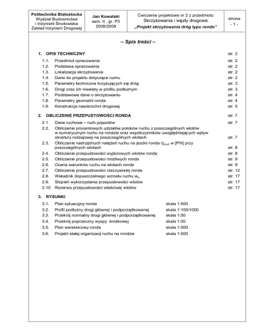 Politechnika Białostocka Wydział Budownictwa i Inżynierii Środowiska Zakład Inżynierii Drogowej Ćwiczenie projektowe nr 2 z przedmiotu Jan Kowalski sem. II , gr. P3 2008/2009 Skrzyżowania i węzły drogowe „Projekt skrzyżowania dróg typu rondo” strona -1- – Spis treści – 1. OPIS TECHNICZNY 1.1. 1.2. 1.3. 1.4. 1.5. 1.6. 1.7. 1.8. 1.9. str. 2 Przedmiot opracowania Podstawa opracowania Lokalizacja skrzyżowania Dane do projektu dotyczące ruchu Parametry techniczne krzyżujących się dróg Drogi oraz ich niwelety w profilu podłużnym Podstawowe dane o skrzyżowaniu Parametry geometrii ronda Konstrukcja nawierzchni drogowej str. 2 str. 2 str. 2 str. 2 str. 3 str. 3 str. 4 str. 4 str. 5 2. OBLICZENIE PRZEPUSTOWOŚCI RONDA str. 7 2.1. 2.2. Dane ruchowe – ruch pojazdów Obliczenie procentowych udziałów potoków ruchu z poszczególnych wlotów w sumarycznym ruchu na rondzie oraz współczynników uwzględniających wpływ struktury rodzajowej na poszczególnych wlotach 2.3. Obliczenie nadrzędnych natężeń ruchu na jezdni ronda Q w [P/h] przy poszczególnych wlotach 2.4. Obliczenie przepustowości wyjściowych wlotów ronda 2.5. Obliczenie przepustowości możliwych ronda 2.6. Ocena warunków ruchu na wlotach ronda 2.7. Obliczenie przepustowości rzeczywistej ronda 2.8. Wskaźnik dopuszczalnego wzrostu ruchu wrr 2.9. Stopień wykorzystania przepustowości wlotów 2.10. Rezerwa przepustowości właściwej wlotów 3. RYSUNKI 3.1. Plan sytuacyjny ronda skala 1:500 3.2. 3.3. Profil podłużny drogi głównej i podporządkowanej Przekrój normalny drogi głównej i podporządkowanej skala 1:100/1000 skala 1:50 3.4. Przekrój poprzeczny wyspy środkowej skala 1:50 3.5. Plan warstwicowy ronda skala 1:500 3.6. Projekt stałej organizacji ruchu na rondzie skala 1:500 str. 7 str. 7 str. 8 str. 8 str. 9 str. 9 str. 12 str. 17 str. 17 str. 17 Politechnika Białostocka Wydział Budownictwa i Inżynierii Środowiska Zakład Inżynierii Drogowej Jan Kowalski sem. II , gr. P3 2008/2009 Ćwiczenie projektowe nr 2 z przedmiotu Skrzyżowania i węzły drogowe „Projekt skrzyżowania dróg typu rondo” strona -2- 1. OPIS TECHNICZNY 1.1. Przedmiot opracowania Celem projektu jest geometryczne rozwiązanie ronda cztero-wlotowego między dwiema drogami klas G i Z zlokalizowanymi poza terenem zabudowanym. Drogi krzyżują się pod kątem prostym, w KM 45+440,37 drogi głównej DK19. 1.2. Podstawa opracowania • • • Rozporządzenia Ministra Transportu i Gospodarki Morskiej z dnia 2 marca 1999 r. „W sprawie warunków technicznych jakim powinny odpowiadać drogi publiczne i ich usytuowanie”, zawarte w Dzienniku Ustaw RP nr 43, poz. 430 z 14 maja 1999 roku „Wytyczne projektowania skrzyżowań drogowych” część II, GDDP, Warszawa 2001 „Metoda obliczania przepustowości rond”, GDDKiA, Warszawa 2004 1.3. Lokalizacja skrzyżowania 1.4. Dane do projektu dotyczące ruchu Danymi wyjściowymi do projektu są: • natężenie i struktura kierunkowa ruchu na skrzyżowaniu: Wlot A QAL = 83 P/h QAW = 250 P/h QAP = 79 P/h Wlot B QBL = 89 P/h QBW = 264 P/h QBP = 88 P/h Wlot C QCL = 42 P/h QCW = 60 P/h QCP = 33 P/h Wlot D QDL = 42 P/h QDW = 42 P/h QDP = 55 P/h Politechnika Białostocka Wydział Budownictwa i Inżynierii Środowiska Zakład Inżynierii Drogowej • 1.5. Jan Kowalski sem. II , gr. P3 2008/2009 Ćwiczenie projektowe nr 2 z przedmiotu Skrzyżowania i węzły drogowe „Projekt skrzyżowania dróg typu rondo” struktura rodzajowa ruchu na skrzyżowaniu: - udział w potoku ruchu pojazdów osobowych i dostawczych: 77% - samochodów ciężarowych: 13%, - samochodów ciężarowych z naczepami i autobusów: 10% Parametry techniczne krzyżujących się dróg Droga główna kl. G: • Klasa drogi: G 1/2 • Prędkość projektowa: Vp = 60 km/h • Prędkość miarodajna: Vm = 80 km/h • Przekrój poprzeczny: - szerokość pasa ruchu - pochylenie pasa jezdni - szerokość pobocza - pochylenie pobocza gruntowego - rodzaj rowów drogowych - szerokość rowu - pochylenie skarpy i przeciwskarpy rowu • Kategoria obciążenia ruchem: KR4 Droga kl. Z: • Klasa drogi: Z 1/2 • Prędkość projektowa: Vp = 50 km/h • Przekrój poprzeczny: - szerokość pasa ruchu - pochylenie pasa jezdni - szerokość pobocza - pochylenie pobocza gruntowego - rodzaj rowów drogowych - szerokość rowu - pochylenie skarpy i przeciwskarpy rowu • Kategoria obciążenia ruchem: KR4 1.6. 3,50 m 2% 1,25 m 6% trapezowe 0,40 m 1:1,5 3,00 m 2% 1,50 m 6% trapezowe 0,40 m 1:1,5 Drogi oraz ich niwelety w profilu podłużnym Droga główna kl. G: • Dla niwelety przyjęto następujące spadki na odcinku i1 = + 0,0350 i2 = + 0,0200 i3 = + 0,0150 • od KM 45+000,00 do KM 45+154,53 od KM 45+274,53 do KM 45+419,37 od KM 45+461,37 do KM 45+650,00 Zaprojektowano jeden łuk pionowy wypukły, o środku w KM 45+214,53 R = 12000 m; T = 60,00 m; Ł = 120,00 m; ω = 0,01; f = 0,15 m Droga kl. Z: • Dla niwelety przyjęto następujące spadki na odcinku i1 = – 0,0300 i2 = + 0,0200 i3 = – 0,0200 • od KM 0+000,00 do KM 0+109,60 od KM 0+309,60 do KM 0+371,01 od KM 0+413,01 do KM 0+806,00 Zaprojektowano jeden łuk pionowy wklęsły, o środku w KM 0+209,60 R = 4000 m; T = 100,00 m; Ł = 200,00 m; ω = 0,05; f = 1,25 m strona -3- Politechnika Białostocka Wydział Budownictwa i Inżynierii Środowiska Zakład Inżynierii Drogowej 1.7. Jan Kowalski sem. II , gr. P3 2008/2009 Ćwiczenie projektowe nr 2 z przedmiotu Skrzyżowania i węzły drogowe „Projekt skrzyżowania dróg typu rondo” strona -4- Podstawowe dane o skrzyżowaniu dróg Położenie punktu przecięcia się niwelety osi drogi z pierwszeństwem przejazdu z niweletą osi drogi podporządkowanej: • • dr. główna: dr. podporządkowana: KM 45+440,37; KM 0+392,01: H = 152,82 m H = 152,82 m Pochylenia wlotów skrzyżowania wynoszą : • wlot A: + 0,0200 = + 2,00% • wlot B: – 0,0150 = – 1,50% • wlot C: + 0,0200 = + 2,00% • wlot D: + 0,0200 = + 2,00% 1.8