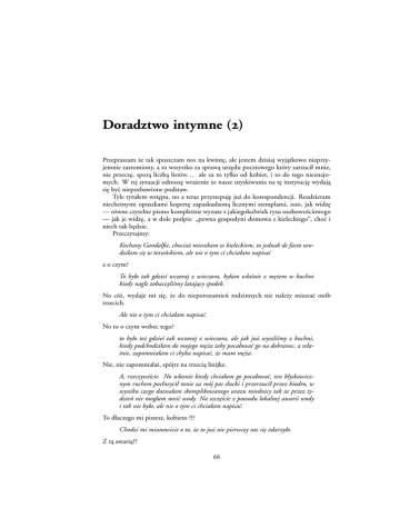 Doradztwo intymne () Przepraszam że tak spuszczam nos na kwint˛e, ale jestem dzisiaj wyjatkowo ˛ nieprzyjemnie zasromiony, a to wszystko za sprawa˛ urz˛edu pocztowego który zarzucił mnie, nie przecz˛e, spora˛ liczba˛ listów. . . ale za to tylko od kobiet, i to do tego nieznajomych. W tej sytuacji odnosz˛e wrażenie że nasze utyskiwania na t˛e instytucj˛e wydaja˛ si˛e być niepozbawione podstaw. Tyle tytułem wst˛epu, no a teraz przystepuj˛e już do korespondencji. Rozdzieram niechetnymi opuszkami kopert˛e zapaskudzona˛ licznymi stemplami, ooo, jak widz˛e — równe czytelne pismo kompletnie wyzute z jakiegokolwiek rysu osobowościowego — jak je widz˛e, a w dole podpis: „pewna gospodyni domowa z kieleckiego”, choć i niech tak b˛edzie. Przeczytajmy: Kochany Gandalfie, chociaż mieszkam w kieleckiem, to jednak de facto urodziłam si˛e w toruńskiem, ale nie o tym ci chciałam napisać a o czym? To było tak gdzieś wczoraj z wieczora, byłam właśnie z m˛eżem w kuchni kiedy nagle zobaczyliśmy latajacy ˛ spodek. No cóż, wydaje mi si˛e, że do nieporozumień rodzinnych nie należy mieszać osób trzecich. Ale nie o tym ci chciałam napisać. No to o czym wobec tego? to było też gdzieś tak wczoraj z wieczora, ale jak już wyszliśmy z kuchni, kiedy podchodziłam do mojego m˛eża żeby pocałować go na dobranoc, a właśnie, zapomniałam ci chyba napisać, że mam m˛eża. Nie, nie zapomniałaś, spójrz na trzecia˛ linijke. A, rzeczywiście. No własnie kiedy chciałam go pocałować, ten błyskawicznym ruchem pochwycił mnie za mój pas słucki i przerzucił przez biodro, w wyniku czego doznałam skomplikowanego urazu miednicy tak że przez tydzień nie mogłam nosić wody. Na szcz˛eście z powodu lokalnej awarii wody i tak nie było, ale nie o tym ci chciałam napisać. To dlaczego mi piszesz, kobieto ?!? Chodzi mi mianowicie o to, że to już nie pierwszy raz si˛e zdarzyło. Z ta˛ awaria?? ˛ Nie, z ta˛ miednica.˛ No wi˛ec, na czym w zasadzie polega twój problem, kobieto ?? W świetle tego co napisałam, chciałabym prosić o pozyczk˛e w wysokości tysi˛ecy złotych. Propozycja bardzo interesujaca. ˛ Ale, kochana gospodyni domowa z kieleckiego, po te pieniadze ˛ może by si˛e zgłosił twój małżonek, pami˛etaj z portmonetka˛ i bez pasa słuckiego. Twój Gandalf