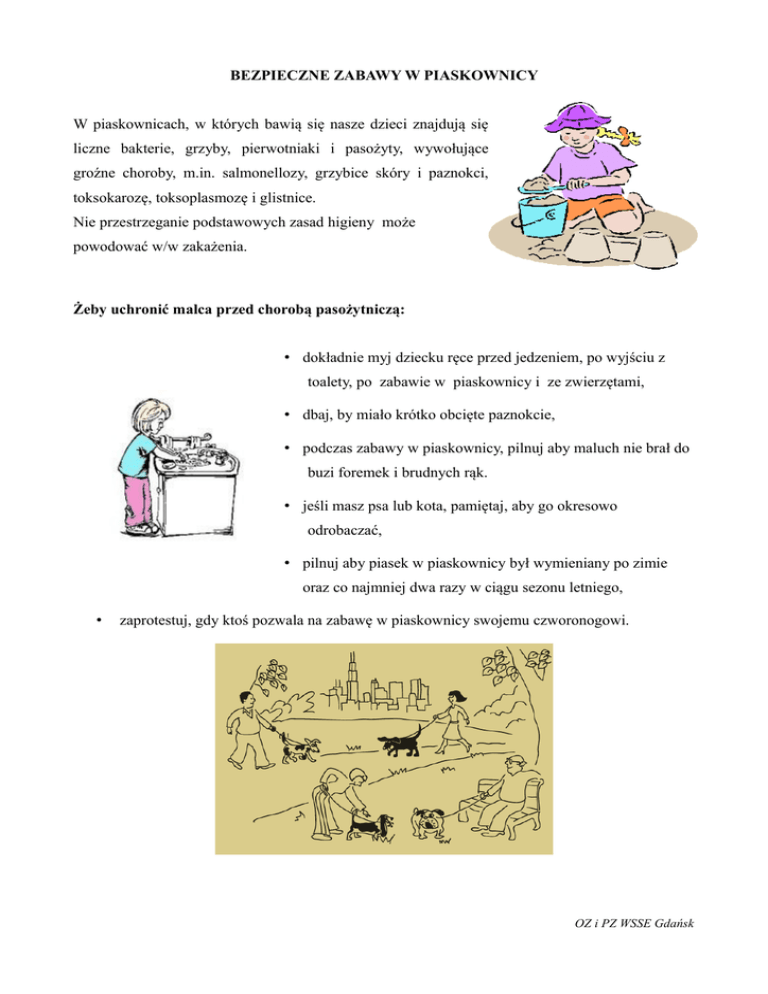 BEZPIECZNE ZABAWY W PIASKOWNICY W piaskownicach, w których bawią się nasze dzieci znajdują się liczne bakterie, grzyby, pierwotniaki i pasożyty, wywołujące groźne choroby, m.in. salmonellozy, grzybice skóry i paznokci, toksokarozę, toksoplasmozę i glistnice. Nie przestrzeganie podstawowych zasad higieny może powodować w/w zakażenia. Żeby uchronić malca przed chorobą pasożytniczą: • dokładnie myj dziecku ręce przed jedzeniem, po wyjściu z toalety, po zabawie w piaskownicy i ze zwierzętami, • dbaj, by miało krótko obcięte paznokcie, • podczas zabawy w piaskownicy, pilnuj aby maluch nie brał do buzi foremek i brudnych rąk. • jeśli masz psa lub kota, pamiętaj, aby go okresowo odrobaczać, • pilnuj aby piasek w piaskownicy był wymieniany po zimie oraz co najmniej dwa razy w ciągu sezonu letniego, • zaprotestuj, gdy ktoś pozwala na zabawę w piaskownicy swojemu czworonogowi. OZ i PZ WSSE Gdańsk