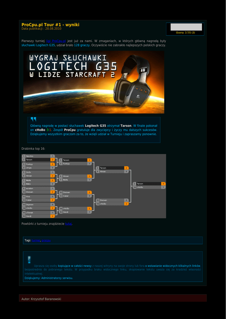 ProCpu.pl Tour #1 - wyniki Data publikacji : 28.08.2010 Ocena: 3.7/5 (3) Pierwszy turniej ligi ProCpu.pl jest już za nami. W zmaganiach, w których główną nagrodą były słuchawki Logitech G35, udział brało 128 graczy. Oczywiście nie zabrakło najlepszych polskich graczy. Główną nagrodę w postaci słuchawek Logitech G35 otrzymał Tarson. W finale pokonał on cHoBo 3:1. Zespół ProCpu gratuluje dla zwycięzcy i życzy mu dalszych sukcesów. Dziękujemy wszystkim graczom za to, że wzięli udział w Turnieju i zapraszamy ponownie. Drabinka top 16: Powtórki z turnieju znajdziecie tutaj. Tagi: turniej, procpu Uprasza się osoby kopiujące w całości newsy z naszej witryny na swoje strony lub fora o wstawianie widocznych klikalnych linków, bezpośrednio do pobranego tekstu. W przypadku braku widocznego linku, skopiowanie tekstu uważa się za kradzież własności intelektualnej. Dziękujemy: Administratorzy serwisu. Autor: Krzysztof Baranowski Data publikacji : 28.08.2010 Liczba wyświetleń tekstu: 3582 Komentarz (16) dodaj komentarz Chyba jakiś FAIL, na własne oczy widziałem, jak MaNa wklepał Himanowi pierwszą grę. Jak na moje tam było 2-1. Chyba.~vms 2010/08/28 23:36 Wszystko jest dobrze , MaNa wygrał pierwszą grę , a następne Himan, masz repy przecież : )~ProCpu.misq 2010/08/28 23:42 No ale tutaj właśnie na drabince pokazano, że Himan wklepał mu 2-0 a nie 2-1. ;( Nie zniosę tego, bo lubię MaNę!!!oneone~ vms 2010/08/28 23:45 Naprawde dobre gry polskich protosow,a wygral ten co zawsze :P~GonzO27 2010/08/29 00:10 Ciekawe czy pojawi się jakiś cast na Youtubie (;~Katan 2010/08/29 02:01 Rzeczywiście też oglądałem tą grę gdzie MaNa wygrał więc w drabince jest błąd powinno być 2:1 jak już vms powiedział (; Co do turnieju to był świetny znowu się wiele nauczyłem po przegranej w 3 rundzie z lepszym graczem ;) Tarson wiadome było że wygra no ale cóż zasłużył na to ponieważ jest niesamowicie dobry ;] gratulacje dla niego i czekamy na dalsze edycje tego turnieju ! ;)) pozdRo ;]~ImTiTaN 2010/08/29 07:37 @Katan: to wyślij repy do Husky'ego, albo kogoś. Same się nie pojawią.~AkodoRyu 2010/08/29 08:43 widzę, że Tarson to taki nasz Pudzian w świecie e-sportu :P :D W polsce nie do pokonania za granicą niedługo też pozamiata i będziemy mieli kolejnego miszcza do wychwalania :))~Rogal 2010/08/29 09:41 @ProCpu.misq Tak na przyszłość miśku to zróbcie jakąś lepszą jakość obrazu ze streama i jak Morgulum komentuje to niechże zrobi to do końca a jak on nie może bo coś mu wypada to myślę że może ci wcześniej o tym powiedzieć jak poszukać na TL to na pewno znajdzie się co-caster kto to dokończy bo bez sensu żeby cały turniej był na streamie a ścisłe finały już nie. Poza powyższym świetna robota~DarthRevan.269 2010/08/29 09:48 siemanko, ma ktoś jeszcze klucz do darmowego pogrania przez 7dni ?? to po proszę 362364~Ethan 2010/08/29 10:30 i wez tu startuj szary graczu w turnieju jak taka ligia jest :)~michalw1987 2010/08/29 11:08 Morglum mnie wczoraj zabral zabawki i poszedl w piz* tak sie nie robi swiadczy do nie za dobrze o PROCUPIe ktory organiazowal ten turnie ze nie zapewnil 2giego komentatora. ps.Morglum nice koment~Flyordie 2010/08/29 11:24 "Morglum mnie wczoraj zabral zabawki i poszedl w piz* tak sie nie robi swiadczy do nie za dobrze o PROCUPIe ktory organiazowal ten turnie ze nie zapewnil 2giego komentatora. ps.Morglum nice koment" ten komentarz i twoja liga też dobrze nie świadczy o twojej kulturze i dorosłości do wypowiadania, robili turniej pierwszy raz w serii i dopiero się uczą. Szacunek się im należy choćby za to że się zabrali za organizacje a to nie jest prosta sprawa skupić ~130 os w jednym miejscu i czasie ogarniając przy tym na bieżąco drabinkę~DarthRevan.269 2010/08/29 11:53 przeciez terran nei jest imba, wcale :)~mOx 2010/08/29 13:07 VMS sorry mój błąd przy przepisywaniu, zaraz poprawie~ElemenT Battlenet Network 2010/08/29 14:20 Wow, Tarson wygrał, szok xD btw. Nie da się "upiększyć" tak drabinkę, aby obok wyniku i nicku była też rasa (jakaś ikonka najlepiej)? Byłbym bardzo wdzięczny ;)~Reiz3N 2010/08/29 17:00 dodaj komentarz 08.10.2015 Kampania "Szepty o zagładzie" dostępna za darmo (0 komentarzy) 27.09.2015 Kolejni bohaterowie w trybie Sprzymierzonych Dowódców (0 komentarzy) 22.09.2015 Cyfrowe gadżety za udział w BlizzCon 2015 (0 komentarzy) 15.07.2015 Legacy of the Void dostępne w przedsprzedaży! (0 komentarzy) 17.06.2015 Informacje z E3 - prolog kampanii Legacy of the Void (0 komentarzy) 30.05.2015 WCS Europe - sobota (30 maja) 18.00 grupa G - MaNa! (0 komentarzy) 07.05.2015 DreamHack Open France 2015 - już 8 maja - MaNa! (0 komentarzy) 03.05.2015 Na wesoło: postacie E-sportu 50 (0 komentarzy) 03.05.2015 IEM Katowice 2015 - jeszcze raz! (0 komentarzy) 03.05.2015 KeSPA Cup 2015 Season 1 - live! (0 komentarzy) 26.04.2015 Proleague - Top5 gier miesiąca (0 komentarzy) 26.04.2015 CJ Entus wygrywa 2 runde Proleague! (0 komentarzy) 18.04.2015 Wersja beta Legacy of the Void – aktualizacja 2.5.1 (0 komentarzy) 18.04.2015 WCS finals 2015 - galeria (0 komentarzy) 18.04.2015 Omówienie zmian w balansie Legacy of the Void (0 komentarzy) 11.04.2015 WCS Europe kwalifikacje z Polakami - dziś (sobota) 18.00 (0 komentarzy) 11.04.2015 Aktualizacja balansu Heart of the Swarm – 9 kwietnia (0 komentarzy) 11.04.2015 GSL Season1 2015 - galeria (0 komentarzy) 11.04.2015 Zbanowane konta w StarCraft II (0 komentarzy) 04.04.2015 Red Bull Battle Grounds powraca jesienią 2015 (0 komentarzy) (zobacz wszystkie)