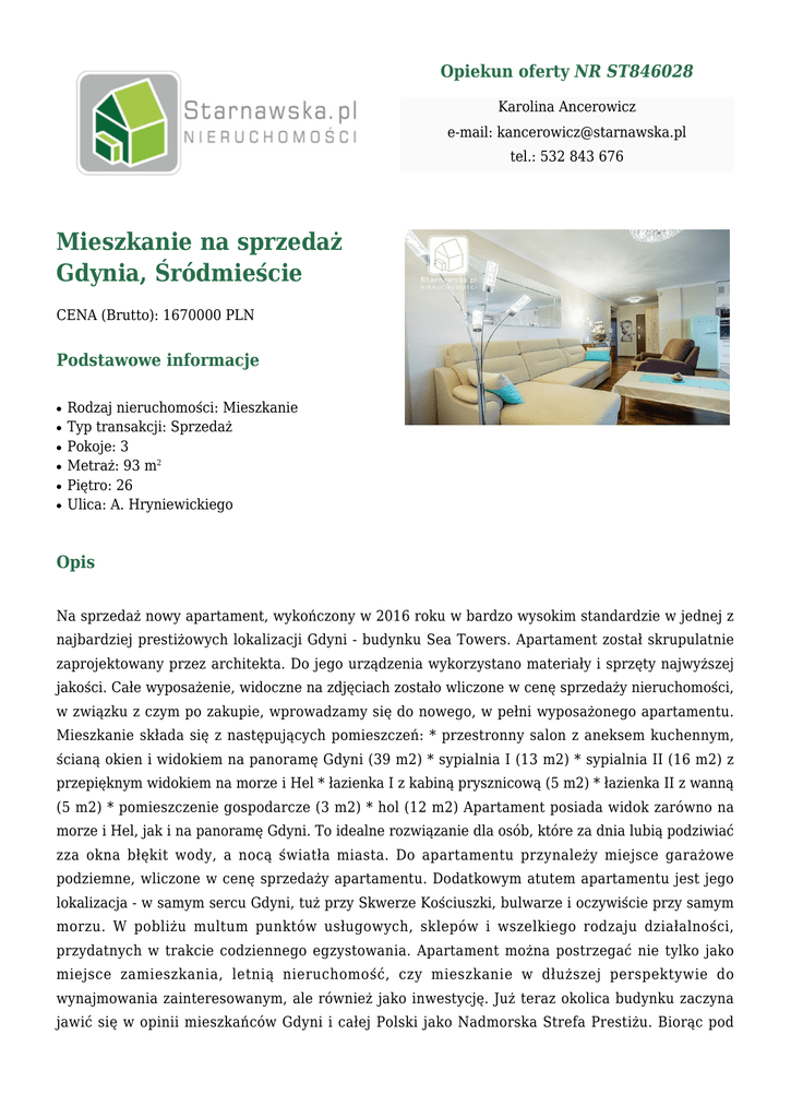 Opiekun oferty NR ST846028 Karolina Ancerowicz e-mail: [email protected] tel.: 532 843 676 Mieszkanie na sprzedaż Gdynia, Śródmieście CENA (Brutto): 1670000 PLN Podstawowe informacje ● ● ● ● ● ● Rodzaj nieruchomości: Mieszkanie Typ transakcji: Sprzedaż Pokoje: 3 Metraż: 93 m2 Piętro: 26 Ulica: A. Hryniewickiego Opis Na sprzedaż nowy apartament, wykończony w 2016 roku w bardzo wysokim standardzie w jednej z najbardziej prestiżowych lokalizacji Gdyni - budynku Sea Towers. Apartament został skrupulatnie zaprojektowany przez architekta. Do jego urządzenia wykorzystano materiały i sprzęty najwyższej jakości. Całe wyposażenie, widoczne na zdjęciach zostało wliczone w cenę sprzedaży nieruchomości, w związku z czym po zakupie, wprowadzamy się do nowego, w pełni wyposażonego apartamentu. Mieszkanie składa się z następujących pomieszczeń: * przestronny salon z aneksem kuchennym, ścianą okien i widokiem na panoramę Gdyni (39 m2) * sypialnia I (13 m2) * sypialnia II (16 m2) z przepięknym widokiem na morze i Hel * łazienka I z kabiną prysznicową (5 m2) * łazienka II z wanną (5 m2) * pomieszczenie gospodarcze (3 m2) * hol (12 m2) Apartament posiada widok zarówno na morze i Hel, jak i na panoramę Gdyni. To idealne rozwiązanie dla osób, które za dnia lubią podziwiać zza okna błękit wody, a nocą światła miasta. Do apartamentu przynależy miejsce garażowe podziemne, wliczone w cenę sprzedaży apartamentu. Dodatkowym atutem apartamentu jest jego lokalizacja - w samym sercu Gdyni, tuż przy Skwerze Kościuszki, bulwarze i oczywiście przy samym morzu. W pobliżu multum punktów usługowych, sklepów i wszelkiego rodzaju działalności, przydatnych w trakcie codziennego egzystowania. Apartament można postrzegać nie tylko jako miejsce zamieszkania, letnią nieruchomość, czy mieszkanie w dłuższej perspektywie do wynajmowania zainteresowanym, ale również jako inwestycję. Już teraz okolica budynku zaczyna jawić się w opinii mieszkańców Gdyni i całej Polski jako Nadmorska Strefa Prestiżu. Biorąc pod uwagę inwestycje w okolicy - zarówno te zaplanowane, jak i te, których budowa już się rozpoczęła, strefa ta będzie jedną z najbardziej pożądanych do zamieszkania. Nie zwlekaj - dołącz do niej już dziś! Zapraszam serdecznie na prezentację!