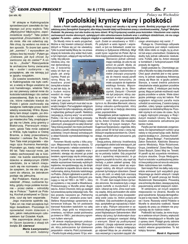 Nr 6 (179) czerwiec 2011 (ze str. 6) W sklepie w Kaliningradzie sprzedawczyni zawołała do będącego już przy wyjściu Taty „Mężczyzno! Mężczyzno, zapomnieliście reszty!”. Tata potem wspominał „Zrozumiałem, że to do mnie. Ale nie odwrócę się. Nie chcę, by wołano na mnie w ten sposób. To brzmi tak samo jak „samiec”. I wyszedłem ze sklepu bez tej reszty”. Pytam go „Ciekawe, jak byś chciał, by zwrócono się do ciebie?” A on na to… „Sudar”. Rzeczywiście te archaiczne formy zwracania się – sudar i sudarynia – są przepiękne, ale nie istnieją już w języku rosyjskim. Za czasów sowieckich, kiedy w Kaliningradzie nie było cerkwi, a wiarę w Boga uważano za coś haniebnego, właśnie Tata po raz pierwszy zabrał mnie do kościoła katolickiego i do cerkwi prawosławnej. Było to w mieście, które należało kiedyś do Polski i gdzie zachowały się świątynie nietknięte przez reżim władzy sowieckiej. Wilno. Bywaliśmy tam dosyć często, po drodze do Hoduciszek – rodzinnego miasteczka Taty, znajdującego się na Litwie, przy granicy z Białorusią. Pierwszym miejscem, gdzie Tata mnie zabierał w Wilnie, była kaplica w Ostrej Bramie, a dalej prawosławny klasztor i cerkiew Św. Ducha. Tam Tata miał przyjaciela – starego ojca ihumena Awramija. Poznałam go, kiedy miał około 90 lat. Tata nauczył mnie, jak należy zachowywać się w kościele: nie każde siedmioletnie dziecko w ateistycznym ZSRR wiedziało, że w takich miejscach się nie rozmawia – chyba że szeptem, że nie stoi się plecami do ołtarza, że żebrakom podaje się jałmużnę. Był Polakiem. Kiedyś mi powiedział: „Wiesz, cudownie byłoby, gdyby moje polskie korzenie – przez ciebie – odrodziły się w Polsce.” Tęsknił za Polską. Kochał przebywać w Ojczyźnie, czuł się tam wspaniale. Jego marzenie spełniło się. Tylko on nie miał szczęścia być tego świadkiem. Pozostaje mi opowiadać moim dzieciom o tym, jakim nietuzinkowym człowiekiem był Dziadek Kazik. Nie zapomnijcie złożyć swoim Ojcom życzenia z okazji ich święta 23 czerwca! Maria Ławrynowicz fot. arch. rodzinny Str. 7 Polacy na Wschodzie W podolskiej krynicy wiary i polskości Goście z Polski rzadko przyjeżdżają do Murafy, leżącej nad rzeczką o tej samej nazwie. Bardziej przyciąga ich pobliski założony przez Zamojskich Szarogród, albo leżący kawałek dalej nad Dniestrem znany z sienkiewiczowskiej „Trylogii” Mohylew Podolski. Na pierwszy rzut oka trudno się temu dziwić. W tej 8-tysięcznej osadzie poza kościołem i klasztorem oraz częścią zachowanych murów obronnych, oplatających obie odrestaurowane budowle wraz z urokliwym dziedzińcem, nie ma czego oglądać. Po zamku – pałacu stojącym niegdyś w sąsiedztwie świątyni pozostały tylko piwnice. Do Murafy mimo to warto przyjechać. nych. Został on aresztowany w 1930 r. Można w niej bowiem zobaczyć obrazki, Po pobytach w wielu łagrach i więziektórych w Polsce się już nie uświadczy. niach, w tym na Sołowkach, został rozTylko tu przed każdą Mszą św. na prowa- strzelany w Syktywarze k/Workuty. Mógł dzącej do kościoła ulicy widać tłum ludzi, ocalić życie i wyjechać do Polski. Był na w tym mężczyzn, udających się na Eucha- liście księży przewidzianych do wymiany. rystię. Idą całą szeStanowczo jednak odmówił, Kościół w Murafie rokością ulicy, niemając nadzieję, że uda mu się mal demonstracyjwrócić do parafii. Myślę, że nie. Z kościelnej ofiara życia tego męczennika, wieży ich tłum wya także jego orędownictwo w gląda jak pielgniebie znacząco przyczyniły rzymka. Przed posię do trwania naszej parafii ranną Mszą św. w czasach komunizmu, że kwadrans przed miała szczęście do kapłanów ósmą tłok w kościewielkiego formatu. Wspomle jest tak duży, że nieć tu trzeba, że ks. Stronz trudem można czyński, Darzycki i Chomicki wsadzić do niego nie byli jedynymi, którzy zaznogę. Na sumie naczyli w nim swoją obecścisk jest jeszcze ność. Moim poprzednikiem większy. Część wiernych musi stać na ze- był m.in. ks. Bronisław Biernacki, obecny wnątrz świątyni. Pod względem religijnym biskup odessko-symferopolski, który Murafa jest nie tylko największą, ale jedną godnie wpisał się w tradycję stworzoną z najbardziej gorliwych parafii. Niektórzy przez poprzedników. nazywają ją „krynicą wiary” na winnickim Niewątpliwie jednak kapłanem, który Podolu i nie ma w tym żadnej przesady. na Murafie odcisnął największe piętno Z parafii tej wyszło ponad 50 księży i sióstr był ks. Antoni Chomicki. Dla mieszkańzakonnych, pracujących na całej Ukrainie! ców Murafy był żywym świętym. Pan Taką ilością powołań nie może pochwalić Eugeniusz Szwarcewicz, organista, który się żadna z parafii z diecezji kamieniecko- przez ponad 30 lat był wraz z żoną najpodolskiej i innych diecezji wchodzących bliższym współpracownikiem ks. Chomiw skład Kościoła rzymskokatolickiego na ckiego, nie potrafi ukryć wzruszenia, gdy Ukrainie. go wspomina. Fenomen Murafy wynika z kilku przy- - Swoją pokorą, dobrocią i troskliwością czyn. Miejscowość ta leży na uboczu, 12 przyciągał do siebie ludzi wierzących, jak km od Szarogrodu i władze sowieckie to- i niewierzących - wspomina. - Wszyscy lerowały istnienie tego zagłębia wiary i go szanowali i kochali. Był bardzo wrażlipolskości, starając się ukrywać go przed wy na potrzeby ludzkie. Gdy przyjechał światem, ograniczając się do zmiany jego ktoś z sąsiedniej miejscowości, to go nazwy. Do parafii tej na swoiste zesłanie najpierw posyłał do kuchni, aby napił się władze wyznaniowe kierowały wybitnych herbaty, a potem załatwił sprawę. Gdy kapłanów, nie spodziewając się, że dzięki chrzcił dzieci, zawsze starał się wspoich posłudze ta zapadła dziura stanie się magać rodziny, dla których ochrzczony nieformalną stolicą Kościoła 