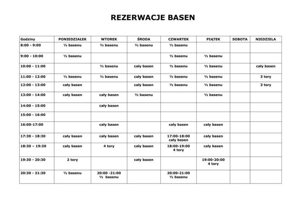 REZERWACJE BASEN Godziny PONIEDZIAŁEK WTOREK ŚRODA CZWARTEK 8:00 - 9:00 ½ basenu ½ basenu ½ basenu ½ basenu 9:00 - 10:00 ½ basenu 10:00 - 11:00 11:00 - 12:00 ½ basenu 12:00 - 13:00 cały basen 13:00 - 14:00 cały basen 14:00 - 15:00 PIĄTEK ½ basenu ½ basenu NIEDZIELA ½ basenu cały basen ½ basenu ½ basenu cały basen ½ basenu cały basen ½ basenu ½ basenu 3 tory cały basen ½ basenu ½ basenu 3 tory cały basen ½ basenu ½ basenu cały basen 15:00 - 16:00 16:00-17:00 SOBOTA cały basen cały basen cały basen 17:30 - 18:30 cały basen cały basen cały basen 17:00-18:00 cały basen cały basen 18:30 – 19:30 cały basen 4 tory cały basen 18:00-19:00 4 tory cały basen 19:30 - 20:30 2 tory 20:30 - 21:30 ½ basenu cały basen 20:00 -21:00 ½ basenu 19:00-20:00 4 tory 20:00-21:00 ½ basenu