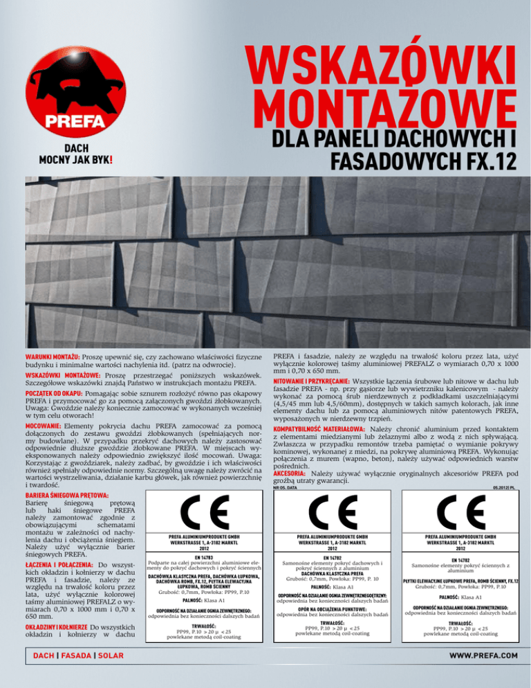 WSKAZÓWKI MONTAŻOWE DLA PANELI DACHOWYCH I FASADOWYCH FX.12 WARUNKI MONTAŻU: Proszę upewnić się, czy zachowano właściwości fizyczne budynku i minimalne wartości nachylenia itd. (patrz na odwrocie). WSKAZÓWKI MONTAŻOWE: Proszę przestrzegać poniższych wskazówek. Szczegółowe wskazówki znajdą Państwo w instrukcjach montażu PREFA. POCZĄTEK OD OKAPU: Pomagając sobie sznurem rozłożyć równo pas okapowy PREFA i przymocować go za pomocą załączonych gwoździ żłobkowanych. Uwaga: Gwoździe należy koniecznie zamocować w wykonanych wcześniej w tym celu otworach! MOCOWANIE: Elementy pokrycia dachu PREFA zamocować za pomocą dołączonych do zestawu gwoździ żłobkowanych (spełniających normy budowlane). W przypadku przekryć dachowych należy zastosować odpowiednie dłuższe gwoździe żłobkowane PREFA. W miejscach wyeksponowanych należy odpowiednio zwiększyć ilość mocowań. Uwaga: Korzystając z gwoździarek, należy zadbać, by gwoździe i ich właściwości również spełniały odpowiednie normy. Szczególną uwagę należy zwrócić na wartości wystrzeliwania, działanie karbu główek, jak również powierzchnię i twardość. BARIERA ŚNIEGOWA PRĘTOWA: Barierę śniegową prętową lub haki śniegowe PREFA należy zamontować zgodnie z obowiązującymi schematami montażu w zależności od nachylenia dachu i obciążenia śniegiem. Należy użyć wyłącznie barier śniegowych PREFA. ŁĄCZENIA I POŁĄCZENIA: Do wszystkich okładzin i kołnierzy w dachu PREFA i fasadzie, należy ze względu na trwałość koloru przez lata, użyć wyłącznie kolorowej taśmy aluminiowej PREFALZ o wymiarach 0,70 x 1000 mm i 0,70 x 650 mm. OKŁADZINY I KOŁNIERZE Do wszystkich okładzin i kołnierzy w dachu Dach | fasada | solar PREFA i fasadzie, należy ze względu na trwałość koloru przez lata, użyć wyłącznie kolorowej taśmy aluminiowej PREFALZ o wymiarach 0,70 x 1000 mm i 0,70 x 650 mm. NITOWANIE I PRZYKRĘCANIE: Wszystkie łączenia śrubowe lub nitowe w dachu lub fasadzie PREFA - np. przy gąsiorze lub wywietrzniku kalenicowym - należy wykonać za pomocą śrub nierdzewnych z podkładkami uszczelniającymi (4,5/45 mm lub 4,5/60mm), dostępnych w takich samych kolorach, jak inne elementy dachu lub za pomocą aluminiowych nitów patentowych PREFA, wyposażonych w nierdzewny trzpień. KOMPATYBILNOŚĆ MATERIAŁOWA: Należy chronić aluminium przed kontaktem z elementami miedzianymi lub żelaznymi albo z wodą z nich spływającą. Zwłaszcza w przypadku remontów trzeba pamiętać o wymianie pokrywy kominowej, wykonanej z miedzi, na pokrywę aluminiową PREFA. Wykonując połączenia z murem (wapno, beton), należy używać odpowiednich warstw pośrednich. AKCESORIA: Należy używać wyłącznie oryginalnych akcesoriów PREFA pod groźbą utraty gwarancji. 05.2012| PL NR OS. DATA PREFA Aluminiumprodukte GmbH WerkstraSSe 1, A-3182 Marktl 2012 PREFA Aluminiumprodukte GmbH WerkstraSSe 1, A-3182 Marktl 2012 PREFA Aluminiumprodukte GmbH WerkstraSSe 1, A-3182 Marktl 2012 EN 14783 Podparte na całej powierzchni aluminiowe elementy do pokryć dachowych i pokryć ściennych EN 14782 Samonośne elementy pokryć dachowych i pokryć ściennych z aluminium DACHÓWKA KLASYCZNA PREFA Grubość: 0,7mm, Powłoka: PP99, P. 10 EN 14782 Samonośne elementy pokryć ściennych z aluminium DACHÓWKA KLASYCZNA PREFA, DACHÓWKA ŁUPKOWA, DACHÓWKA ROMB, FX.12, PŁYTKA ELEWACYJNA ŁUPKOWA, ROMB ŚCIENNY Grubość: 0,7mm, Powłoka: PP99, P.10 PALNOŚĆ: Klasa A1 PŁYTKI ELEWACYJNE ŁUPKOWE PREFA, ROMB ŚCIENNY, FX.12 Grubość: 0,7mm, Powłoka: PP99, P.10 PALNOŚĆ: Klasa A1 ODPORNOŚĆ NA DZIAŁANIE OGNIA ZEWNĘTRZNEGOĘTRZNY: odpowiednia bez konieczności dalszych badań ODPORNOŚĆ NA DZIAŁANIE OGNIA ZEWNĘTRZNEGO: odpowiednia bez konieczności dalszych badań OPÓR NA OBCIĄŻENIA PUNKTOWE: odpowiednia bez konieczności dalszych badań ODPORNOŚĆ NA DZIAŁANIE OGNIA ZEWNĘTRZNEGO: odpowiednia bez konieczności dalszych badań TRWAŁOŚĆ: PP99, P.10 >20 µ <25 powlekane metodą coil-coating TRWAŁOŚĆ: PP99, P.10 >20 µ <25 powlekane metodą coil-coating TRWAŁOŚĆ: PP99, P.10 >20 µ <25 powlekane metodą coil-coating PALNOŚĆ: Klasa A1 www.prefa.com Dach: Pełne deskowanie (min. 24) z warstwą rozdzielającą Fasada: łacenie / pełne deskowanie (min. 24 mm), do wyboru z warstwą rozdzielającą Dach: Pełne deskowanie (min. 24) z warstwą rozdzielającą Fasada: łacenie / pełne deskowanie (min. 24 mm), do wyboru z warstwą rozdzielającą od 17° = ok. 29% od 17° = ok. 31% 1800 x 158 mm 1800 x 158 mm od prawej, dolnej strony (patrz. rys. 1 - wzór montażu) od prawej, dolnej strony (patrz. rys. 1 - wzór montażu) 1400 x 420 mm 700 x 420 mm WIELKOŚĆ ELEMENTU NA M2 1 szt. = 0,588 m² (ułożonej powierzchni) 1 szt. = 0,294 m² (ułożonej powierzchni) PODSTAWOWE MOCOWANIE Gwoździe: 5 szt. gwoździ żłobkowanych PREFA (28/25) Gwoździe: 3 szt. gwoździ żłobkowanych PREFA (28/25) PODKONSTRUKCJA MINIMALNE NACHYLENIE PAS OKAPOWY KIERUNEK UŁOŻENIA WIELKOŚĆ WSKAZÓWKI MONTAŻOWE (dotyczące montażu dużych i małych paneli) 2 kształty do zwykłego przesunięcia styku. Aby uzyskać indywidualny charakter na całym obszarze montażu żaden rąbek kątowy (rąbek pionowy) nie powinien znaleźć się bezpośrednio nad innym. W przypadku montażu FX.12 jako pokrycia dachu należy wykonać przesunięcie o minimum 220 mm. Ułożenie od prawej do lewej. WZÓR MONTAŻU - WAR. 1: Stosunek dużych i małych paneli FX.12 wynosi 2:1 W przypadku stosunku 2:1 udział powierzchni małych paneli FX.12 wynosi 20% Podczas prac należy przestrzegać instrukcji montażu PREFA oraz typowych norm i przepisów bezpieczeństwa. Szczegółowe instrukcje montażu z dokładnymi informacjami, cenniki wraz z programem akcesoriów, karty techniczne, wideo montażowe itd. można uzyskać bezpośrednio w firmie PREFA lub u właściwego doradcy PREFA. Rys.1