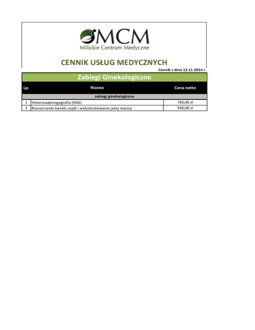 Cennik z dnia 12.11.2014 r. Zabiegi Ginekologiczne Lp. Nazwa Cena netto zabiegi ginekologiczne 1 Histerosalpinogografia (HSG) 2 Rozszerzenie kanału szyjki i wyłyżeczkowanie jamy macicy 700,00 zł 950,00 zł