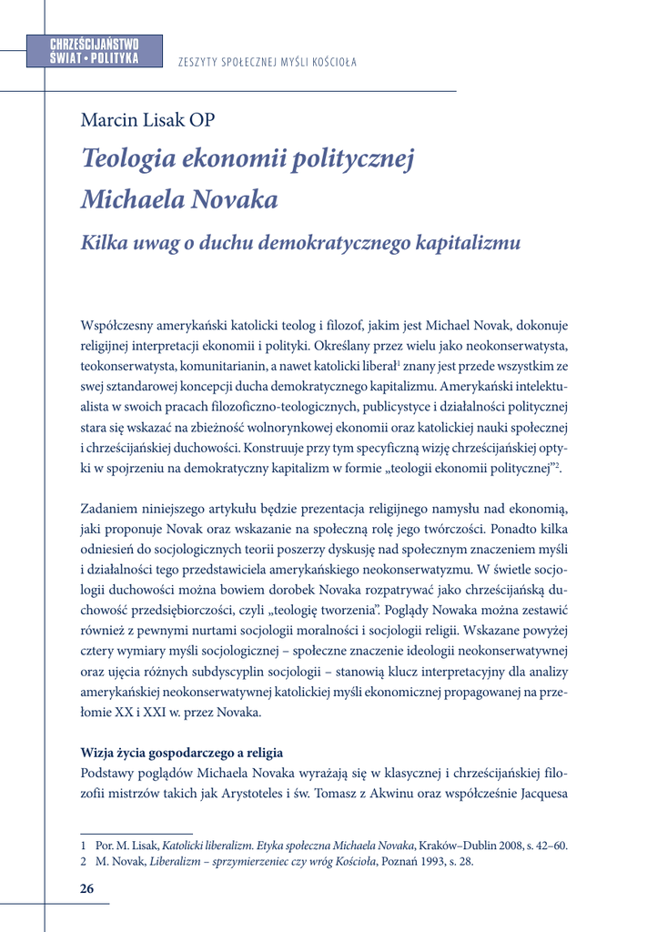 CHRZEÂCIJA¡STWO ÂWIAT•POLITYKA ZESZ Y T Y S P O ŁEC Z NEJ MYŚ L I KO Ś C IO ŁA Marcin Lisak OP Teologia ekonomii politycznej Michaela Novaka Kilka uwag o duchu demokratycznego kapitalizmu Współczesny amerykański katolicki teolog i filozof, jakim jest Michael Novak, dokonuje religijnej interpretacji ekonomii i polityki. Określany przez wielu jako neokonserwatysta, teokonserwatysta, komunitarianin, a nawet katolicki liberał1 znany jest przede wszystkim ze swej sztandarowej koncepcji ducha demokratycznego kapitalizmu. Amerykański intelektualista w swoich pracach filozoficzno-teologicznych, publicystyce i działalności politycznej stara się wskazać na zbieżność wolnorynkowej ekonomii oraz katolickiej nauki społecznej i chrześcijańskiej duchowości. Konstruuje przy tym specyficzną wizję chrześcijańskiej optyki w spojrzeniu na demokratyczny kapitalizm w formie „teologii ekonomii politycznej”2. Zadaniem niniejszego artykułu będzie prezentacja religijnego namysłu nad ekonomią, jaki proponuje Novak oraz wskazanie na społeczną rolę jego twórczości. Ponadto kilka odniesień do socjologicznych teorii poszerzy dyskusję nad społecznym znaczeniem myśli i działalności tego przedstawiciela amerykańskiego neokonserwatyzmu. W świetle socjologii duchowości można bowiem dorobek Novaka rozpatrywać jako chrześcijańską duchowość przedsiębiorczości, czyli „teologię tworzenia”. Poglądy Nowaka można zestawić również z pewnymi nurtami socjologii moralności i socjologii religii. Wskazane powyżej cztery wymiary myśli socjologicznej – społeczne znaczenie ideologii neokonserwatywnej oraz ujęcia różnych subdyscyplin socjologii – stanowią klucz interpretacyjny dla analizy amerykańskiej neokonserwatywnej katolickiej myśli ekonomicznej propagowanej na przełomie XX i XXI w. przez Novaka. Wizja życia gospodarczego a religia Podstawy poglądów Michaela Novaka wyrażają się w klasycznej i chrześcijańskiej filozofii mistrzów takich jak Arystoteles i św. Tomasz z Akwinu oraz współcześnie Jacquesa 1 Por. M. Lisak, Katolicki liberalizm. Etyka społeczna Michaela Novaka, Kraków–Dublin 2008, s. 42–60. 2 M. Novak, Liberalizm – sprzymierzeniec czy wróg Kościoła, Poznań 1993, s. 28. 26 CHRZEÂCIJA¡STWO Z ES Z Y T Y S P O ŁEC Z NEJ MYŚLI KO ŚC I O Ł A ÂWIAT•POLITYKA Maritaina3. W zakresie filozofii politycznej Novak analizuje i rozwija współczesne ideologie liberalizmu oraz komunitaryzmu4, aby podjąć próbę syntezy z koncepcjami społecznymi katolicyzmu. Twórczość intelektualna Novaka i jego działalność polityczna nie ograniczają się jednak do wymiaru teoretycznego. Nasz autor odnosi się w analizie i interpretacji teologiczno-filozoficznej do empirycznie poznawalnej rzeczywistości społecznej, pretendując do tworzenia realistycznej religijnej interpretacji sfery życia gospodarczego i „dojrzałej etyki wytwarzania bogactwa”5. Analiza amerykańskiego sukcesu społeczno-ekonomicznego prowadzi Novaka do próby wypracowania teologii ekonomii i powiązanej z nią polityki. Amerykański autor czyni to w rozbudowanej i nowatorskiej formie w swoim najbardziej znanym traktacie Duch demokratycznego kapitalizmu (1982). W sferze gospodarczej opowiada się zatem za ekonomią wolnorynkową, własnością prywatną, podkreśla pozytywną rolę zysku, a jako zasadę podstawową uznaje kierowanie się interesem własnym, który w swej naturze nie jest formą hobbesowskiej „wojny wszystkich ze wszystkim”, ale czynnikiem spontanicznie prowadzącym do współpracy6. Novak wprowadza pojęcie „teologia ekonomii” (theology of economics). Wzywa do stworzenia poważnej i systematycznej refleksji teologicznej o historii i podstawach ekonomii w świetle inspiracji i moralnych zobowiązań nakładanych przez religię chrześcijańską7. Teologii ekonomii poświęca całą trzecią cześć swojego opus magnum. Właściwie jednak zadanie, które sobie stawia, powinno być teologicznym ujęciem konkretnej rzeczywistości społecznej jaką jest działalność gospodarcza, a nie jedną z tak zwanych Genetiv-Theologie czyli teologią ekonomii rozumianej jako nauka o gospodarce. W innym miejscu Novak używa koncepcji „teologia ekonomii politycznej”, wskazując jako pole znaczeniowe na dyscyplinę teologiczną, odnoszącą się do spraw gospodarczych8. Czym jest zatem nowa teologia społeczna? Zdaniem Nowaka, na przełomie XX i XXI w. najważniejszym zadaniem chrześcijaństwa, a w szczególności katolicyzmu, jest wypracowanie 3 M . Novak, Duch demokratycznego kapitalizmu, Poznań 2001, s. 32–39; D. Góra-Szopiński, Zakorzenianie wolności. Myśl polityczna Michaela Novaka, Warszawa 2013, s. 128–140. 4 Por. P. Skudrzyk, Amerykańska wspólnotowa filozofia polityczna, Katowice 2001, s. 92–98, 109. 5 M. Novak, Bogactwo i cnota: rozwój chrześcijańskiej doktryny ekonomicznej [w:] P. Berger (red.), Etyka kapitalizmu, Kraków 1994, s. 103. 6 Szerzej na temat rozumienia sfery gospodarczej w demokratycznym kapitalizmie: M. Lisak, Katolicki liberalizm…, dz. cyt., s. 105–127. 7 Por. M. Novak, Duch demokratycznego…, dz. cyt., s. 277. 8 Por. tenże, Liberalizm…, dz. cyt., s. 28 i 44–45. 27 CHRZEÂCIJA¡STWO ÂWIAT•POLITYKA ZESZ Y T Y S P O ŁEC Z NEJ MYŚ L I KO Ś C IO ŁA intelektualnej propozycji adekwatnej do potrzeb ludzi żyjących w demokratycznym i kapitalistycznym społeczeństwie. Potrzeba zatem nie tylko pewnego wysiłku intelektualnego, ale również nowej formy duchowości chrześcijańskiej, która będzie afirmować wiele procesów ekonomicznych, politycznych i kulturowych. Charakterystycznymi cechami nowej religijności powinny być, jak podkreśla Novak, konkurencyjność i pluralizm w zakresie sposobów życia, różnorodność w zakresie praktycznej realizacji wybranych koncepcji życia oraz kluczowe doświadczenie wolności9. W sferze życia publicznego wolność to przede wszystkim powstrzymanie si