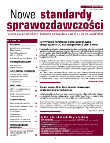 1–15 grudnia 2014 Nowe standardy sprawozdawczości issn 1895-2844 Rzetelne księgi rachunkowe i bezbłędne sprawozdania zgodne z UOR oraz MSR/MSSF w numerze Ile wyniesie minimalna suma gwarancyjna ubezpieczenia OC dla księgowych w 2015 roku AKTUALNOŚCI Minimalna suma ubezpieczenia OC dla księgowych 1 Rada MSR zmodyfikowała MSR 16 i MSR 38 2 Coraz więcej firm stosuje faktoring 1–4 SPRAWOZDANIA FINANSOWE Rozliczanie różnic inwentaryzacyjnych 6 ZAPASY, REZERWY, ZOBOWIĄZANIA Tworzenie rezerw i rozliczeń międzyokresowych biernych 7 Rozliczanie kosztów na przełomie roku 8 ŚRODKI TRWAŁE MSR 37: wartość początkowa aktywów trwałych 10 Sposób rozliczenia wycofanego z eksploatacji aktywa 11 EKSPERT ODPOWIADA Przedsiębiorcy zajmujący się prowadzeniem ksiąg rachunkowych mają obowiązek wykupienia ubezpieczenia od odpowiedzialności cywilnej. To jeden z warunków, aby prowadzić taką działalność. Minister finansów określił właśnie szczegółowy zakres obowiązkowego ubezpieczenia OC z zakresu usługowego prowadzenia ksiąg rachunkowych. Każdy przedsiębiorca odpowiada za szkody wynikające z niewykonania lub nienależytego wykonania zobowiązania, chyba że to niewykonanie lub nienależyte wykonanie jest następstwem okoliczności, za które ten przedsiębiorca nie ponosi odpowiedzialności. Odpowiedzialność ta ma charakter nieograniczony, a naprawienie szkody obejmuje straty, które poszkodowany poniósł, oraz korzyści, które mógłby osiągnąć, gdyby mu szkody nie wyrządzono. Ten szeroki zakres odpowiedzialności powoduje, że na niektórych przedsiębiorców nałożono obowiązek ubezpieczenia odpowiedzialności cywilnej za szkody wyrządzone w związku z prowadzoną działalnością. Takim obowiązkiem na mocy art. 76h ustawy o rachunkowości są objęci przedsiębiorcy prowadzący usługowo księgi rachunkowe. ciąg dalszy na stronie 2 Coraz więcej firm jest zainteresowanych zastosowaniem faktoringu Jeśli przedsiębiorca chce, by w jego imieniu należności od kontrahentów ściągała zewnętrzna instytucja, może podpisać umowę faktoringu. Polega on na sprzedaży wierzytelności za ustaloną cenę poniżej jej wartości nominalnej. Umowę faktoringu wyklucza zastrzeżenie dłużnika, że wierzytelność nie może być zbywana osobie trzeciej. Zawiera ją dostawca towarów lub usług (faktorant) oraz nabywca (faktor). Faktor (bank lub firma faktoringowa) nabywa krótkoterminowe wierzytelności, faktorant natomiast otrzymuje z tego tytułu odpowiednią zapłatę. Odpisy aktualizujące należności 12 Wynagrodzenia z grudniowych zleceń 13 Nakłady na dostosowanie do użytkowania 13 Udzielone rabaty zmniejszą przychód 13 Do wartości początkowej auta należy doliczyć koszty rejestracji Tylko dla stałych Czytelników 14 BEZPŁATNY E-BOOK zawierający porównanie regulacji UoR i MSR/MSSF do pobrania w zakładce „Twój e-book” na www.emsr.pl PORÓWNANIE REGULACJI UOR I MSR/MSSF Ustawa o rachunkowości i MSR 21, MSR 23, MSR 24, MSR 16 oraz MSR 17 15 ciąg dalszy na stronie 3 RAZ W MIESIĄCU możliwość pobrania bezpłatnego e-booka o tematyce podatkowo-rachunkowej E-LETTER „E-doradca podatki i rachunkowość” BEZPŁATNE ELEKTRONICZNE ARCHIWUM czasopisma na stronie www.emsr.pl MOŻLIWOŚĆ ZADAWANIA PYTAŃ EKSPERTOM za pośrednictwem redakcji [email protected] TELEFONICZNY DYŻUR EKSPERTA z zakresu podatków i rachunkowości w każdą środę 1 Aktualności Ile wyniesie minimalna suma gwarancyjna ubezpieczenia OC dla księgowych w 2015 roku W skrócie Doprecyzowano stosowanie metod amortyzacji Rada MSR zdecydowała się na modyfikację MSR 16 i MSR 38, która wprowadza jednoznaczny zakaz amortyzowania rzeczowych aktywów trwałych w oparciu o przychody. Amortyzacja powinna odzwierciedlać oczekiwany sposób konsumpcji przyszłych korzyści ekonomicznych generowanych przez dany składnik aktywów. Zmodyfikowany MSR 16 zabrania stosowania metody amortyzacji w oparciu o przychody w odniesieniu do rzeczowych aktywów trwałych. Zmodyfikowany MSR 38 wprowadza założenie, że przychody nie stanowią odpowiedniej podstawy amortyzacji składnika aktywów niematerialnych. Założenie to można odrzucić tylko w dwóch przypadkach: yy składnik aktywów niematerialnych przedstawiony jest jako miernik przychodów oraz yy przychody z danego składnika aktywów niematerialnych są silnie skorelowane z konsumpcją korzyści ekonomicznych zawartych w tych aktywach. Wprowadzono wytyczne, które precyzują, że prognozowany przyszły spadek cen sprzedaży może być wskaźnikiem spadku wartości przyszłych korzyści ekonomicznych, zawartych w danym składniku aktywów. Proponowane zmiany mają zastosowanie prospektywne i dotyczą okresów rocznych rozpoczynających się 1 stycznia 2016 roku lub później, z możliwością wcześniejszego zastosowania. Źródło opracowania: Poprawki do MSR 16 „Rzeczowe aktywa trwałe” oraz MSR 36 „Utrata wartości aktywów”. Szanowny Czytelniku Przygotowanie spotkania świątecznego dla osób zatrudnionych ma na celu zintegrowanie pracowników z firmą i wzrost motywacji w zakresie wykonywania obowiązków, a tym samym lepszej efektywności powierzonych zadań. ciąg dalszy ze strony 1 Deregulacja zawodu księgowego spowodowała, że krąg osób uprawnionych do wykonywania działalności w zakresie prowadzenia ksiąg rachunkowych znacznie się rozszerzył. Konsekwencją tych zmian jest ogłoszenie obowiązkowego ubezpieczenia odpowiedzialności cywilnej przedsiębiorców wykonujących działalność z zakresu usługowego prowadzenia ksiąg rachunkowych. Niewielki wpływ na działalność biur W porównaniu do obecnie obowiązujących przepisów zmianie uległy zapisy § 1 rozporządzenia. Znowelizowane rozporządzenie nie będzie dotyczyło przedsiębiorców wykonujących działalność w zakresie doradztwa podatkowego. W konsekwencji § 4 rozporządzenia dotyczący minimalnych sum gwarancyjnych nie odnosi się