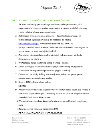Stajnia Kruki REGULAMIN ZAWODÓW PUCHAR KRUKÓW 2014 1. W zawodach mogą uczestniczyć zarówno osoby pełnoletnie jak i niepełnoletnie z tym, że osoby niepełnoletnie muszą posiadać pisemną zgodą rodzica lub prawnego opiekuna. 2. Zgłoszenia przyjmowane są mailowo – [email protected] na formularzach zgłoszeniowych ( do pobrania na stronie www.stajniakruki.pl) lub telefonicznie +48 535 060 531 3. Każdy zawodnik musi posiadać zaświadczenie lekarskie zezwalające na uczestnictwo w zawodach jeździeckich. . 4. Zawodnicy nie posiadający odpowiednich dokumentów, nie będą dopuszczeni do startów 5. W Pucharze mogą startować konie 4-letnie i starsze. 6. Konie startujące w zawodach muszą legitymować się paszportem z aktualnymi szczepieniami przeciwko grypie końskiej. 7. Ostateczne zamknięcie listy startowej następuje dzień przed przed planowanym początkiem zawodów. 8. Start w FINALE jest obowiązkowy. STRÓJ 9. Wszyscy zawodnicy muszą startować w atestowanym kasku lub toczku z zapięciem trzypunktowym. Zaleca się też dla wszystkich niepełnoletnich zawodników kamizelki ochronne. 10. Wszystkich uczestników konkursów obowiązuje schludny i bezpieczny strój. 11. Rząd i ogłowie zgodne z przepisami PZJ. PUNKTACJA/ZASADY RYWALIZACJI Stajnia Kruki Mariusz Szęszoł Kruki, 05-320 Mrozy Mobile +48 502 196 934 +48 504 382 109 E-mail [email protected] www.stajniakruki.pl Stajnia Kruki 12. Puchar Kruków rozgrywany będzie w formie dwuboju jeździeckiego – ujeżdżenie i skoki przez przeszkody - podzielonego na dwie kategorie: Małą i Dużą. 13. Dwubój obejmuje przejazdy czworobokowe ( programy na poszczególne rozgrywki do pobrania) oraz przejazdy parkourowe - w kategorii Małej do 30 cm w kategorii Dużej do 60 cm. 14. Zawodnik może startować tylko w jednej kategorii (MAŁEJ lub DUŻEJ), zadeklarowanej przy zgłoszeniu na pierwszych zawodach, w których będzie uczestniczył 15. Zawodnik może starować na dwóch koniach, ale w finale musi zdecydować się na jednego konia. 16. Zawodnik ma prawo startować 2 razy w konkursie pucharowym. Do wyniku końcowego brany będzie pod uwagę lepszy wynik. 17. O miejscu decyduje łączna ilość punktów zdobytych w próbie ujeżdżenia i skoków. 18. W próbie ujeżdzenia każdy ruch programu oceniany będzie w skali 0-10. Gdzie: 0- ruch niewykonany , 1 – ruch zaznaczony, 2 – b. słabo wykonany, 3 – dostateczny, 4 – poprawny, 5 – dobry, 6 – dobry +, 7- bardzo dobry, Stajnia Kruki Mariusz Szęszoł Kruki, 05-320 Mrozy Mobile +48 502 196 934 +48 504 382 109 E-mail [email protected] www.stajniakruki.pl Stajnia Kruki 8 – celujący, 9 – doskonały - , 10 - doskonały 19. . W próbie skoków przyznawane będą punkty karne: Zrzutka – 4 punkty Wyłamanie – 2 punkty 2 wyłamanie – 4 punkty 3 wyłamanie – eliminacja 20. Suma punktów karnych z próby skoków będzie odejmowana od wyniku z próby ujeżdżenia dając końcowy wynik dwuboju. 21. Dla zawodników będzie prowadzona punktacja wg. klucza: - 1 miejsce - 10pkt. - 2 miejsce - 8 pkt. - 3 miejsce - 6pkt. - 4 miejsce - 4pkt. - 5 miejsce i kolejne - 2pkt. 22. W przypadku, gdy zawodnicy uzyskają jednakową ilość punktów w tej samej kategorii, o kolejności końcowej zadecyduje większa ilość zwycięstw. W razie konieczności pod uwagę będą brane miejsca drugie, następnie trzecie. 23. Wszystkich uczestników zawodów obowiązuje KODEKS POSTĘPOWANIA Z KONIEM. 24. Opłata startowa w każdych zawodach wynosi 40zł/przejazd od pary zawodnik/koń, pod warunkiem zgłoszenia nie później, niż 2 dni przed zawodami. Stajnia Kruki Mariusz Szęszoł Kruki, 05-320 Mrozy Mobile +48 502 196 934 +48 504 382 109 E-mail [email protected] www.stajniakruki.pl Stajnia Kruki 25. Zgłoszenie uczestnictwa w całym cyklu – płatne z góry - 140 zł /para zawodnik koń. 26. Opłata startowa za zgłoszenie po terminie wynosi 50zł/przejazd. 27. Opłata za boks 30zł/ doba. NAGRODY 28. W klasyfikacjach końcowych Pucharu kruków za trzy pierwsze miejsca w każdej kategorii przewidziane są nagrody rzeczowe. KODEKS POSTĘPOWANIA Z KONIEM 1. Na wszystkich etapach treningu i przygotowania konia do startu w zawodach, dobro konia musi stać ponad wszelkimi innymi wymaganiami. Dotyczy to stałej opieki, metod treningu, starannego obrządku, kucia i transportu. 2. Konie i jeźdźcy muszą być wytrenowani, kompetentni i zdrowi zanim wezmą udział w zawodach. Odnosi się to także do podawania leków i środków medycznych, zabiegów chirurgicznych zagrażających dobru konia lub ciąży klaczy oraz do przypadków nadużywania pomocy. 3. Zawody nie mogą zagrażać dobru konia. Wymaga to zwrócenia szczególnej uwagi na teren zawodów, powierzchnię podłoża, pogodę, warunki stajenne, kondycję koni i ich bezpieczeństwo, także podczas podróży powrotnej z zawodów. 4. Należy dołożyć wszelkich starań, aby zapewnić koniom staranna opiekę po zakończeniu zawodów a także humanitarne traktowanie po zakończeniu kariery sportowej. Dotyczy to własciwej opieki weterynaryjnej obrażeń odniesionych na zawodach , spokojnej starości, ewentualnie eutanazji. Stajnia Kruki Mariusz Szęszoł Kruki, 05-320 Mrozy Mobile +48 502 196 934 +48 504 382 109 E-mail [email protected] www.stajniakruki.pl Stajnia Kruki 5. PZJ zachęca wszystkie osoby działające w sporcie jeździeckim do stałego podnoszenia swojej wiedzy oraz umiejętności dotyczących wszelkich aspektów współpracy z koniem. Stajnia Kruki Mariusz Szęszoł Kruki, 05-320 Mrozy Mobile +48 502 196 934 +48 504 382 109 E-mail [email protected] www.stajniakruki.pl