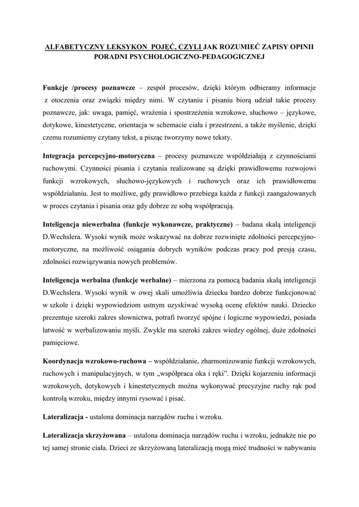 ALFABETYCZNY LEKSYKON POJĘĆ, CZYLI JAK ROZUMIEĆ ZAPISY OPINII PORADNI PSYCHOLOGICZNO-PEDAGOGICZNEJ Funkcje /procesy poznawcze – zespół procesów, dzięki którym odbieramy informacje z otoczenia oraz związki między nimi. W czytaniu i pisaniu biorą udział takie procesy poznawcze, jak: uwaga, pamięć, wrażenia i spostrzeżenia wzrokowe, słuchowo – językowe, dotykowe, kinestetyczne, orientacja w schemacie ciała i przestrzeni, a także myślenie, dzięki czemu rozumiemy czytany tekst, a pisząc tworzymy nowe teksty. Integracja percepcyjno-motoryczna – procesy poznawcze współdziałają z czynnościami ruchowymi. Czynności pisania i czytania realizowane są dzięki prawidłowemu rozwojowi funkcji wzrokowych, słuchowo-językowych i ruchowych oraz ich prawidłowemu współdziałaniu. Jest to możliwe, gdy prawidłowo przebiega każda z funkcji zaangażowanych w proces czytania i pisania oraz gdy dobrze ze sobą współpracują. Inteligencja niewerbalna (funkcje wykonawcze, praktyczne) – badana skalą inteligencji D.Wechslera. Wysoki wynik może wskazywać na dobrze rozwinięte zdolności percepcyjnomotoryczne, na możliwość osiągania dobrych wyników podczas pracy pod presją czasu, zdolności rozwiązywania nowych problemów. Inteligencja werbalna (funkcje werbalne) – mierzona za pomocą badania skalą inteligencji D.Wechslera. Wysoki wynik w owej skali umożliwia dziecku bardzo dobrze funkcjonować w szkole i dzięki wypowiedziom ustnym uzyskiwać wysoką ocenę efektów nauki. Dziecko prezentuje szeroki zakres słownictwa, potrafi tworzyć spójne i logiczne wypowiedzi, posiada łatwość w werbalizowaniu myśli. Zwykle ma szeroki zakres wiedzy ogólnej, duże zdolności pamięciowe. Koordynacja wzrokowo-ruchowa – współdziałanie, zharmonizowanie funkcji wzrokowych, ruchowych i manipulacyjnych, w tym „współpraca oka i ręki”. Dzięki kojarzeniu informacji wzrokowych, dotykowych i kinestetycznych można wykonywać precyzyjne ruchy rąk pod kontrolą wzroku, między innymi rysować i pisać. Lateralizacja - ustalona dominacja narządów ruchu i wzroku. Lateralizacja skrzyżowana – ustalona dominacja narządów ruchu i wzroku, jednakże nie po tej samej stronie ciała. Dzieci ze skrzyżowaną lateralizacją mogą mieć trudności w nabywaniu umiejętności czytania, mogą mylić litery o podobnym kształcie, mieć trudności z zachowaniem pisma w liniaturze. Myślenie przyczynowo-skutkowe – zdolność rozumienia następstwa czasowego, przewidywanie konsekwencji zdarzenia początkowego, umiejętność rozumienia i interpretacji sytuacji społecznych, planowania i przewidywania konsekwencji działań i zachowań, myślenie logiczne. Myślenie słowno-pojęciowe – umiejętność definiowania, wnioskowania i kategoryzowania. Łączy się z umiejętnością identyfikacji i porównywania pojęć oraz zdolnością do wygenerowania nowych treści. Dziecko może myśleć w sposób abstrakcyjny (podaje pojęcie nadrzędne) lub konkretny (podaje cechy obiektów lub ich funkcje). Wysoki wynik świadczy o plastyczności myślenia oraz zdolności uczenia się, kreatywności w rozwiązywaniu problemów, samodzielności myślenia oraz umiejętności wyciągania wniosków. Pamięć mechaniczna (mimowolna) – zdolność do przyswajania wiedzy w sposób nieuświadomiony, a więc bez zaangażowania motywacji i większego wysiłku. Dobra pamięć mechaniczna sprzyja uczeniu się wielu szczegółów, danych ilościowych, szeregu dat, liczb. Dzieci o niższej sprawności pamięci mechanicznej muszą rozwijać myślenie logiczne, dowolne. Nie zapamiętują wiele z lekcji, muszą dodatkowo pracować w domu i wymyślać strategie uczenia się ułatwiające zapamiętywanie materiału bogatego w szczegóły. Pamięć sekwencyjna – zdolność do przyswajania, utrwalania i odtwarzania sekwencji cyfr, nazw (pory roku, miesiące, dni tygodnia). Dzieci z zaburzoną pamięcią sekwencyjną mają również trudności w przyswojeniu sekwencji ruchów podczas pisania, układów gimnastycznych, tanecznych, zapisu reakcji chemicznych i przekształceń matematycznych. Pamięć słuchowa – zapamiętywanie spostrzeżeń słuchowych werbalnych i niewerbalnych, zdolność do przyswajania, utrwalania i przypominania informacji dźwiękowej. W procesie tym zaangażowane są głównie funkcje słuchowe. Dzieci preferujące ten styl uczenia się określa się mianem „słuchowców”. Pamięć słuchowa bezpośrednia – pozwala zapamiętać i natychmiast odtworzyć usłyszany materiał. Wykorzystujemy ją pisząc np. dyktanda, czy przy ustnym odpytywaniu. Zaburzenia pamięci słuchowej bezpośredniej powodują następujące trudności w procesie uczenia się: uczeń ma trudności z zapamiętaniem dwóch poleceń jednocześnie, z zapamiętywaniem długich zdań i poprawnym ich zapisywaniem podczas robienia notatek, liczeniem w pamięci, ze zrozumieniem wypowiedzi w języku obcym. Pamięć słuchowa operacyjna – zdolność do przyswajania, utrwalania i przypominania określonych operacji, działań utrzymywanych w pamięci np. podawanie co trzeciej liczby, liczenie zaczynając od stu i cofając się, wykonywanie prostych działań matematycznych bez użycia palców czy kartki papieru. Pamięć wzrokowa - zapamiętanie spostrzeżeń wzrokowych, zdolność do przyswajania i utrwalania informacji wzrokowych, a dzięki temu przyswajania wiedzy. Dzieci preferujące ten styl uczenia się określa się mianem „wzrokowców”. Rozwój psychoruchowy – całość procesów psychicznych - intelektualnych, orientacyjnopoznawczych i ruchowych. Rozwój psychoruchowy nieharmonijny – zakłócenia tempa rozwoju poszczególnych sfer procesów psychicznych - intelektualnych, orientacyjno-poznawczych i ruchowych. Niektóre sfery rozwijają się w przeciętnym tempie, podczas gdy inne rozwijają się z opóźnieniem lub przyspieszeniem. Zaburzenia percepcji słuchowej – słuchowe zaburzenia odbioru mowy