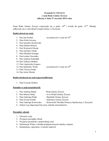 Protokół Nr XXVI/14 z sesji Rady Gminy Żyrzyn odbytej w dniu 27 stycznia 2014 roku Sesja Rady Gminy Żyrzyn rozpoczęła się o godz. 1400 i trwała do godz. 1540. Obrady odbywały się w sali obrad Urzędu Gminy w Żyrzynie. Radni obecni na sesji: 1. Pan Jan Grobel 2. Pani Zofia Jerzyna 3. Pan Jarosław Kozłowski 4. Pani Halina Mizura 5. Pan Wojciech Olszak 6. Pan Jarosław Osiak 7. Pani Monika Szaruga 8. Pan Lesław Szczotka 9. Pan Andrzej Szlendak 10. Pan Tadeusz Białota 11. Pani Agnieszka Gogacz 12. Pan Stanisław Wach 13. Pani Teresa Gruda 14. Pan Artur Olszak - uczestniczył w sesji od 1407 - uczestniczył w sesji od 1405 Radni nieobecni na sesji usprawiedliwieni: 1. Pani Urszula Ścibior Ponadto w sesji uczestniczyli: 1. 2. 3. 4. 5. 6. Pan Andrzej Bujek -Wójt Gminy Żyrzyn Pan Marcin Sulej - Z-ca Wójta Gminy Żyrzyn Pani Jadwiga Polak - Skarbnik Gminy Żyrzyn Pani Iwona Góźdź - Sekretarz Gminy Żyrzyn Pani Jadwiga Kosiewska - Kierownik Ośrodka Pomocy Społecznej w Żyrzynie Sołtysi wg załączonej listy przy udziale mieszkańców. Porządek obrad: 1. 2. 3. 4. 5. Otwarcie sesji. Przyjęcie porządku obrad. Przyjęcie protokołu z poprzedniej sesji. Informacja Wójta z działań podejmowanych między sesjami. Interpelacje, zapytania i wnioski radnych. 1 6. Podjęcie uchwały w sprawie wyodrębnienia środków stanowiących fundusz sołecki w budżecie Gminy Żyrzyn na 2015 rok. - wprowadzenie do tematu Wójta Gminy Żyrzyn, - dyskusja i podjęcie uchwały. 7. Podjęcie uchwały w sprawie uchylenia uchwały Rady Gminy Żyrzyn Nr V/34/2011 z dnia 30 marca 2011r. w sprawie trybu i szczegółowych kryteriów oceny wniosków o realizację zadania publicznego w ramach inicjatyw lokalnych. - wprowadzenie do tematu Wójta Gminy Żyrzyn, - dyskusja i podjęcie uchwały. 8. Podjęcie uchwały w sprawie udzielenia pomocy finansowej Samorządowi Powiatu Puławskiego na remont chodnika przy drodze powiatowej w Żyrzynie- ulica Tysiąclecia oraz na remonty dróg powiatowych w Osinach i Kotlinach. - wprowadzenie do tematu Wójta Gminy Żyrzyn, - dyskusja i podjęcie uchwały. 9. Podjęcie uchwały w sprawie ustanowienia przez Gminę Żyrzyn wieloletniego programu osłonowego w zakresie dożywiania „Pomoc państwa w zakresie dożywiania” na lata 2014- 2020. - wprowadzenie do tematu Kierownika Ośrodka Pomocy Społecznej, - dyskusja i podjęcie uchwały. 10. Podjęcie uchwały w sprawie podwyższenia kryterium dochodowego uprawniającego do przyznania nieodpłatnie pomocy w zakresie dożywiania oraz zasad zwrotu wydatków za świadczenia udzielane w ramach programu wieloletniego „Pomoc państwa w zakresie dożywiania” na lata 2014-2020. - wprowadzenie do tematu kierownika Ośrodka Pomocy Społecznej, - dyskusja i podjęcie uchwały. 11. Podjęcie uchwały w sprawie określenia zakresu i formy informacji o przebiegu wykonania budżetu Gminy Żyrzyn, o kształtowaniu się wieloletniej prognozy finansowej oraz o przebiegu wykonania planu finansowego Biblioteki Gminnej w Żyrzynie i Samodzielnego Publicznego Zakładu Opieki Zdrowotnej w Żyrzynie za okres pierwszego półrocza roku budżetowego. - wprowadzenie do tematu Wójta Gminy Żyrzyn, - dyskusja i podjęcie uchwały. 12. Podjęcie uchwały w sprawie wyrażenia zgody na przystąpienie i realizację przez Gminę Żyrzyn projektu „Profesjonalna e- Administracja” w ramach Programu Operacyjnego Kapitał Ludzki. - wprowadzenie do tematu Wójta Gminy Żyrzyn, - dyskusja i podjęcie uchwały. 13. Podjęcie uchwały w sprawie wyrażenia zgody na przystąpienie i realizację przez Gminę Żyrzyn projektu: Turystyczny Szlak Ontologiczny” obejmujący Dolinę Wieprza (Gminy; Baranów, Puławy i Żyrzyn), Dolinę Wisły (Gmina Puławy) oraz jezioro Duży Ług (Gmina Markuszów) współfinansowanego przez Szwajcarię w ramach szwajcarskiego programu współpracy z nowymi krajami członkowskimi Unii Europejskiej. - wprowadzenie do tematu Wójta Gminy Żyrzyn, - dyskusja i podjęcie uchwały 14. Odpowiedzi na interpelacje, zapytania i wnioski radnych. 15. Sprawy różne i zakończenie sesji. 2 Ad. 1 Przewodniczący Pan Wojciech Olszak otworzył XXVI sesję Rady Gminy Żyrzyn. Na podstawie listy obecności stwierdził, że obecnych jest 12 radnych, w związku z czym Rada jest władna do podejmowania prawomocnych uchwał. Poinformował, że radna Pani Urszula Ścibior usprawiedliwiła swą nieobecność na dzisiejszej sesji, radny Pan Jan Grobel informował, że spóźni się na posiedzenie sesji, natomiast radny Pan Stanisław Wach nie usprawiedliwiał swojej nieobecności. Ad. 2 Przewodniczący Wojciech Olszak- przypomniał, że porządek obrad został zawarty w zaproszeniach na sesję i zapytał o uwagi do tak zaproponowanego porządku obrad. Na salę obrad przybył radny Pan Stanisław Wach. Wójt Pan Andrzej Bujek- poprosił o rozszerzenie porządku obrad po punkcie 11 porządku obrad o dwa dodatkowe punkty, tj.: • pkt. 12 w brzmieniu: podjęcie uchwały w sprawie wyrażenia zgody na przystąpienie i realizacje przez Gminę Żyrzyn projektu „Profesjonalna e- Administracja” w ramach Programu Operacyjnego Kapitał Ludzki. • pkt. 13 w brzmieniu: podjęcie uchwały w sprawie wyrażenia zgody na przystąpienie i realizację przez Gminę Żyrzyn projektu: „Turystyczny Szlak Ornitologiczny” obejmujący Dolinę Wieprza (Gminy: Baranów, Puławy i Żyrzyn), Dolinę Wisły (Gmina Puławy) oraz jezioro Duży Ług (Gmina Markuszów) współfinansowanego przez Szwajcarię w ramach szwajcarskiego programu współpracy z nowymi krajami członkowskimi Unii Europejskiej. Zmiany do porządku obrad zostały przyjęte w głosowaniu jawnym jednomyślnie, tj. 13 głosów „za”. Porządek obrad został przyjęty w głosowaniu jawnym, jednomyślnie, tj.: • „za”- 13 (J. Kozłowski, A. Szlendak, J. Osiak, H. Mizura, Z. Jerzyna, W. Olszak, T. Białota, A. Gogacz, S. Wach, T. Gruda, A. Olszak, L. Szczotka, M. Szaruga) • „przeciw”- 0 