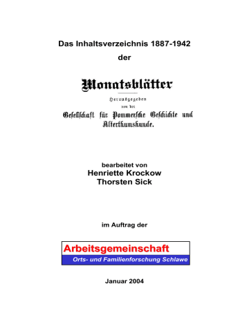 Das Inhaltsverzeichnis 1887-1942 der bearbeitet von Henriette Krockow Thorsten Sick im Auftrag der Arbeitsgemeinschaft Orts- und Familienforschung Schlawe Januar 2004 Inhaltsverzeichnis der Monatsblätter 1887-1942 Jg. Jahr Rubrik Autor NACHNAME, Vorname 1 1 1 1 1 1 1 1 1 1 1 1 1887 1887 1887 1887 1887 1887 1887 1887 1887 1887 1887 1887 1 1 1 1 1887 1887 1887 1887 An unsere Leser Wehrmann, Dr. M. Pommern und Bamberg Die älteste Buchdruckerei Stettins L. Der Bernsteinfund von Butzke Auszug aus den Versammlungs-Protokollen L. Die Giebelhäuser am Markt zu Greifswald Die Russen in Pommern Anzeige H. L. Der Verein für niederdeutsche Sprachforschung Schumann, H. Neue Gräberfunde U. J. Der alte Fritz und der Pastor Mitgliederstatistik / Mittheilungen aus der Gesellschaft H. L. Der Verein für Hansische Geschichte Dannenberg, H. Der Münzfund von Horst Der Münzfund von Sinzlow Bolte, Dr. Johannes Zur Stettiner Theatergeschichte 1 1 1 1 1887 1887 1887 1887 1 1 1 1 1 1887 1887 1887 1887 1887 1 1 1 1 1 1 1887 1887 1887 1887 1887 1887 1 1 1 1 1 1 1887 1887 1887 1887 1887 1887 Vorgeschichtliches 1 1 1 1887 1887 1887 1 1 1 1887 1887 1887 1 1 1887 1887 1 1 1 1 1 2 1887 1887 1887 Vorgeschichtliches 1887 1887 1888 Allgemeines H. Krockow/Th. Sick Titel Friedrich der Große in Stargard Steinkreise bei Glendelin Steinkreise bei Glendelin Die Versammlung der Vereine für hansische Geschichte und niederdeutsche Sprachforschung in Stettin H. L. Zur Herkunft des Nicolaus Decius M. W. Ein pommersches bellum grammaticale H. L. Thalerfund von Stargard Karow, G. Pommerntreue M. W. Ein Festspiel bei der Hochzeit des Herzogs Philipps II H. L. Der Silberfund von Polzin Rolle der Schmiede zu Lauenburg i. P. H. L. Die Familie Hovesch A. Z. Dokation eines Predigers Wiesener, Wilhelm Eine ungelöste Ehrenschuld M. W. Die Versammlung der Vereine für hansische Geschichte und niederdeutsche Sprachforschung in Stettin Haas, Dr. A. Zwei Volkssagen aus dem Dorfe Zudar a. R. J. B. Zu dem Stettiner Theaterzettel Jahn, Dr. Ulrich Das Volksmärchen in Pommern H. L. Münzfund zu Miruschin Bronce- und Eisenfund von Brietzig 1. Reste der Steinzeit aus Hinterpommern; 2. Zwei Broncefunde [in Misdroy und Alt-Grape] 3. Zum Hacksilberfund von Polzin Vogel, O. Friedrich der Große in Stargard Klawonn Zur Geschichte der Hexenprozesse in Pommern Haag, Dr. Georg Ein Exempel Pommerscher Grobheit und Höflichkeit Starck, Dr. med. Münzfund von Wotenik Jubiläum der St. Jakobikirche in Stettin Nachtrag zu dem Exempel Pommerscher Grobheit und Höflichkeit H. L. Das Urnenfeld am Rakowberge bei Falkenburg Blasendorff, Dr. Die Erkundung der Colberger Verschanzungen durch den französichen Konsul Chaumette (1811) Strecker Brehmer, Dr. A. H. Zur Geschichte der Hexenprocesse in Pommern Die Kaiserlichen Truppen in Pasewalk Bronzefunde Silberfund von Mossin Eine Sage aus Rügen Kaiser Friedrich © Arbeitsgemeinschaft "Ort- und Familienforschung Schlawe" Titel beginnt bei Seite: 1 4 9 11 16 24 27 32 33 39 46 48 weitere Seiten (Fortsetzungen) 17 28, 48, 174, 191 48, 64 64, 96, 128, 144, 160, 176, 192 49 54 55 57 59 61 62 66 68 70 74 81 83 87 90 91 91 92 97 110 112 113 122 125 137 129 141 143 145 152 161 162 163 170 177 181 184 187 188 97 1 von 42 Inhaltsverzeichnis der Monatsblätter 1887-1942 Jg. Jahr Rubrik Autor NACHNAME, Vorname H. Krockow/Th. Sick Titel Titel beginnt bei Seite: 98 2 1888 Allgemeines Die Errichtung von Pflegschaften der Gesellschaft 2 2 1888 Allgemeines 1888 Allgemeines 2 1888 Geschichtliches 2 1888 Geschichtliches 2 2 2 2 2 2 2 2 2 1888 1888 1888 1888 1888 1888 1888 1888 1888 Geschichtliches Geschichtliches Geschichtliches Geschichtliches Geschichtliches Geschichtliches Geschichtliches Geschichtliches Geschichtliches 2 2 2 2 2 2 2 2 2 2 2 2 2 1888 1888 1888 1888 1888 1888 1888 1888 1888 1888 1888 1888 1888 Geschichtliches Kunstgeschichtliches Kunstgeschichtliches Vorgeschichtliches Vorgeschichtliches Vorgeschichtliches Vorgeschichtliches Vorgeschichtliches Numismatisches Numismatisches Numismatisches Numismatisches Vermischtes Die Konservirung von Alterthümern Die Aufgrabung und Aufbewahrung von Alterthümern Über die Echtheit einiger Urkunden zur Geschiche von Colbatz Mißhelligkeiten zwischen der Stadt Stettin und der Familie von Wussow Die Familie Hovesch Friedrichswalde Ein pommerscher Hofnarr Die Herzogin Hedwig von Pommern Rolle der Schmiede zu Colberg Stettiner Bürgereid Aus dem Reinberger Pfarrarchiv Geschichte einer pommerschen Amazone Ein Militärschein und ein Bürgerbrief vor 100 Jahren Aus der Franzosenzeit Zur Glockenkunde Goldene Miniaturfigur von Friedrichsberg Der Burgwall von Stettin Bronzefund von Wödtke Hiddenseer Goldring Moorfund von Mellentin Vandalismus Münzfund von Dölitz Münzfund von Freienwalde Münzfund von Regenwalde Münzfund von Tantow Mittheilungen aus der Gesellschaft 77 1 105 101 134 172 181 157 8 21 42 57 15 2 1888 Vermischtes Auszüge aus den Versammlungs-Protokollen 13 2 2 3 3 3 3 3 3 3 3 3 3 3 3 3 3 3 3 3 1888 1888 1889 1889 1889 1889 1889 1889 1889 1889 1889 1889 1889 1889 1889 1889 1889 1889 1889 Zuwachs der Sammlungen Anzeigen An unsere Mitglieder Die neuen Diplome unserer Gesellschaft Nachrufe Franz von Eickstädt Anleitung zur Konservierung von Alterthümern Aus Handschriften der Kamminer Dombibliothek Die Erneuerung der Fürstengruft zu Rügenwalde Beiträge zur pommerschen Literaturgeschichte Zur Geschichte der Familie Friedeborn Pommern in Rostock Wegweiser Eich Vom Seidenbau in Pommern Aus der Franzosenzeit Volksthümliches aus dem Lieper Winkel Zur Glockenkunde Die Kirchenglocken in Treptow a. Toll. Die Wiederherstellungsarbeiten am Kolberger Dom 141 31 130 49 33 81 5 106 1 52 180 77 10 86 145 103 170 11 124 3 1889 Vorgeschichtliches Die römische Inschrift des Kossiner Bronzegefäßes 55 3 1889 Vorgeschichtliches Vorgeschichtliches aus dem Kreise Greifenhagen 57 3 3 1889 Vorgeschichtliches 1889 Vorgeschichtliches 177 132 3 3 1889 Vorgeschichtliches 1889 Vorgeschichtliches Vo