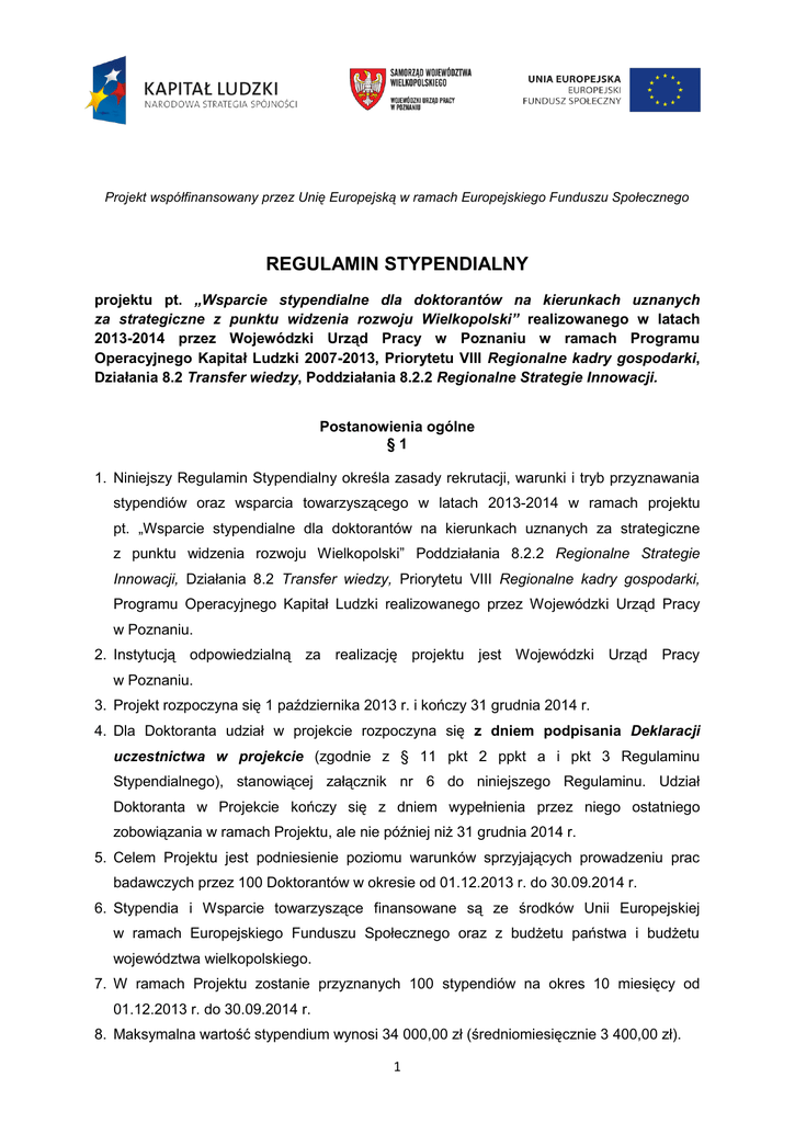 Projekt współfinansowany przez Unię Europejską w ramach Europejskiego Funduszu Społecznego REGULAMIN STYPENDIALNY projektu pt. „Wsparcie stypendialne dla doktorantów na kierunkach uznanych za strategiczne z punktu widzenia rozwoju Wielkopolski” realizowanego w latach 2013-2014 przez Wojewódzki Urząd Pracy w Poznaniu w ramach Programu Operacyjnego Kapitał Ludzki 2007-2013, Priorytetu VIII Regionalne kadry gospodarki, Działania 8.2 Transfer wiedzy, Poddziałania 8.2.2 Regionalne Strategie Innowacji. Postanowienia ogólne §1 1. Niniejszy Regulamin Stypendialny określa zasady rekrutacji, warunki i tryb przyznawania stypendiów oraz wsparcia towarzyszącego w latach 2013-2014 w ramach projektu pt. „Wsparcie stypendialne dla doktorantów na kierunkach uznanych za strategiczne z punktu widzenia rozwoju Wielkopolski” Poddziałania 8.2.2 Regionalne Strategie Innowacji, Działania 8.2 Transfer wiedzy, Priorytetu VIII Regionalne kadry gospodarki, Programu Operacyjnego Kapitał Ludzki realizowanego przez Wojewódzki Urząd Pracy w Poznaniu. 2. Instytucją odpowiedzialną za realizację projektu jest Wojewódzki Urząd Pracy w Poznaniu. 3. Projekt rozpoczyna się 1 października 2013 r. i kończy 31 grudnia 2014 r. 4. Dla Doktoranta udział w projekcie rozpoczyna się z dniem podpisania Deklaracji uczestnictwa w projekcie (zgodnie z § 11 pkt 2 ppkt a i pkt 3 Regulaminu Stypendialnego), stanowiącej załącznik nr 6 do niniejszego Regulaminu. Udział Doktoranta w Projekcie kończy się z dniem wypełnienia przez niego ostatniego zobowiązania w ramach Projektu, ale nie później niż 31 grudnia 2014 r. 5. Celem Projektu jest podniesienie poziomu warunków sprzyjających prowadzeniu prac badawczych przez 100 Doktorantów w okresie od 01.12.2013 r. do 30.09.2014 r. 6. Stypendia i Wsparcie towarzyszące finansowane są ze środków Unii Europejskiej w ramach Europejskiego Funduszu Społecznego oraz z budżetu państwa i budżetu województwa wielkopolskiego. 7. W ramach Projektu zostanie przyznanych 100 stypendiów na okres 10 miesięcy od 01.12.2013 r. do 30.09.2014 r. 8. Maksymalna wartość stypendium wynosi 34 000,00 zł (średniomiesięcznie 3 400,00 zł). 1 Objaśnienie pojęć §2 1. Doktorant (zarówno kobieta, jak i mężczyzna): a. osoba będąca uczestnikiem studiów doktoranckich prowadzonych przez jednostkę organizacyjną uczelni lub jednostkę naukową w rozumieniu ustawy z dnia 27 lipca 2005 r. – Prawo o szkolnictwie wyższym (tj. Dz. U. z 2012 r. poz. 572 z późn. zm.), posiadającej siedzibę na terenie województwa wielkopolskiego lub b. osoba posiadająca wszczęty przewód doktorski w okresie nie wcześniej niż 5 lat poprzedzających dzień złożenia Wniosku w szkole wyższej lub innej jednostce organizacyjnej posiadającej siedzibę na terenie województwa wielkopolskiego, zgodnie z przepisami ustawy z dnia 14 marca 2003 r. o stopniach naukowych i tytule naukowym oraz o stopniach i tytule w zakresie sztuki (Dz. U. z 2003 r. Nr 65, poz. 595 z późn. zm.) – do dnia podjęcia uchwały o nadaniu stopnia doktora. 2. Dokumenty programowe PO KL – aktualnie obowiązujące dokumenty opracowane przez Ministerstwo Rozwoju Regionalnego, określające zasady realizacji Programu Operacyjnego Kapitał Ludzki 2007-2013. 3. Dyrektor – Dyrektor WUP w Poznaniu lub jeden z Wicedyrektorów WUP w Poznaniu. 4. EFS – Europejski Fundusz Społeczny. 5. Ekspert – osoba oceniająca merytorycznie Wnioski o przyznanie stypendium i wsparcia towarzyszącego w ramach Projektu, specjalista w zakresie określonego Kierunku strategicznego / określonych Kierunków strategicznych, będąca pracownikiem naukowym w szkole wyższej lub innej jednostce organizacyjnej, legitymująca się stopniem naukowym minimum doktora habilitowanego. 6. Kierunki strategiczne – kierunki matematyczno-przyrodnicze i technologiczne (SMT – zakres kierunków SMT określany jest na podstawie międzynarodowej klasyfikacji ISCED’97) oraz zgodne z Regionalną Strategią Innowacji dla Wielkopolski na lata 20102020, wymienione w § 3 pkt 2 Regulaminu Stypendialnego. 7. Kryteria dostępu – warunki obowiązkowe, jakie powinien spełniać Wnioskujący, aby Wniosek został przyjęty do oceny, określone w § 3 Regulaminu Stypendialnego. 8. Opiekun naukowy / Promotor – Opiekunem naukowym Doktoranta jest osoba, pod opieką której przygotowywana jest rozprawa doktorska, posiadająca tytuł naukowy profesora lub stopień naukowy doktora habilitowanego, zatrudniona w szkole wyższej lub innej jednostce wielkopolskiego, organizacyjnej w której posiadającej Doktorant siedzibę realizuje na pracę terenie naukową, województwa uprawniona do potwierdzania postępów Doktoranta w pracy badawczej, potwierdzania i opiniowania tematu jego rozprawy doktorskiej. Promotorem Doktoranta jest osoba, pod opieką której przygotowywana jest rozprawa doktorska wskazana w art. 13 ust. 1 ustawy z dnia 14 marca 2003 r. o stopniach naukowych i tytule naukowym oraz o stopniach i tytule 2 w zakresie sztuki (Dz. U. z 2003 r. Nr 65, poz. 595 z późn. zm), zatrudniona w szkole wyższej lub innej jednostce organizacyjnej posiadającej siedzibę na terenie województwa wielkopolskiego, w której Doktorant realizuje pracę naukową. 9. PO KL – Program Operacyjny Kapitał Ludzki. 10. Projekt – projekt systemowy pt. „Wsparcie stypendialne dla doktorantów na kierunkach uznanych za strategiczne z punktu widzenia rozwoju Wielkopolski”, realizowany w roku akademickim 2013/2014 przez Wojewódzki Urząd Pracy w Poznaniu w ramach Programu Operacyjnego Kapitał Ludzki, Priorytetu VIII Regionalne kadry gospodarki, Działania 8.2 Transfer wiedzy, Poddziałania 8.2.2 Regionalne Strategie Innowacji. 11. Regulamin Stypendialny – niniejszy Regulamin Stypendialny Projektu. 12. Sprawozdanie – Sprawozdanie z realizacji pracy doktorskiej składane jednorazowo przez Stypendystę. Wzór Sprawozdania stanowi załącznik nr 10 do Regulaminu Stype
