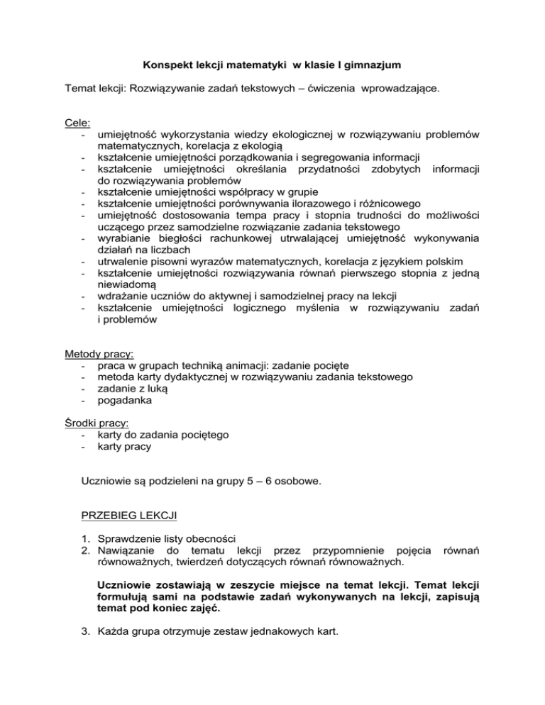 Konspekt lekcji matematyki w klasie I gimnazjum Temat lekcji: Rozwiązywanie zadań tekstowych – ćwiczenia wprowadzające. Cele: - umiejętność wykorzystania wiedzy ekologicznej w rozwiązywaniu problemów matematycznych, korelacja z ekologią - kształcenie umiejętności porządkowania i segregowania informacji - kształcenie umiejętności określania przydatności zdobytych informacji do rozwiązywania problemów - kształcenie umiejętności współpracy w grupie - kształcenie umiejętności porównywania ilorazowego i różnicowego - umiejętność dostosowania tempa pracy i stopnia trudności do możliwości uczącego przez samodzielne rozwiązanie zadania tekstowego - wyrabianie biegłości rachunkowej utrwalającej umiejętność wykonywania działań na liczbach - utrwalenie pisowni wyrazów matematycznych, korelacja z językiem polskim - kształcenie umiejętności rozwiązywania równań pierwszego stopnia z jedną niewiadomą - wdrażanie uczniów do aktywnej i samodzielnej pracy na lekcji - kształcenie umiejętności logicznego myślenia w rozwiązywaniu zadań i problemów Metody pracy: - praca w grupach techniką animacji: zadanie pocięte - metoda karty dydaktycznej w rozwiązywaniu zadania tekstowego - zadanie z luką - pogadanka Środki pracy: - karty do zadania pociętego - karty pracy Uczniowie są podzieleni na grupy 5 – 6 osobowe. PRZEBIEG LEKCJI 1. Sprawdzenie listy obecności 2. Nawiązanie do tematu lekcji przez przypomnienie pojęcia równoważnych, twierdzeń dotyczących równań równoważnych. równań Uczniowie zostawiają w zeszycie miejsce na temat lekcji. Temat lekcji formułują sami na podstawie zadań wykonywanych na lekcji, zapisują temat pod koniec zajęć. 3. Każda grupa otrzymuje zestaw jednakowych kart. - - Nie ma sztywnych zasad współpracy w grupie A. Grupa może wypracować własne zasady współpracy w grupie w celu rozwiązania zadania pociętego B. KAŻDA GRUPA WYBIERA LIDERA C. Nauczyciel przedstawia instrukcję liderowi grupy: rozdaj karty między uczniów w grupie (nie musi to być równa liczba kart dla każdego ucznia) wybierz sekretarza do notowania ustaleń grupy poproś o odczytanie kolejnych pytań zamieszczonych na kartach i poproś o ich umieszczenie na środku stołu poproś o odczytanie informacji na kartach i podjęcie dyskusji, które informacje umożliwią grupie odpowiedzieć na jedno z pytań (nie zapomnijcie zanotować rozwiązania i odpowiedzi, segregujcie karty) poproś o podjęcie dalszej dyskusji, po to, by ustalić kolejność rozwiązywania niewiadomych i odpowiadania na pozostałe pytania (ułóżcie w kolejności rozwiązywania i kolejno dokładajcie do nich odpowiednie informacje na kartach, notujcie obliczenia i odpowiedzi). Ćwiczenie 1 – KARTY NA TEMAT EKOLOGII Porzucona gazeta rozpada się około 2 miesięcy. Papierek po cukierku rozpada się około 6 razy dłużej niż gazeta. Jak długo rozpada się papierek po cukierku? Skórka banana, ogryzek – rozpadają się tak długo, jak gazeta. Jak długo rozpada się puszka aluminiowa? Plastikowa butelka rozpada się 5 10 5 lat. Puszka po konserwie rozpada się o 9950 lat krócej niż puszka aluminiowa. Jak długo rozpada się puszka po konserwie? Materiały organiczne, głównie Jak długo rozpada się skórka banana pochodzenia roślinnego np. opadłe lub ogryzek? liście, igły, gałązki wpływają korzystnie na jakość gleby, tworząc próchnicę. Głównie odpady nieorganiczne Aluminiowa puszka rozpada się 50 razy wymagają długiego okresu rozpadu i krócej niż butelka plastikowa. zanieczyszczają środowisko. Czy jest możliwe, byś znalazł puszkę po EKOLOGIA konserwie, porzuconą przez człowieka w wieku Twojego dziadka? Lider, zgodnie z opisaną wcześniej instrukcją organizuje pracę w grupie. Spodziewany efekt pracy w grupie: o Papierek po cukierku rozpada się – 1 rok. o Plastikowa butelka rozpada się – 500 000 lat. o Skórka banana, ogryzek rozpadają się – 2 miesiące. o Aluminiowa puszka rozpada się – 10 000 lat. o Puszka po konserwie rozpada się – 50 lat. o Czy jest możliwe, byś znalazł puszkę po konserwie, porzuconą przez człowieka w wieku twojego dziadka? Każda odpowiedź jest możliwa. Liderzy prezentują wyniki pracy w grupie. Grupa, która zgłosi się najwcześniej, referuje 3 odpowiedzi, pozostałe 3 odpowiedzi referuje inna grupa. Za poprawne odpowiedzi i rozwiązania grupa otrzymuje kartkę z „buziaczkiem” . Ćwiczenie 2 – ZADANIE TEKSTOWE Każdy uczeń otrzymuje kartę z zadaniem praktycznym do wykonania i każdy uczestniczy w rozwiązaniu zadania, należy narysować i rozwiązać zadanie. Zadanie uczniowie rozwiązują indywidualnie, ale w grupie mogą się konsultować. Za prawidłowe rozwiązanie uczestnik z grupy otrzymuje kartkę z „buziaczkiem”. Narysujcie regał na książki zbudowany z czterech półek. Na pierwszej półce narysujcie 5 książek, na drugiej dwa razy więcej, na trzeciej o trzy mniej niż na drugiej. Na wszystkich półkach ułożono 30 książek. Ile książek narysujesz na czwartej półce? Spodziewany efekt pracy uczniów: I półka – 5 książek II półka – 10 książek III półka – 7 książek IV półka – 30 – 22 = 8 książek Odp. Na czwartej półce należy narysować 8 książek. Ćwiczenie 3 – ZADANIE Z LUKĄ Każdy uczeń otrzymuje kartkę z zadaniem z luką. W miejsce kropek wstaw kolorowym pisakiem brakujące litery. Pamiętaj o prawidłowej pisowni. Chętny uczeń rozwiązuje równanie na tablicy. Za prawidłowe rozwiązanie uczestnik z grupy otrzymuje kartkę z „buziaczkiem”. Czy wiesz, co to znaczy rozwiązać r...wnanie? Rozwią... kilka r...żnych r...wnań, a przekonasz się, że to nic tr...dnego. P...wiastkiem r...wnania 2(x+5)=131 będzie li...ba .... Rozwiązanie równania: 2(x+5)=131 2x+10=131 2x=131 – 10 2x = 121 /:2 x = 60,5 Odp. Rozwiązaniem równania jest liczba 60,5. Na podstawie wykonywanych zadań uczniowie fo