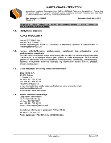 KARTA CHARAKTERYSTYKI sporządzona zgodnie z Rozporządzeniem (WE) nr 1907/2006 Parlamentu Europejskiego i Rady z dnia 18 grudnia 2006 r. w sprawie rejestracji, oceny, udzielania zezwoleń i stosowanych ograniczeń w zakresie chemikaliów (REACH), z późniejszymi zmianami Data wydania: 01.12.2010 Wersja nr 4 Data aktualizacji: 01.06.2015 SEKCJA 1: IDENTYFIKACJA SUBSTANCJI/MIESZANINY I IDENTYFIKACJA SPÓŁKI/PRZEDSIĘBIORSTWA 1.1. Identyfikator produktu KOKS WĘGLOWY Numer WE: 266-010-4 Numer CAS: 65996-77-2 Numer rejestracyjny REACH: Zwolniony z rejestracji zgodnie z załącznikiem V rozporządzenia REACH. 1.2. Istotne zidentyfikowane zastosowania substancji lub mieszaniny oraz zastosowania odradzane Produkt stały koksowania węgla stosowany jako reduktor w metalurgii i w przemyśle chemicznym, w mniejszym stopniu jako paliwo w małej energetyce. Zróżnicowane gatunki w zależności od przeznaczenia: wielkopiecowy, odlewniczy, metalurgiczny, opałowy. Sortymenty ziarnowe różniące się rozmiarami ziaren: koksik, groszek, orzech, kostka, kęsy. 1.3. Dane dotyczące dostawcy karty charakterystyki JSW KOKS S.A. 41-800 Zabrze ul. Pawliczka 1 tel. +48 32 / 757 50 00 fax. +48 32 / 416 42 40 REGON: 278093210 e-mail kompetentnej osoby odpowiedzialnej za kartę charakterystyki: [email protected] strona www: www.jswkoks.pl 1.4. Numer telefonu alarmowego Dyspozytor całodobowo tel. +48 32 / 757 51 22 tel. kom. 607 627 707 fax. +48 32 / 757 50 21 e-mail: [email protected] Dodatkowe informacje w godzinach 7:00 do 15:00 tel. +48 32 / 416 43 23 Nagłe sytuacje: 112 z telefonu komórkowego. Koks węglowy Strona 1/9 KARTA CHARAKTERYSTYKI sporządzona zgodnie z Rozporządzeniem (WE) nr 1907/2006 Parlamentu Europejskiego i Rady z dnia 18 grudnia 2006 r. w sprawie rejestracji, oceny, udzielania zezwoleń i stosowanych ograniczeń w zakresie chemikaliów (REACH), z późniejszymi zmianami Data wydania: 01.12.2010 Wersja nr 4 Data aktualizacji: 01.06.2015 SEKCJA 2: IDENTYFIKACJA ZAGROŻEŃ 2.1 Klasyfikacja substancji lub mieszaniny Nie jest substancją niebezpieczną, nie wymaga klasyfikacji zgodnie z obowiązującymi przepisami Rozporządzenia (WE) NR 1272/2008. 2.2 Elementy oznakowania Nie wymaga oznakowania. 2.3 Inne zagrożenia Nie stwarza zagrożeń dla ludzi oraz środowiska naturalnego. SEKCJA 3: SKŁAD/INFORMACJA O SKŁADNIKACH 3.1. Substancje Skład koksu jest zmienny w zależności od stosowanej technologii, głównym składnikiem jest węgiel. Zakres zawartości pierwiastków zawiera się w podanych granicach: węgiel: 85 – 95 %, wodór: 0,5 – 1 %, tlen: 0,2 – 1,5 %, azot: 0,3 – 1,3 %, siarka: 0,5 – 2,0 %. Koks zawiera 8 – 15 % substancji mineralnej. SEKCJA 4: ŚRODKI PIERWSZEJ POMOCY 4.1. Opis środków pierwszej pomocy 4.1.1 Wytyczne dotyczące pierwszej pomocy wg dróg narażenia 4.2 Kontakt z oczami Przemyć oko dużą ilością czystej wody, w przypadku pozostania w oku drobnych cząstek koksu założyć jałowy opatrunek i w razie konieczności zapewnić pomoc lekarską. Kontakt ze skórą Umyć dobrze wodą z mydłem, zdezynfekować i/lub opatrzyć ewentualne drobne otarcia lub skaleczenia. Drogi pokarmowe Nie dotyczy, możliwość pomyłkowego spożycia wykluczona. Drogi oddechowe Pył koksowy może podrażniać drogi oddechowe. Najważniejsze ostre i opóźnione objawy oraz skutki narażenia Nie określono Koks węglowy Strona 2/9 KARTA CHARAKTERYSTYKI sporządzona zgodnie z Rozporządzeniem (WE) nr 1907/2006 Parlamentu Europejskiego i Rady z dnia 18 grudnia 2006 r. w sprawie rejestracji, oceny, udzielania zezwoleń i stosowanych ograniczeń w zakresie chemikaliów (REACH), z późniejszymi zmianami Data wydania: 01.12.2010 Wersja nr 4 4.3 Data aktualizacji: 01.06.2015 Wskazania dotyczące wszelkiej natychmiastowej i szczególnego postępowania z poszkodowanym Nie określono pomocy lekarskiej SEKCJA 5: POSTĘPOWANIE W PRZYPADKU POŻARU 5.1. Środki gaśnicze Odpowiednie środki gaśnicze: Powstały pożar gasić dużą ilością wody w rozproszonym prądzie lub innymi dostępnymi środkami. Niewłaściwe środki gaśnicze: Nie stosować ditlenku węgla z uwagi na możliwość zgazowania węgla i powstawania tlenku węgla. 5.2. Szczególne zagrożenia związane z substancją Produkt nie jest materiałem łatwopalnym. 5.3 Informacje dla straży pożarnej Nie określono SEKCJA 6: POSTĘPOWANIE UWOLNIENIA DO ŚRODOWISKA W PRZYPADKU NIEZAMIERZONEGO 6.1. Indywidualne środki ostrożności, sprzęt ochronny i procedury w sytuacjach awaryjnych Nie stanowi zagrożenia dla zdrowia. 6.2. Środki ostrożności w zakresie ochrony środowiska Nie stanowi żadnego zagrożenia dla środowiska. 6.3. Metody i materiały zapobiegające rozprzestrzenianiu się skażenia i służące do usuwania skażenia Zebrać mechanicznie i zawrócić do pełnowartościowego produktu. Partie zanieczyszczone ziemią, piaskiem przeznaczyć do wykorzystania jako paliwo. 6.4 Odniesienia do innych sekcji Nie określono SEKCJA 7: POSTĘPOWANIE Z SUBSTANCJAMI I MIESZANINAMI ORAZ ICH MAGAZYNOWANIE 7.1. Środki ostrożności dotyczące bezpiecznego postępowania W trakcie użytkowania zgodnie z przeznaczeniem nie występują żadne zagrożenia. Spalać tylko w odpowiednich, przystosowanych paleniskach. Koks węglowy Strona 3/9 KARTA CHARAKTERYSTYKI sporządzona zgodnie z Rozporządzeniem (WE) nr 1907/2006 Parlamentu Europejskiego i Rady z dnia 18 grudnia 2006 r. w sprawie rejestracji, oceny, udzielania zezwoleń i stosowanych ograniczeń w zakresie chemikaliów (REACH), z późniejszymi zmianami Data wydania: 01.12.2010 Wersja nr 4 Data aktualizacji: 01.06.2015 7.2. Warunki bezpiecznego magazynowania, w tym informacje dotyczące wszelkich wzajemnych niezgodności Magazynować na zwałowiskach, w miarę możliwości zadaszonych z uwagi na możliwość pochłaniania wody z opadów atmosferycznych i wzrostu zawartości wilgoci. 7.3. Szczególne zastosowanie(-a) końcowe Brak SEKCJA 8: KONTROLA NARAŻENIA/ŚRODKI OCHRO