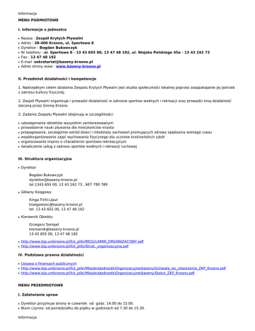 Informacja MENU PODMIOTOWE I. Informacje o jednostce ● ● ● ● ● ● ● Nazwa : Zespół Krytych Pływalni Adres : 38-400 Krosno, ul. Sportowa 8 Dyrektor : Bogdan Bukowczyk Nr telefonu : ul. Sportowa 8 - 13 43 655 00, 13 47 48 192, ul. Wojska Polskiego 45a - 13 43 242 73 Fax : 13 47 48 192 E-mail :[email protected] Adres strony www : www.baseny-krosno.pl II. Przedmiot działalności i kompetencje 1. Nadrzędnym celem dzialania Zespolu Krytych Pływalni jest słuzba społeczności lokalnej poprzez zasppakajanie jej potrzeb z zakresu kultury fizycznej. 2. Zespól Pływalni organizuje i prowadzi działalność w zakresie sportow wodnych i rekreacji oraz prowadzi inną działalność zleconą przez Gminę Krosno. 3. Zadania Zespołu Pływalni obejmują w szczególności: ● ● ● ● ● ● udostępnianie obiektów wszystkim zainteresowanym prowadzenie nauki pływania dla mieszkańców miasta propagowanie, szczegolnie wśród dzieci i młodzieży zachowań promujących zdrowy spędzania wolnego czasu współorganizowanie zajęć wychowania fizycznego dla uczniow krośnieńskich szkół organizowanie imprez o charakterze sportowo-rekreacyjnym świadczenie usług z zakresu sportów wodnych i rekreacji ruchowej III. Struktura organizacyjna ● Dyrektor Bogdan Bukowczyk [email protected] tel.1343 655 00, 13 43 242 73 , 607 790 789 ● Główny Księgowy Kinga Firlit-Liput [email protected] tel. 13 43 655 00, 13 47 48 192 ● Kierownik Obiektu Grzegorz Sompel [email protected] 13 43 655 00, 13 47 48 192 ● ● http://www.bip.umkrosno.pl/fck_pliki/REGULAMIN_ORGANIZACYJNY.pdf http://www.bip.umkrosno.pl/fck_pliki/Struk._organizacyjna.pdf IV. Podstawa prawna działalności ● ● ● Ustawa o finansach publicznych http://www.bip.umkrosno.pl/fck_pliki/MiejskieJednostkiOrganizacyjne/baseny/Uchwala_ws_utworzenia_ZKP_Krosno.pdf http://www.bip.umkrosno.pl/fck_pliki/MiejskieJednostkiOrganizacyjne/baseny/Statut_ZKP_Krosno.pdf MENU PRZEDMIOTOWE I. Załatwianie spraw ● ● Dyrektor przyjmuje strony w czwartek od godz. 14.00 do 15.00. Biuro czynne :od poniedziałku do piątku w godzinach od 7.30 do 15.30. Informacja Informacja II. Finanse, majątek jednostki ● ● ● ● http://www.bip.umkrosno.pl/fck_pliki/MiejskieJednostkiOrganizacyjne/baseny/plan_2016.pdf Środki trwałe - wartość 1.084145,85 zł Budynki wartość - 9.455.145,68 zł http://www.bip.umkrosno.pl/fck_pliki/MiejskieJednostkiOrganizacyjne/baseny/bilans_na_dzien_31.12.2015_r..pdf III. Rejestry i ewidencje (należy wpisać nazwy prowadzonych rejestrów/ewidencji – nie udostępniać jeśli nie ma wymogu) IV. Dostęp do informacji publicznych Zasady dostępu do informacji publicznej reguluje ustawa z 6 września 2001 r. o dostępie do informacji publicznej (Dz. U. Nr 112, poz. 1198). ● Ustawa o dostępie do informacji publicznej (PLIK) V. Dostęp do informacji nieogłoszonych w BIP Aby uzyskać informacje nieudostępnione w Biuletynie Informacji Publicznej można skorzystać z formularza wniosku dostępnego poniżej. Wniosek można dostarczyć osobiście, pocztą tradycyjną, mailem lub wysłać faksem. Dane teleadresowe są dostępne na stronie startowej BIP. Wniosek do pobrania O Informacja