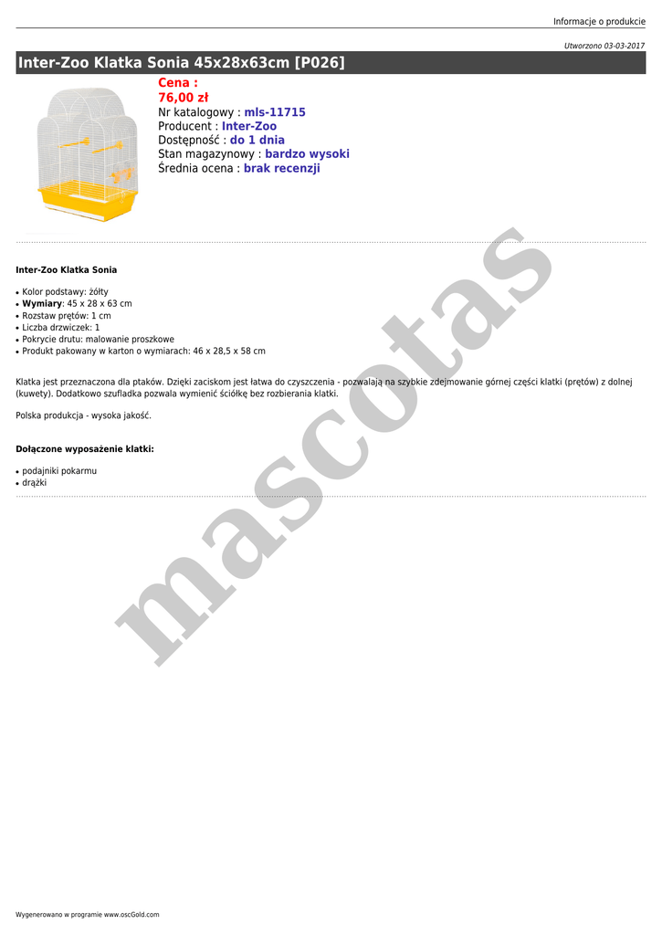 Informacje o produkcie Utworzono 03-03-2017 Inter-Zoo Klatka Sonia 45x28x63cm [P026] Cena : 76,00 zł Inter-Zoo Klatka Sonia ● ● ● ● ● Kolor podstawy: żółty Wymiary: 45 x 28 x 63 cm Rozstaw prętów: 1 cm Liczba drzwiczek: 1 Pokrycie drutu: malowanie proszkowe Produkt pakowany w karton o wymiarach: 46 x 28,5 x 58 cm co ta ● s Nr katalogowy : mls-11715 Producent : Inter-Zoo Dostępność : do 1 dnia Stan magazynowy : bardzo wysoki Średnia ocena : brak recenzji Klatka jest przeznaczona dla ptaków. Dzięki zaciskom jest łatwa do czyszczenia - pozwalają na szybkie zdejmowanie górnej części klatki (prętów) z dolnej (kuwety). Dodatkowo szufladka pozwala wymienić ściółkę bez rozbierania klatki. Polska produkcja - wysoka jakość. Dołączone wyposażenie klatki: ● podajniki pokarmu drążki m as ● Wygenerowano w programie www.oscGold.com