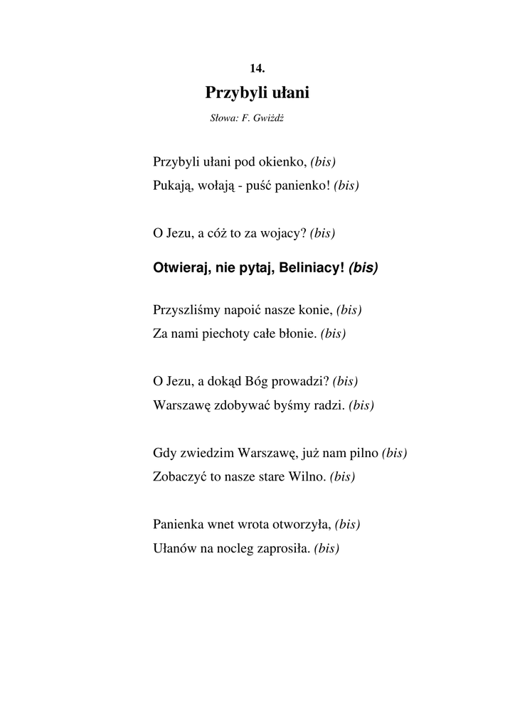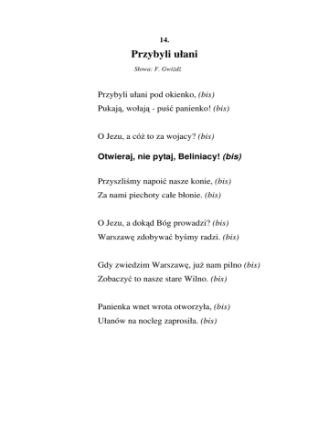 14. Przybyli ułani Słowa: F. Gwiżdż Przybyli ułani pod okienko, (bis) Pukają, wołają - puść panienko! (bis) O Jezu, a cóż to za wojacy? (bis) Otwieraj, nie pytaj, Beliniacy! (bis) Przyszliśmy napoić nasze konie, (bis) Za nami piechoty całe błonie. (bis) O Jezu, a dokąd Bóg prowadzi? (bis) Warszawę zdobywać byśmy radzi. (bis) Gdy zwiedzim Warszawę, już nam pilno (bis) Zobaczyć to nasze stare Wilno. (bis) Panienka wnet wrota otworzyła, (bis) Ułanów na nocleg zaprosiła. (bis)