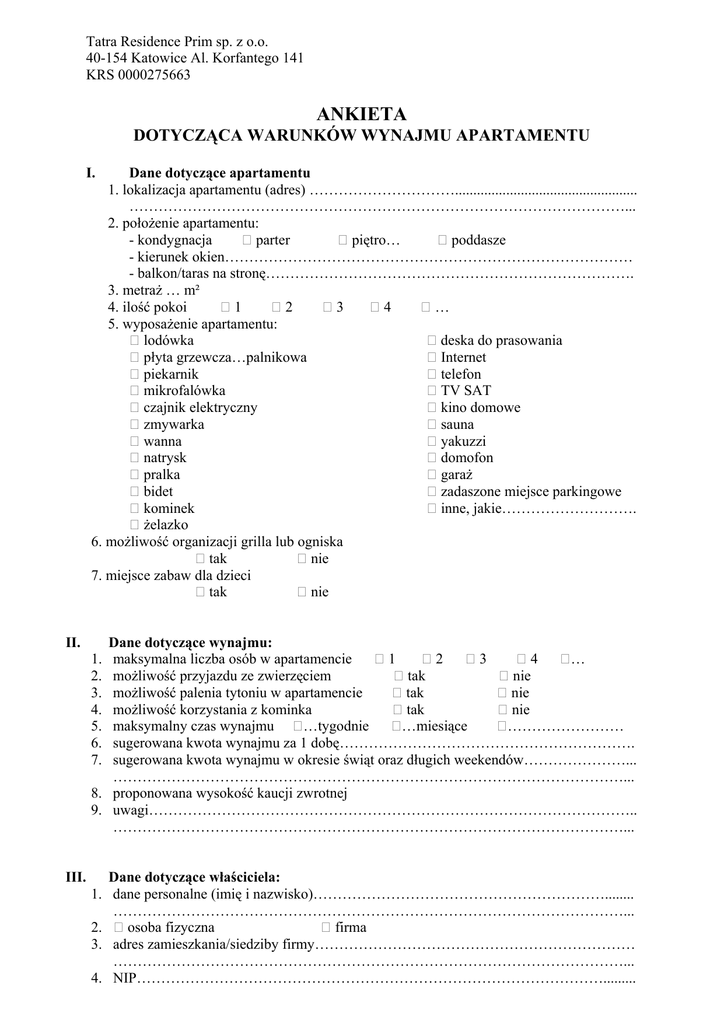 Tatra Residence Prim sp. z o.o. 40-154 Katowice Al. Korfantego 141 KRS 0000275663 ANKIETA DOTYCZĄCA WARUNKÓW WYNAJMU APARTAMENTU I. Dane dotyczące apartamentu 1. lokalizacja apartamentu (adres) ………………………….................................................. …………………………………………………………………………………………... 2. położenie apartamentu: - kondygnacja parter piętro… poddasze - kierunek okien………………………………………………………………………… - balkon/taras na stronę…………………………………………………………………. 3. metraż … m² 4. ilość pokoi 1 2 3 4 … 5. wyposażenie apartamentu: deska do prasowania lodówka Internet płyta grzewcza…palnikowa telefon piekarnik TV SAT mikrofalówka kino domowe czajnik elektryczny sauna zmywarka yakuzzi wanna domofon natrysk garaż pralka zadaszone miejsce parkingowe bidet inne, jakie………………………. kominek żelazko 6. możliwość organizacji grilla lub ogniska tak nie 7. miejsce zabaw dla dzieci tak nie II. Dane dotyczące wynajmu: maksymalna liczba osób w apartamencie 1 2 3 4 … możliwość przyjazdu ze zwierzęciem tak nie możliwość palenia tytoniu w apartamencie tak nie możliwość korzystania z kominka tak nie maksymalny czas wynajmu …tygodnie …miesiące …………………… sugerowana kwota wynajmu za 1 dobę……………………………………………………. sugerowana kwota wynajmu w okresie świąt oraz długich weekendów…………………... ……………………………………………………………………………………………... 8. proponowana wysokość kaucji zwrotnej 9. uwagi……………………………………………………………………………………….. ……………………………………………………………………………………………... 1. 2. 3. 4. 5. 6. 7. III. Dane dotyczące właściciela: 1. dane personalne (imię i nazwisko)……………………………………………………........ ……………………………………………………………………………………………... 2. osoba fizyczna firma 3. adres zamieszkania/siedziby firmy………………………………………………………… ……………………………………………………………………………………………... 4. NIP……………………………………………………………………………………......... 5. nazwa i numer konta bankowego…………………………………………………….......... ……………………………………………………………………………………………... IV. Obsługa wynajmu 1. czy na stronie internetowej ma być umieszczona wizualizacja apartamentu tak nie