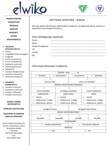 PROJEKTOWANIE ZAPYTANIE OFERTOWE – ŻURAW DORADZTWO SPRZEDAŻ MONTAŻ Aby móc dobrać dla Państwa odpowiednie urządzenie i przygotować ofertę, prosimy o wypełnienie poniższego formularza. REMONTY SERWIS MODERNIZACJE URZĄDZEŃ DŹWIGNICOWYCH: suwnic wciągników (elektrowciągów) wciągarek żurawi stacjonarnych żurawi samojezdnych podestów ruchomych wózków jezdniowych dźwigników osprzętu dźwignicowego systemów sterowania systemów zasilających Dane składającego zapytanie: Firma: …………………………………………………………………………………………………… Adres: …………………………………………………………………………………………………… Osoba kontaktowa: …………………………………………………………………………………………………… Tel: …………………………………………………………………………………………………… e-mail: …………………………………………………………………………………………………… fax: …………………………………………………………………………………………………… Informacje dotyczące urządzenia: ŻURAW – ilość …………. szt □ słupowy □ specjalny □ praca w hali praca na zewnątrz MIEJSCE MOCOWANIA ŻURAWIA □ □ □ nowa posadzka istniejąca posadzka nowy fundament podnoszenie jazda wózka obrót □ ręczne □ ręczna □ ręczny □ elektryczne- 2 biegi □ elektryczna- 2 biegi □ elektryczny- 2 biegi □ elektryczne- płynne □ elektryczna- płynne □ elektryczny- płynne □ POMIARY ELEKTRYCZNE SZKOLENIA W ZAKRESIE OBSŁUGI DŹWIGNIC □ przyścienny □ URZĄDZEŃ DŹWIGOWYCH: schodów ruchomych chodników ruchomych dźwigów osobowych dźwigów towarowych SERWIS TURBIN WIATROWYCH □ przestawny □ wciągnik linowy wciągnik łańcuchowy GRUPA NATĘŻENIA PRACY □ □ 1Bm/M3 □ 1Am/M4 □ 2m/M5 3m/M6 STEROWANIE Firma ELWIKO wdrożyła oraz stosuje zintegrowany system zarządzania zgodny z normami PN-EN ISO 9001:2009 oraz PN-N-18001:2004 □ kaseta sterownicza □ sterowanie radiowe MONTAŻ □ tak □ nie Udźwig Q=……………….. [t] Wysięg ramienia W= ……………. [m] Wysokość podnoszenia Hp= ………….… [m] Kąt obrotu Ko= ……………… [o] Wysokość do belki Hb= ………….… [m] Wysokość całkowita Hc= …………….. [m] Wysokość hali w świetle 1= ……………… [m] Grubość posadzki* Klasa betonu posadzki Wymiary słupa ** Grubość ściany*** * ………………….. [mm] * ………………….. .......[mm] x …… [mm] ………………….. [mm] - w przypadku montażu żurawia na istniejącej posadzce - w przypadku montażu żurawia przyściennego na słupie (stalowym / betonowym) *** - w przypadku montażu żurawia przyściennego na ścianie ** DODATKOWE INFORMACJE Prosimy o przesłanie zapytania do doradcy techniczno-handlowego z danego obszaru lub na e-mail: [email protected] lub fax: 91-810 10 22. Zakład Usługowo-Handlowy ELWIKO Stanisław Dropik 70-822 Szczecin, ul. Koszarowa 20/1 NIP: 858-000-63-76, REGON: 008209099 Infolinia: 801 359 456 (801 ELWIKO), tel. 91 810 10 20, fax 91 810 10 22 www.elwiko.pl; e-mail: [email protected]; sklep internetowy: www.elwiko.sklep.pl