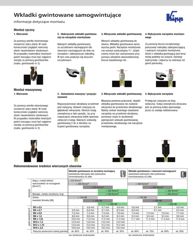 Wkładki gwintowane samogwintujące informacje dotyczące montażu Montaż ręczny 2. ‑Nakręcanie wkładki gwintowa‑ nej na narzędzie montażowe 1. Wiercenie Za pomocą wiertła rdzeniowego rozwiercić stary otwór. W razie konieczności pogłębić wiercony otwór nawiertakiem stożkowym. W przypadku materiałów twardych gwint mocujący musi być najpierw nacięty za pomocą gwintownika (maks. gwintownik nr 2). Nakręcić wkładkę gwintowaną ze szczelinami nacinającymi lub otworami nacinającymi do dołu na narzędzie i zabezpieczyć nakrętką. W tym celu posłużyć się kluczem szczękowym. 3. Wkręcanie wkładki gwintowanej Wkręcić wkładkę gwintowaną do otworu. Wkładka gwintowana sama wycina gwint. Narzędzie montażowe ma uchwyt sześciokątny ¼“, dzięki czemu może być zamocowane przy pomocy wkrętarki akumulatorowej, klucza nasadowego itd.. 4. Wykręcanie narzędzia montażo‑ wego Za pomocą klucza szczękowego poluzować nakrętkę zabezpieczającą i wykręcić narzędzie montażowe. Gwint z wkładką gwintującą jest teraz mniej podatny na zużycie, bardziej wytrzymały i odporny na wibracje niż gwint pierwotny. Montaż maszynowy 2. ‑Ustawienia maszyny i pozycjo‑ nowanie 1. Wiercenie Za pomocą wiertła rdzeniowego rozwiercić stary otwór. W razie konieczności pogłębić wiercony otwór nawiertakiem stożkowym. W przypadku materiałów twardych gwint mocujący musi być najpierw nacięty za pomocą gwintownika (maks. gwintownik nr 2). Wypozycjonować obrabiany przedmiot pod maszyną. Ustawić maszynę na głębokość wkręcania. Obrócić tuleję zewnętrzną w taki sposób,, by przy rozpoczęciu wkręcania kołek oporowy zahaczył o tuleję. Nakręcić wstawkę gwintowaną 2 do 4 obrotów na trzpień gwintowany narzędzia. 3. Wkręcanie wkładki gwintowanej 4. Wykręcanie narzędzia Maszyna powinna pracować, dopóki wkładka gwintowana nie zostanie wkręcona do przedmiotu obrabianego. Należy unikać twardego osadzania narzędzia na przedmiot obrabiany, ponieważ może to skutkować pęknięciem wstawki gwintowanej, przedmiotu obrabianego lub narzędzia montażowego. Przełączyć maszynę na bieg wsteczny. Tuleja zewnętrzna obracana jest za pomocą kołka oporowego, przez co zostaje odblokowana. Rekomendowane średnice wierconych otworów Wkładki gwintowane ze szczeliną nacinającą utwardzana dyfuzyjnie stal cynkowana, chromianowana na żółto gwint wewnetrzny D tworzywo Stopy z metali lekkich wytrzymałość na rozciąganie [N/mm²] Mosiądz, metale nieżelazne, brąz Żeliwo twardość Brinella [HB] M3 x 0,5 M4 x 0,7 M5 x 0,8 M6 x 1,0 M8 x 1,25 M10 x 1,5 M12 x 1,75 M16 x 2,0 Pokrycie powierzchni nośnej gwintów < 250 N/mm² < 300 N/mm² Wkładki gwintowane z otworami nacinającymi utwardzana dyfuzyjnie stal cynkowana, chromianowana na żółto < 300 N/mm² < 350 N/mm² < 350 N/mm² > 350 N/mm² > 350 N/mm² < 150 HB > 350 N/mm² > 350 N/mm² < 150 HB < 200 HB 5,9 mm 7,2 mm 8,8 mm 10,8 mm 12,8 mm 14,8 mm 18,8 mm ok. 60% 4,6 mm 6,0 mm 7,3 mm 9,0 mm 11,0 mm 13,0 mm 15,0 mm 19,0 mm ok. 50% ew. konieczne smarowanie > 200 HB 4,7 mm 4,8 mm 6,1 mm 6,2 mm 7,5 mm 7,6 mm 9,2 mm 9,4 mm 11,2 mm 11,4 mm 13,2 mm 13,4 mm 15,2 mm 15,4 mm 19,2 mm 19,4 mm ok. 40% ok. 30% < 200 HB 4,6 mm 6,0 mm 7,4 mm 9,3 mm 11,1 mm ok. 80% > 200 HB 4,8 mm 6,2 mm 7,6 mm 7,7 mm 9,5 mm 9,6 mm 11,3 mm 11,5 mm ok. 60% ok. 50% 4,7 mm 6,1 mm 7,5 mm 9,4 mm 11,2 mm ok. 70% ew. konieczne smarowanie