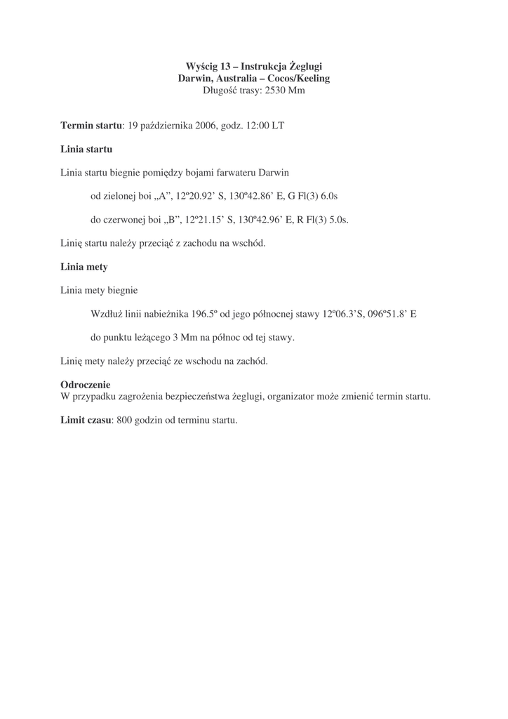 Wy cig 13 – Instrukcja eglugi Darwin, Australia – Cocos/Keeling Długo trasy: 2530 Mm Termin startu: 19 pa dziernika 2006, godz. 12:00 LT Linia startu Linia startu biegnie pomi dzy bojami farwateru Darwin od zielonej boi „A”, 12º20.92’ S, 130º42.86’ E, G Fl(3) 6.0s do czerwonej boi „B”, 12º21.15’ S, 130º42.96’ E, R Fl(3) 5.0s. Lini startu nale y przeci z zachodu na wschód. Linia mety Linia mety biegnie Wzdłu linii nabie nika 196.5º od jego północnej stawy 12º06.3’S, 096º51.8’ E do punktu le cego 3 Mm na północ od tej stawy. Lini mety nale y przeci ze wschodu na zachód. Odroczenie W przypadku zagro enia bezpiecze stwa eglugi, organizator mo e zmieni termin startu. Limit czasu: 800 godzin od terminu startu.