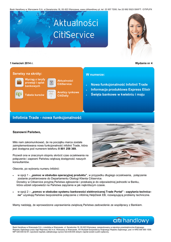 Bank Handlowy w Warszawie S.A. ul.Senatorska 16, 00-923 Warszawa, www.citihandlowy.pl, tel. 22 657 7200, fax 22 692 5023 SWIFT: CITIPLPX 1 kwiecień 2014 r. Wydanie nr 4 Serwisy na skróty: W numerze: Wyciąg z taryfy prowizji i opłat bankowych Aktualności CitiService Tabela kursów Analizy rynkowe CitiDaily Nowa funkcjonalność Infolinii Trade Informacja produktowa Express Elixir Święta bankowe w kwietniu i maju Infolinia Trade - nowa funkcjonalność Szanowni Państwo, Miło nam zakomunikować, że na początku marca została zaimplementowana nowa funkcjonalność infolinii Trade, która jest dostępna pod numerem telefonu 0 801 258 369. Pozwoli ona w znacznym stopniu skrócić czas oczekiwania na połączenie i zapewni Państwu większą dostępność naszych konsultantów. Obecnie, po wybraniu numeru Infolinii: w opcji 1 - „pomoc w obsłudze operacyjnej produktu”, w przypadku długiego oczekiwania, połączenie zostanie przekierowane do Departamentu Obsługi Klienta Citiservice. Doradcy w Citiservice przyjmą Państwa zgłoszenie i przekażą je do odpowiedniej jednostki w Banku, która udzieli odpowiedzi na Państwa zapytania w jak najkrótszym czasie. w opcji 2 – „pomoc w obsłudze systemu bankowości elektronicznej Trade Portal” - zapytania techniczne” uzyskają Państwo bezpośrednie połączenie z infolinią HelpDesk EB, rozwiązującą problemy techniczne. Mamy nadzieję, że wprowadzone usprawnienia zwiększą Państwa zadowolenie ze współpracy z Bankiem. Bank Handlowy w Warszawie S.A. z siedzibą w Warszawie, ul. Senatorska 16, 00-923 Warszawa, zarejestrowany w rejestrze przedsiębiorców Krajowego Rejestru Sądowego przez Sąd Rejonowy dla m.st. Warszawy w Warszawie, XII Wydział Gospodarczy Krajowego Rejestru Sądowego, pod nr KRS 000 000 1538; NIP 526-030-02-91; wysokość kapitału zakładowego wynosi 522.638.400 złotych, kapitał został w pełni opłacony. Święta bankowe w kwietniu i majuElixir 2014 roku Informacja produktowa - Express Szanowni Państwo, Z przyjemnością informujemy, że w systemie CitiDirect udostępniona została nowa funkcjonalność płatnicza – Przelew Express Elixir. Przelew Express Elixir to nowa, innowacyjna forma płatności, która zapewnia natychmiastowy i bezpieczny transfer pieniędzy – pozwala przesłać pieniądze bezpośrednio pomiędzy rachunkami klientów, które są prowadzone przez banki będące uczestnikami systemu Express Elixir nawet w ciągu kilkunastu sekund i co najważniejsze, bez wykorzystania żadnych rachunków instytucji pośredniczących i przekazywania środków poza system bankowy. Aby dokonać płatności w systemie Express Elixir wymagana jest równoczesna dostępność Banku Handlowego oraz banku beneficjenta. Przelewy w systemie Express Elixir w Banku Handlowym dostępne są w dni robocze, w godzinach 7.00 – 18.00. Aktualna lista banków krajowych, będących uczestnikami systemu Express Elixir wraz z godzinami ich dostępności zamieszczona jest na stronie Krajowej Izby Rozliczeniowej (http://www.expresselixir.pl/). Obecnie Przelew Express Elixir można wysłać z systemu CitiDirect Classic. Odbierać tego typu płatności mogą wszyscy klienci korporacyjni Banku Handlowego. Pojedynczy Przelew może mieć wartość do 100000.00 PLN. Opłata za realizację wysłanego Przelewu wynosi 10 PLN. Do najważniejszych korzyści wynikających ze stosowania płatności natychmiastowych należy: Możliwość błyskawicznego uregulowania należności Gwarancja bezpieczeństwa i niezależności Możliwość obsługi transakcji wymagających natychmiastowego przepływu środków, np. realizacja zakupu w hurtowni, odbiór dostawy towaru, wypłata pilnych świadczeń Alternatywny oraz szybszy kanał realizacji niskokwotowych zleceń wysyłanych dotychczas systemem Sorbnet Więcej informacji znajdziecie Państwo: - na naszej stronie internetowej (http://www.citibank.pl/poland/corporate/polish/index.htm) - w podręczniku użytkownika CitiDirect Bank Handlowy w Warszawie S.A. z siedzibą w Warszawie, ul. Senatorska 16, 00-923 Warszawa, zarejestrowany w rejestrze przedsiębiorców Krajowego Rejestru Sądowego przez Sąd Rejonowy dla m.st. Warszawy w Warszawie, XII Wydział Gospodarczy Krajowego Rejestru Sądowego, pod nr KRS 000 000 1538; NIP 526-030-02-91; wysokość kapitału zakładowego wynosi 522.638.400 złotych, kapitał został w pełni opłacony. Święta bankowe w kwietniu i maju 2014 roku Prezentujemy Państwu daty w marcu i kwietniu 2014 roku, w których zlecenia ze względu na święto waluty (dzień wolny od pracy w danym kraju) będą realizowane następnego dnia roboczego. KWIECIEŃ MAJ 01 - INR 02 - ARS 04 - TWD 07 - THB 09 - PHP, TND 14 - THB 15 - ILS, THB 17 - ARS, COP, DKK, ISK, MXN, NOK, PEN, PHP, VEF 18 - ANG, ARS, AUD, BGN, BRL, BWP, CAD, CHF, CLP, CNY, COP, DKK, EUR, GBP, HKD, IDR, INR, ISK, JMD, KES, LBP, LVL, MKD, MXN, MWK, NOK, NZD, PEN, PHP, SCR, SEK, SGD, UGX, VEF, XOF, ZAR, ZMW, ZWL 21 - ANG, AUD, BGN, BRL, BWP, CHF, CNY, CZK, DKK, EGP, EUR, GBP, HKD, HRK, HUF, ILS, ISK, JMD, KES, LBP, LTL, LVL, MKD, MWK, NOK, NZD, PLN, RON, SEK, UGX, XOF, ZAR, ZMW, ZWL 23 - TRY 24 - ISK 25 - AUD, EGP, NZD 28 - ZAR 29 - JPY 30 - ANG 01 - ALL, ANG, ARS, BAM, BGN, BHD, BRL, BWP, CDF, CHF, CLP, CNY, COP, CZK, EGP, EUR, HKD, HRK, HUF, IDR, ISK, JOD, KES, KRW, LBP, LTL, LVL, MAD, MKD, MUR, MXN, MYR, MWK, NOK, PEN, PHP, PKR, PLN RON, RUB, SCR, SEK, SGD, THB, TND, TRY, TWD, UGX VEF, XOF, ZAR, ZMW, ZWL 02 - HUF, RUB 05 - GBP, JPY, KRW, LVL, THB 06 - BGN, CNY, HKD, ILS, JPY, KRW 08 - CZK 09 - RUB 13 - MYR, SGD, THB 14 - MWK 15 - IDR 16 - DKK 19 - CAD, TRY 21 - CLP 23 - JMD 26 - AED, GBP, KWD, OMR, USD, ZMW, ZWL 27 - IDR 29 - ANG, BWP, CHF, DKK, IDR, ISK, NOK, SEK 30 - DKK Bank Handlowy w Warszawie S.A. z siedzibą w Warszawie, ul. Senatorska 16, 00-923 Warszawa, zarejestrowany w rejestrze przedsiębiorców Krajowego Rejestru Sądowego przez Sąd Rejonowy dla m.st. Warszawy w Warszawie, XII Wydział Gos