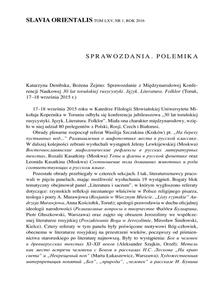 SLAVIA ORIENTALIS TOM LXV, NR 1, ROK 2016 S P R AW O Z D A N I A . P O L E M I K A Katarzyna Dembska, Bożena Żejmo: Sprawozdanie z Międzynarodowej Konferencji Naukowej 30 lat toruńskiej rusycystyki. Język. Literatura. Folklor (Toruń, 17–18 września 2015 r.) 17–18 września 2015 roku w Katedrze Filologii Słowiańskiej Uniwersytetu Mikołaja Kopernika w Toruniu odbyła się konferencja jubileuszowa „30 lat toruńskiej rusycystyki. Język. Literatura. Folklor”. Miała ona charakter międzynarodowy, wzięło w niej udział 80 prelegentów z Polski, Rosji, Czech i Białorusi. Obrady plenarne rozpoczął referat Wasilija Szczukina (Kraków) pt. „На берегу пустынных вод...” Размышления о мифопоэтике места в русской классике. W dalszej kolejności zebrani wysłuchali wystąpień Jeleny Lewkijewskiej (Moskwa) Восточнославянские мифологические рефлексы в русских литературных текстах, Rozalii Kasatkiny (Moskwa) Тепы и флепы в русской фонетике oraz Leonida Kasatkina (Moskwa) Соотношение пола домашних животных и рода соответствующих в русском языке. Pozostałe obrady przebiegały w czterech sekcjach. I tak, literaturoznawcy pracowali w pięciu panelach, mając możliwość wysłuchania 19 wystąpień. Bogaty blok tematyczny obejmował panel „Literatura i sacrum”, w którym wygłoszono referaty dotyczące: rzymskich refleksji nieznanego właściwie w Polsce religijnego pisarza, teologa i poety A. Murawjowa (Rosjanin w Wiecznym Mieście. „Listy rzymskie” Andrzeja Murawjowa, Anna Kościołek, Toruń); apologii prawosławia w duchu oficjalnej ideologii narodowości (Религиозные вопросы в творчестве Фаддея Булгарина, Piotr Głuszkowski, Warszawa) oraz zajęto się obrazem Jerozolimy we współczesnej literaturze rosyjskiej (Poszukiwanie Boga w Jerozolimie, Mirosław Śmiłowski, Kielce). Cztery referaty w tym panelu były poświęcone motywowi Bóg-człowiek, obecnemu w literaturze rosyjskiej na przestrzeni wieków, począwszy od piśmiennictwa staroruskiego po literaturę najnowszą. Były to wystąpienia: Бог и человек в древнерусских текстах XI–XII веков (Aleksander Szajkin, Оrzeł); Метель как место встречи человека с Богом в рассказах Н.С. Лескова „На краю света” и „Некрещеный поп” (Marta Łukaszewicz, Warszawa); Художественная интерпретация понятий „Бог”, „природа”, „человек” в рассказе И. Бунина 188 SPRAWOZDANIA. POLEMIKA „Над городом” (Olga Miereszczakowa, Moskwa); Бог, мир и человек в русской прозе рубежа XX–XXI веков (Ludmiła Szewczenko, Moskwa). W sekcji poświęconej literaturze XVIII-XIX wieku wygłoszono sześć referatów i były to następujące wystąpienia: Magdaleny Dąbrowskiej (Warszawa) Czasopisma literackie późnego Oświecenia w służbie wychowania społeczeństwa. „Что-нибудь от безделья на досуге” Nikołaja Osipowa, w którym zalazła się propozycja klasyfikacji zawartości zapomnianego czasopisma Osipowa z punktu widzenia wymowy moralizatorskiej oraz sposobów jej przekazu. Z kolei w referacie Obraz Kaukazu w rosyjskim poemacie romantycznym Joanny Nowakowskiej-Ozdoby (Kielce) ukazano bogactwo literackich wizerunków Kaukazu w poematach romantyków rosyjskich. O mitopoetyckim obrazie osła, jego ambiwalentnej symbolice (hipostaza boskości i uosobienie głupoty) i zasadzie współistnienia oficjalno-cerkiewnych form i rytuałów z nieoficjalną kulturą śmiechu w pisarstwie F. Dostojewskiego mówiła w swym referacie Ослиный код в поэтике романа Достоевского „Идиот” Anna Majmieskułow (Bydgoszcz). W kolejnym, Daria Ambroziak (Opole), podjęła próbę analizy memuarów Zofii Kowalewskiej, które stanowią źródło wiedzy o życiu ziemiaństwa rosyjskiego na rosyjskim pograniczu w latach 60. XIX wieku (Obraz życia i obyczajowości ziemiaństwa rosyjskiego w świetle wspomnień Zofii Kowalewskiej). Bożena Żejmo (Toruń) w referacie Человек „гаршинской закваски” в творчестве А. Чехова zestawiła i porównała niektóre fakty z życia W. Garszyna z losami bohaterów czterech utworów Czechowa: Step, Czajka, Choroba, Sala nr 6. Tę część referatów o literaturze XIX wieku zamknął Romana Kuligowski (Toruń) tematem Polsko-japońska „Nastazja” Andrzeja Wajdy na tle innych ekranizacji „Idioty” F. Dostojewskiego. Dzieło polskiego reżysera wyróżnia nawiązanie do japońskiego teatru kabuki, w którym role kobiece odgrywają mężczyźni. W panelu literatura XX wieku wygłoszono sześć referatów. O poezji „pierwszej fali” emigracji rosyjskiej mówiła Jolanta Brzykcy (Toruń) w referacie Kilka uwag o poetyce „Miniatur” Lwa Gomolickiego. Na dialogu dwóch wielkich poetek rosyjskich skupiła się Olga Rubinczik (Petersburg) w referacie Из переписки Надежды Мандельштам с Лидией Гинзбург. Uwagi o „losie” jako jednej z ważniejszych kategorii kultury rosyjskiej i sposobach jej funkcjonowania we współczesnej literaturze przedstawiła Jolanta Greń-Kulesza (Opole) w referacie Kategoria losu (sud’by) w twórczości Ludmiły Ulickiej. Tragiczna i tajemnicza śmierć Sergiusza Jesienina niezmiennie inspiruje polskich artystów, o czym była mowa w wystąpieniu Kamila Dźwinela (Toruń) Epitafia dla „nocnego gościa”. Piosenki poświęcone Sergiuszowi Jesieninowi. Z kolei Łukasz Gemziak (Toruń) prześledził polemikę wokół postaci homo sovieti