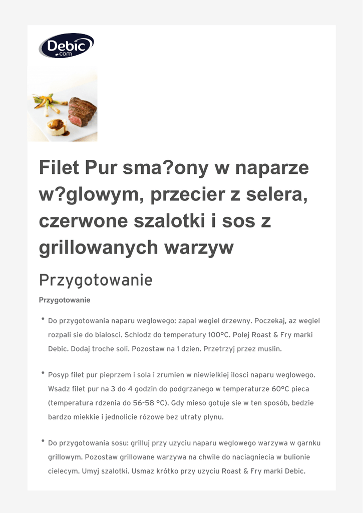 Debic Filet Pur sma?ony w naparze w?glowym, przecier z selera, czerwone szalotki i sos z grillowanych warzyw Przygotowanie Przygotowanie Do przygotowania naparu weglowego: zapal wegiel drzewny. Poczekaj, az wegiel rozpali sie do bialosci. Schlodz do temperatury 100°C. Polej Roast & Fry marki Debic. Dodaj troche soli. Pozostaw na 1 dzien. Przetrzyj przez muslin. Posyp filet pur pieprzem i sola i zrumien w niewielkiej ilosci naparu weglowego. Wsadz filet pur na 3 do 4 godzin do podgrzanego w temperaturze 60°C pieca (temperatura rdzenia do 56-58 °C). Gdy mieso gotuje sie w ten sposób, bedzie bardzo miekkie i jednolicie rózowe bez utraty plynu. Do przygotowania sosu: grilluj przy uzyciu naparu weglowego warzywa w garnku grillowym. Pozostaw grillowane warzywa na chwile do naciagniecia w bulionie cielecym. Umyj szalotki. Usmaz krótko przy uzyciu Roast & Fry marki Debic. Dodaj reszte skladników i smaz dalej powoli. Obierz ziemniaki i ugotuj w posolonej wodzie. Obierz seler i pokrój na male kawalki. Ugotuj w posolonej wodzie. Poniewaz ziemniaki i seler maja rózny czas gotowania, gotujemy je oddzielnie. Odsacz ziemniaki i seler. Wysusz krótko na ogniu. Zrób przecier z ziemniaków i selera. Podgrzej Culinaire Original marki Debic i dodaj do przecieru. Wymieszaj starannie. Przypraw do smaku Zakończyć Wykonczenie Pokrój mieso na pozadane porcje. Wyporcuj mieso, szalotki, przecier z selera i sos na podgrzane talerze. Ozdób grillowanymi warzywami, jak równiez cebula lesna. Pokaż składniki 10 pieces Przecier z selera 1000 g selera 500 g ziemniaków gałka muszkatołowa sól i pieprz Szalotki 30 x szalotka 500 ml bulionu cielęcego 2 x listków laurowych 2 g goździku 50 g boczku (słoniny gotowanej i suszonej) 700 ml czerwonego wina Sos z grillowanych warzyw Różne warzywa jak papryka, szalotka,cebula leśna 500 ml bulionu cielęcego Napar w?glowy 500 g węgla drzewnego 500 ml Debic Roast & Fry soli Filet pur 1 x filet pur o wadze 2 kg Napar węglowy sól i pieprz Debic to marka Friesland Campina Foodservice - Copyright 2017 Debic
