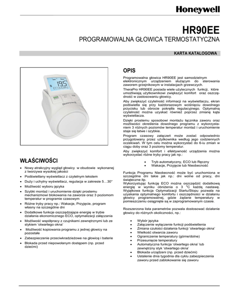HR90EE PROGRAMOWALNA GŁOWICA TERMOSTATYCZNA KARTA KATALOGOWA OPIS Programowalna głowica HR90EE jest samodzielnym elektronicznym urządzeniem służącym do sterowania zaworem grzejnikowym w instalacjach grzewczych. TheraPro HR90EE posiada wiele użytecznych funkcji, które umożliwiają użytkownikowi zwiększyć komfort oraz oszczędność w zastosowaniu głowicy. Aby zwiększyć czytelność informacji na wyświetlaczu, ekran podświetla się przy każdorazowym wciśnięciu dowolnego przycisku lub obrocie pokrętła regulacyjnego. Optymalną czytelność można uzyskać również poprzez zmianę kąta wyświetlacza. Dzięki prostemu sposobowi montażu łącznika zaworu oraz możliwości określenia dowolnego programu z wykorzystaniem 3 różnych poziomów temperatur montaż i uruchomienie staje się łatwe i szybkie. Program czasowy załączeń może zostać odpowiednio przygotowany przez użytkownika według jego codziennych oczekiwań. W tym celu można wykorzystać do 6-iu zmian w ciągu doby oraz 3 poziomy temperatur. Aby zwiększyć komfort i efektywność urządzenia można wykorzystać różne tryby pracy jak np.: WŁAŚCIWOŚCI Nowy atrakcyjny wygląd głowicy w obudowie wykonanej z tworzywa wysokiej jakości Podświetlany wyświetlacz z czytelnym tekstem Duży i uchylny wyświetlacz, regulacja w zakresie 5…30° Możliwość wyboru języka Szybki montaż i uruchomienie dzięki prostemu mechanizmowi blokowania na zaworze oraz 3 poziomom temperatur w programie czasowym Różne tryby pracy np.: Wakacje, Przyjęcie, program własny na szczególne dni Dodatkowe funkcje oszczędzające energię w trybie działania ekonomicznego ECO, optymalizacji załączania Możliwość współpracy z czujnikami zewnętrznymi lub ze stykiem ‘otwartego okna’ Możliwość kopiowania programu z jednej głowicy na pozostałe Zabezpieczenie przeciwkradzieżowe na głowicę i baterie Blokada przed niepowołanym dostępem (np. przed dziećmi) Tryb automatyczny, ECO lub Ręczny Wakacje, Przyjęcie lub Nieobecność Funkcja Programu Nieobecność może być uruchomiona w szczególne dni takie jak np.: dni wolne od pracy, dni świąteczne itp. Wykorzystując funkcję ECO można oszczędzić dodatkową energię w wyniku obniżenia o 3 oC każdą nastawę. Wyjątkowa funkcja Optymalizacji Startu/Stopu pozwala na uzyskania optymalnego komfortu i oszczędności w działaniu głowicy programowalnej, gdzie żądane temperatury w pomieszczeniu osiągnięte są w zaprogramowanym czasie. Rozszerzona lista parametrów pozwala dostosować działanie głowicy do różnych okoliczności, np.: Wybór języka Załączenie wyłączenie funkcji podświetlenia Zmiana czułości działania funkcji ‘otwartego okna’ Wielkość otwarcia zaworu Ograniczenie temperatury (górne/dolne) Przesunięcie temperatury Automatyczna funkcja ‘otwartego okna’ lub zewnętrzny styk ‘otwartego okna’ Blokada urządzeni (np. przed dziećmi) Ustalenie dnia tygodnia dla cyklu zabezpieczenia zaworu przed zablokowanie się zaworu HR90EE PROGRAMOWALNA GŁOWICA TERMOSTATYCZNA THERA PRO Dane techniczne POMIAR TEMPERATURY ELEKTRYCZNE Czujnik wewnętrzny Zasilanie: Baterie lub akumulatorki Czujnik: Typ Baterii: LR6, AA, AM3 2x Mignon 1,5V Alternatywnie: NTC DANE OGÓLNE 2x Lithium 1,5V 2x NiMH 1,2V akumulatorki Wyświetlacz Wymiary (dł.xszer.xwys.): 96 x 54 x 60 mm Materiał: PC Klasa ochronności: IP 30 Przyłącze zaworu: M30 x 1,5 Wyświetlacz podświetlany: Tekst w standarcie 9 literowym Wymiary 30x26mm (szer./wys.) WSPÓŁPRACA Z URZĄDZENIAMI (opcja) Moduł zasilający zewnętrzny PRZECHOWYWANIE I STANDARDY Temperatura pracy: 0 ….. +50 ºC Temperatura przechowywania: -20 …+55 ºC Wilgotność: 10 … 90 % względna Zastosowanie: do lokali indywidualnych, domków jednorodzinnych, biur i obiektów handlowych. CERTYFIKATY Standardy: CE Konformität, RoHS Zasilacz: APS90 Napięcie zasilania: 9….24V AC/DC Zabezpieczenie antywandalowe: AVS90 Zewnętrzny moduł pomieszczeniowy (czujnik/nastawa): HCW23 Czujnik pokojowy: RF20 Styk ‘otwartego okna’: HCA30 Kabek kopiujący 0,5m: ACC90 Kabel 2,0m: ACS90 (do czujnika pokojowego/styku ‘otwartego okna’) Osłona chromowana: VPE 3 szt. 2 AFA90 HR90EE PROGRAMOWALNA GŁOWICA TERMOSTATYCZNA THERA PRO Montaż HR90EE 1. Włożyć baterie 2x 1,5V Typ: LR6, AA,AM3 Wybrać język, datę oraz godzinę 2. Zdemontować starą głowicę 4. Zamontować łącznik zaworu wraz z adapterem termostatyczną (jeśli jest konieczny) 3. Rozłączyć łącznik zaworu 5. Zamontować głowicę na łączniku zaworu UWAGA! HR90EE rozpoczyna pracę Opcje według fabrycznego programu Głowica oraz baterie mogą być zabezpieczone przed kradzieżą stosując załączone wkręty Zewnętrzna osłona głowicy może być wymieniona na osłonę chromowaną 3 Wyświetlacz można stabilnie ustawić na podpórce pod kątem 40° HR90 PROGRAMOWALNA GŁOWICA TERMOSTATYCZNA THERA PRO Montaż HR90EE Współpraca z czujnikami zewnętrznymi HCW23, RF20 oraz stykiem ‘otwartego okna’ ACS80 Kabel 2 m Kopiowanie programu na pozostałe głowice HR90EE Jeśli kilka głowic HR90EE ma działać według tego samego programu czasowego, wystarczy ustawić program czasowy na jednym urządzeniu (urządzeniu głównym) i przy pomocy kabla ACC90 skopiować ustawienia do innych głowic. ACC90 Kabel 0,5 m Honeywell sp. z o.o. ul. Domaniewska 39 B 02-672 Warszawa 4 Tel. 22 60 60 900, faks 22 60 60 983 4 HR90-k-pl01r MW1114