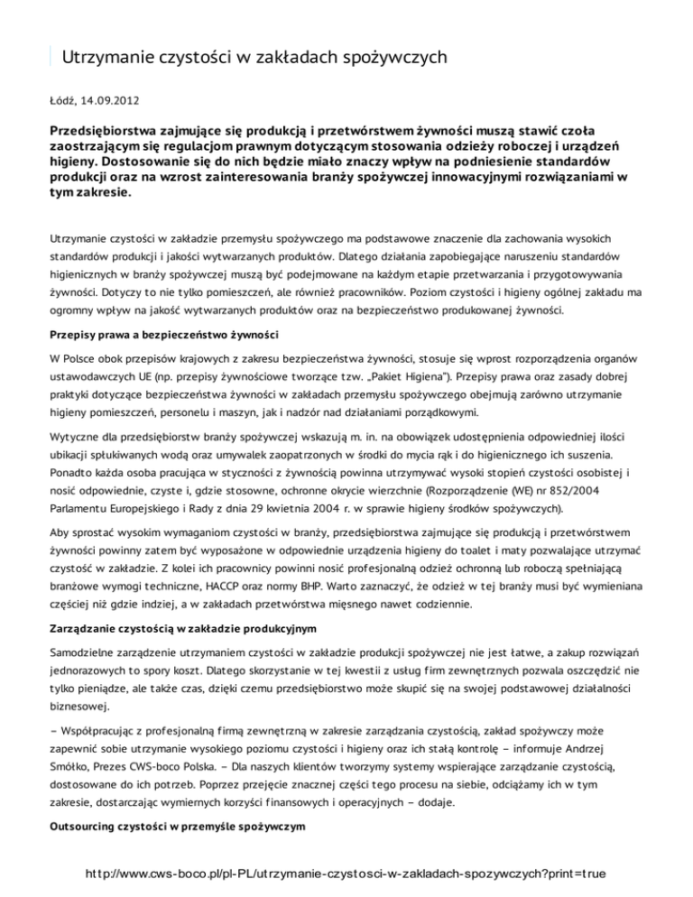 Utrzymanie czystości w zakładach spożywczych Łódź, 14 .09.2012 Przedsiębiorstwa zajmujące się produkcją i przetwórstwem żywności muszą stawić czoła zaostrzającym się regulacjom prawnym dotyczącym stosowania odzieży roboczej i urządzeń higieny. Dostosowanie się do nich będzie miało znaczy wpływ na podniesienie standardów produkcji oraz na wzrost zainteresowania branży spożywczej innowacyjnymi rozwiązaniami w tym zakresie. Utrzymanie czystości w zakładzie przemysłu spożywczego ma podstawowe znaczenie dla zachowania wysokich standardów produkcji i jakości wytwarzanych produktów. Dlatego działania zapobiegające naruszeniu standardów higienicznych w branży spożywczej muszą być podejmowane na każdym etapie przetwarzania i przygotowywania żywności. Dotyczy to nie tylko pomieszczeń, ale również pracowników. Poziom czystości i higieny ogólnej zakładu ma ogromny wpływ na jakość wytwarzanych produktów oraz na bezpieczeństwo produkowanej żywności. Przepisy prawa a bezpieczeństwo żywności W Polsce obok przepisów krajowych z zakresu bezpieczeństwa żywności, stosuje się wprost rozporządzenia organów ustawodawczych UE (np. przepisy żywnościowe tworzące tzw. „Pakiet Higiena”). Przepisy prawa oraz zasady dobrej praktyki dotyczące bezpieczeństwa żywności w zakładach przemysłu spożywczego obejmują zarówno utrzymanie higieny pomieszczeń, personelu i maszyn, jak i nadzór nad działaniami porządkowymi. Wytyczne dla przedsiębiorstw branży spożywczej wskazują m. in. na obowiązek udostępnienia odpowiedniej ilości ubikacji spłukiwanych wodą oraz umywalek zaopatrzonych w środki do mycia rąk i do higienicznego ich suszenia. Ponadto każda osoba pracująca w styczności z żywnością powinna utrzymywać wysoki stopień czystości osobistej i nosić odpowiednie, czyste i, gdzie stosowne, ochronne okrycie wierzchnie (Rozporządzenie (WE) nr 852/2004 Parlamentu Europejskiego i Rady z dnia 29 kwietnia 2004 r. w sprawie higieny środków spożywczych). Aby sprostać wysokim wymaganiom czystości w branży, przedsiębiorstwa zajmujące się produkcją i przetwórstwem żywności powinny zatem być wyposażone w odpowiednie urządzenia higieny do toalet i maty pozwalające utrzymać czystość w zakładzie. Z kolei ich pracownicy powinni nosić profesjonalną odzież ochronną lub roboczą spełniającą branżowe wymogi techniczne, HACCP oraz normy BHP. Warto zaznaczyć, że odzież w tej branży musi być wymieniana częściej niż gdzie indziej, a w zakładach przetwórstwa mięsnego nawet codziennie. Zarządzanie czystością w zakładzie produkcyjnym Samodzielne zarządzenie utrzymaniem czystości w zakładzie produkcji spożywczej nie jest łatwe, a zakup rozwiązań jednorazowych to spory koszt. Dlatego skorzystanie w tej kwestii z usług firm zewnętrznych pozwala oszczędzić nie tylko pieniądze, ale także czas, dzięki czemu przedsiębiorstwo może skupić się na swojej podstawowej działalności biznesowej. – Współpracując z profesjonalną firmą zewnętrzną w zakresie zarządzania czystością, zakład spożywczy może zapewnić sobie utrzymanie wysokiego poziomu czystości i higieny oraz ich stałą kontrolę – informuje Andrzej Smółko, Prezes CWS-boco Polska. – Dla naszych klientów tworzymy systemy wspierające zarządzanie czystością, dostosowane do ich potrzeb. Poprzez przejęcie znacznej części tego procesu na siebie, odciążamy ich w tym zakresie, dostarczając wymiernych korzyści finansowych i operacyjnych – dodaje. Outsourcing czystości w przemyśle spożywczym ht t p://www.cws-boco.pl/pl-PL/ut rzymanie-czyst osci-w-zakladach-spozywczych?print =t rue W ramach outsourcingu czystości CWS-boco oferuje wynajem odzieży ochronnej i roboczej, wyposażenie toalet w higieniczny podajnik ręcznika bawełnianego, bezdotykowy dozownik mydła w pianie czy podajnik papieru toaletowego. Odzież ochronną i roboczą można wynająć wraz z pełną usługą serwisową, obejmującą pranie i dostarczenie czystych kompletów prosto do szafek w przebieralni. CWS-boco zarządza przepływem odzieży (optymalizacja kosztów szycia, magazynowania, oznakowania) oraz skutecznym praniem przemysłowym, bieżącymi naprawami i kontrolą zużycia według ustalonych standardów. Korzystanie z takiej usługi umożliwia utrzymanie branżowych standardów i norm bezpieczeństwa pracy, ponieważ odzież dostarczana przez CWS-boco spełnia wymogi HACCP i normy BHP. Pozwala to także na optymalizację kosztów w zakresie samodzielnego utrzymywania poziomu zapasów odzieży, które dostosowywane są do zmiany ilości zatrudnienia lub sezonowości produkcji. Nieprzestrzeganie zasad higieny przez pracowników zakładów przemysłu spożywczego jest też równoznaczne z łamaniem prawa. Prostym rozwiązaniem pomagającym utrzymać właściwy poziom higieny jest instalacja bezdotykowego dozownika mydła w pianie i higienicznego podajnika ręcznika bawełnianego, dostępnych również w ofercie CWS-boco. Stosowanie tych funkcjonalnych rozwiązań skutecznie ogranicza rozprzestrzenianie się bakterii w zakładach produkujących żywność. Do kolejnych produktów pomagających utrzymać czystość w zakładach przemysłu spożywczego należą maty wejściowe i maty antybakteryjne CWS-boco. Mata wejściowa może zostać rozłożona na wejściach do zakładu lub w miejscach często uczęszczanych przez pracowników. Dzięki specjalnej budowie zatrzymuje ona brud w swoim wnętrzu, co zmniejsza ryzyko przenoszenia się bakterii i zarazków. Natomiast znajdujące się w matach antybakteryjnych jony srebra, pomagają nie tylko w niszczeniu drobnoustrojów, ale także zapobiegają ich rozprzestrzenianiu. Dzięki zastosowaniu maty antybakteryjnej na stanowisku pracy obszar obróbki i produkcji żywności jest skutecznie chroniony przed namnażaniem się bakterii. Mata posiada także właściwości antyzmęczeniowe: redukuje napi