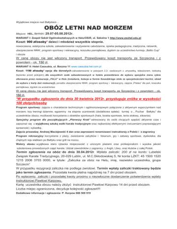 Wyjątkowe miejsce nad Bałtykiem… OBÓZ LETNI NAD MORZEM Miejsce: HEL, termin: 29.07-05.08.2012r. WARIANT I: Zespół Szkół Ogólnokształcących w Helu/OSiR, ul. Szkolna 1 http://www.zsohel.edu.pl Koszt: 990 zł/osoby* dzieci i młodzież wszystkie stopnie. nowoczesna, estetyczna szkoła, zakwaterowanie i wyżywienie całodzienne, opieka pedagogiczna, medyczna, ratownik, ubezpieczenie NNW, program sportowy i rekreacyjny, koszulka pamiątkowa, dyplom za uczestnictwo turnieju „Baltic Cup” i obozie W cenę obozu nie jest wliczony transport. Przewidywany koszt transportu ze Szczecina i z powrotem - ok. 150 zł. WARIANT II: Hotel Cassubia, ul. Boczna 11 www.cassubia.hel.com.pl Koszt: 1190 zł/osoby* opcja dla dorosłych zakwaterowanie w pokojach 2,3- osobowych z umywalką, telewizorem, lodówką (łazienka przed pokojem), dla wszystkich osób zakwaterowanych w hotelu przewidziano do wyboru specjalne menu rybne oferowane przez restaurację „FALA” w Helu (śniadanie, kolacja w formie Szwedzkiego stołu ze specjalnościami kuchni, obiad do wyboru z karty dań restauracji), ponadto ubezpieczenie NNW, program sportowy i rekreacyjny, zajęcia „Pilates” dla pań, koszulka pamiątkowa, dyplom za uczestnictwo W cenę obozu nie jest wliczony transport. Przewidywany koszt transportu ze Szczecina i z powrotem - ok. 150 zł. *W przypadku zgłoszenia do dnia 30 kwietnia 2012r. przysługuje zniżka w wysokości 100 złotych/osoby Program sportowy: zajęcia o charakterze technicznym i ogólnorozwojowym połączone z aktywnym wypoczynkiem nad morzem; trzy treningi dziennie; egzaminy na stopnie uczniowski (dodatkowa opłata); turniej o „ Puchar Bałtyku” dla uczestników obozu; możliwość korzystania z obiektów sportowych (hala, boiska sportowe, tenis stołowy, siłownia) Specjalny program dla początkujących „Pierwszy Krok” adresowany do osób chcących spędzić aktywnie czas i zapoznać się z wyjątkową sztuką walki karate tradycyjnym oraz najbardziej efektywnymi ćwiczeniami poprawiającymi sprawność i sylwetkę. Zajęcia prowadzą: Andrzej Maciejewski 4 dan oraz zaproszeni renomowani instruktorzy z Polski i z zagranicy Program rekreacyjny: korzystanie z plaży, zwiedzanie zabytków i fokarium, gry i zabawy sportowe, dyskoteka; dla chętnych rejs statkiem po Bałtyku oraz grill na morzu. Walory obozu: wyjątkowa staro rybacka miejscowość z uroczymi plażami oraz profesjonalizm i wysoka jakość szkoleniowa prowadzonych zajęć karate. Udział zawodników z zagranicy: z Anglii, Litwy, oraz klubów z całej Polski. Termin zgłoszenia na obóz: do dnia 30.04.2012r. Wpłata zaliczki: 200 zł na konto: Lubelski Związek Karate Tradycyjnego, 20-029 Lublin, ul. M.C.Skłodowskiej 5, Nr konta LZKT: 45 1500 1520 1215 2006 3703 0000, w tytule: „Zaliczka za obóz na Helu, imię, nazwisko uczestnika, grupa Szczecin” W przypadku rezygnacji zaliczka nie podlega zwrotowi. Termin wpłaty zaliczki traktowany będzie jako termin zgłoszenia. Pozostała kwota płatna najpóźniej na 7 dni przed obozem. Po wpłaceniu zaliczki i pozostałej kwoty prosimy o niezwłoczne dostarczenie potwierdzenia wpłaty instruktorowi Pawłowi Karpowu. Kartę uczestnika obozu należy złożyć instruktorowi Pawłowi Karpowu 14 dni przed obozem. Liczba miejsc ograniczona, decyduje kolejność zgłoszeń!!! Dodatkowe informacje i zgłoszenia: P. Karpow 666 500 919