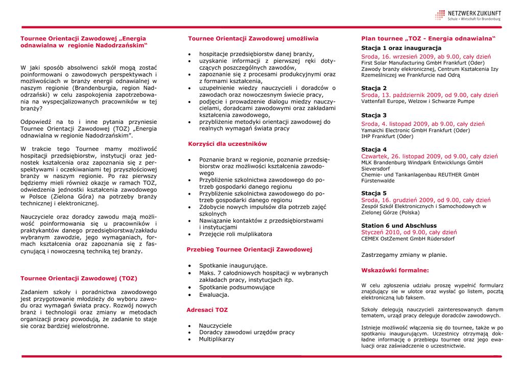 Tournee Orientacji Zawodowej „Energia odnawialna w regionie Nadodrzańskim“ Tournee Orientacji Zawodowej umożliwia Stacja 1 oraz inauguracja • • W jaki sposób absolwenci szkół mogą zostać poinformowani o zawodowych perspektywach i możliwościach w branży energii odnawialnej w naszym regionie (Brandenburgia, region Nadodrzański) w celu zaspokojenia zapotrzebowania na wyspecjalizowanych pracowników w tej branży? Odpowiedź na to i inne pytania przyniesie Tournee Orientacji Zawodowej (TOZ) „Energia odnawialna w regionie Nadodrzańskim”. W trakcie tego Tournee mamy możliwość hospitacji przedsiębiorstw, instytucji oraz jednostek kształcenia oraz zapoznania się z perspektywami i oczekiwaniami tej przyszłościowej branży w naszym regionie. Po raz pierwszy będziemy mieli również okazje w ramach TOZ, odwiedzenia jednostki kształcenia zawodowego w Polsce (Zielona Góra) na potrzeby branży technicznej i elektronicznej. Nauczyciele oraz doradcy zawodu mają możliwość poinformowania się u pracowników i praktykantów danego przedsiębiorstwa/zakładu wybranym zawodzie, jego wymaganiach, formach kształcenia oraz zapoznania się z fascynującą i nowoczesną techniką tej branży. Tournee Orientacji Zawodowej (TOZ) Zadaniem szkoły i poradnictwa zawodowego jest przygotowanie młodzieży do wyboru zawodu oraz wymagań świata pracy. Rozwój nowych branż i technologii oraz zmiany w metodach organizacji pracy powodują, że zadanie to staje sie coraz bardziej wielostronne. Plan tournee „TOZ - Energia odnawialna“ • • • • hospitacje przedsiębiorstw danej branży, uzyskanie informacji z pierwszej ręki dotyczących poszczególnych zawodów, zapoznanie się z procesami produkcyjnymi oraz z formami kształcenia, uzupełnienie wiedzy nauczycieli i doradców o zawodach oraz nowoczesnym świecie pracy, podjęcie i prowadzenie dialogu miedzy nauczycielami, doradcami zawodowymi oraz zakładami kształcenia zawodowego, przybliżenie metodyki orientacji zawodowej do realnych wymagań świata pracy Sroda, 16. wrzesień 2009, ab 9.00, cały dzień First Solar Manufacturing GmbH Frankfurt (Oder) Zawody branży elekronicznej, Centrum Kształcenia Izy Rzemeślniczej we Frankfurcie nad Odrą Stacja 2 Sroda, 13. październik 2009, od 9.00, cały dzień Vattenfall Europe, Welzow i Schwarze Pumpe Stacja 3 Sroda, 4. listopad 2009, ab 9.00, cały dzień Yamaichi Electronic GmbH Frankfurt (Oder) IHP Frankfurt (Oder) Korzyści dla uczestników • • • • • • Poznanie branż w regionie, poznanie przedsiębiorstw oraz możliwości kształcenia zawodowego Przybliżenie szkolnictwa zawodowego do potrzeb gospodarki danego regionu Przybliżenie szkolnictwa zawodowego do potrzeb gospodarki danego regionu Zdobycie nowych impulsów dla potrzeb zajęć szkolnych Nawiązanie kontaktów z przedsiębiorstwami i instytucjami Przejęcie roli mulplikatora Stacja 4 Czwartek, 26. listopad 2009, od 9.00, cały dzień MLK Brandenburg Windpark Entwicklungs GmbH Sieversdorf Chemie- und Tankanlagenbau REUTHER GmbH Fürstenwalde Stacja 5 Sroda, 16. grudzień 2009, od 9.00, cały dzień Zespół Szkół Elektronicznych i Samochodowych w Zielonej Górze (Polska) Station 6 und Abschluss Styczeń 2010, od 9.00, cały dzień CEMEX OstZement GmbH Rüdersdorf Przebieg Tournee Orientacji Zawodowej Zastrzegamy zmiany w planie. • • • • Spotkanie inaugurujące. Maks. 7 całodniowych hospitacji w wybranych zakładach pracy, instytucjach itp. Spotkanie podsumowujące Ewaluacja. Adresaci TOZ • • • Nauczyciele Doradcy zawodowi urzędów pracy Multiplikarzy Wskazówki formalne: W celu zgłoszenia udziału proszę wypełnić formularz znajdujący sie w ulotce oraz wysłać go listem, pocztą elektroniczną lub faksem. Szkoły delegują nauczycieli zainteresowanych danym tematem, urząd pracy deleguje doradców zawodowych. Istnieje możliwość włączenia się do tournee, także w po spotkaniu inaugurującym. Uczestnicy otrzymają dokładne informację o przebiegu tournee oraz jego ewaluacji oraz zaświadczenie o uczestnictwie. Osoba odpowiedzialna: Telefon: Fax Email: Torsten Weyer 0049170 9519672 0049331 – 2010-999 [email protected] Netzwerk Zukunft. Schule und Wirtschaft für Brandenburg e.V. Breite Str. 2d 14467 Potsdam Tournee Orientacji Zawodowej „Energia odnawialna w regionie Nadodrzańskim“ Realizowane przez „Netzwerk Zukunft. Schule und Wirtschaft für Brandenburg e.V.“ przy współpracy ze związkiem „Przedszkole-Szkoła-Gospodarka w regionie Odra-Sprewa” Tournee Orientacji Zawodowej 2009/2010 Energia odnawialna w regionie Nadodrzańskim Przedsiębiorstwa, zakłady, instytucje Zgłoszenie na Tournee Orientacji Zawodowej „Regeneratywne Energie w regionie nadodrzańskim“ Ja/my zgłaszamy udział . ... osób W stacji. ... Tournee. ______________________________________________ Szkoła/Instytucja ______________________________________________ Imię i nazwisko ______________________________________________ Adres ______________________________________________ Telefon/poczta elektroniczna ______________________________________________ Data/podpis MLK Windpark Sieversdorf GmbH + Co. KG Zespol Szkol Elektronicznych i Samochodowych w Zielonej Górze, Polska Dziękujemy za pomoc Izbie Przemysłowo-Handlowej oraz Izbie Rzemieślniczej w Brandenburgii Wschodniej Pomysł i koncept Inwestycja na przyszłość Seria szkoleń dla nauczycieli, doradców zawodowych i multiplikatorów