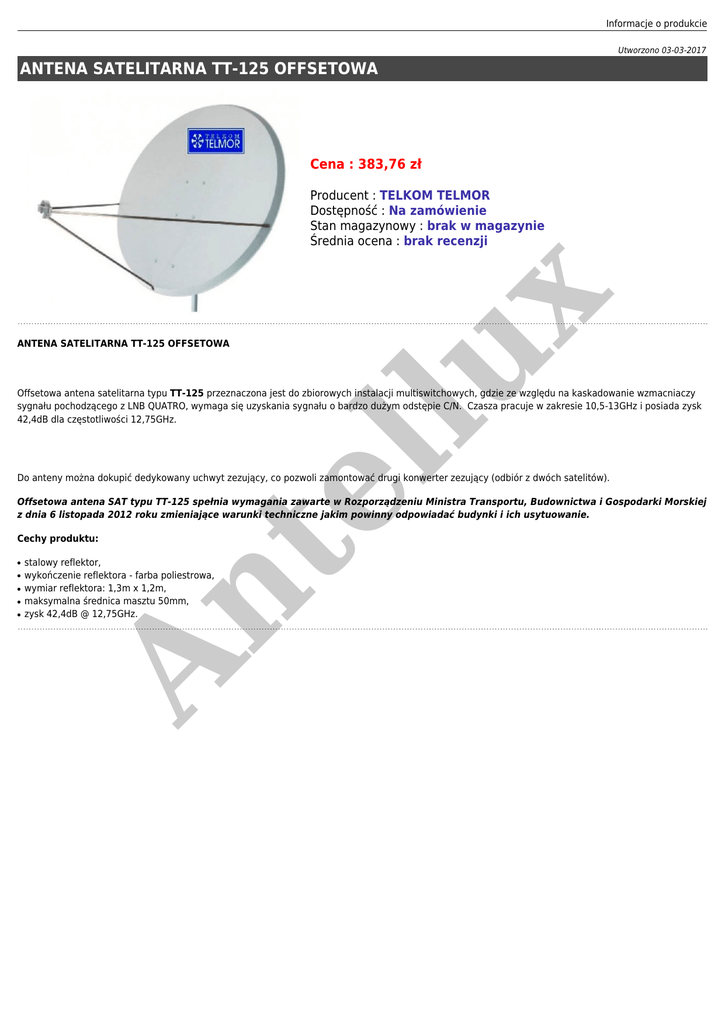 Informacje o produkcie Utworzono 03-03-2017 ANTENA SATELITARNA TT-125 OFFSETOWA Cena : 383,76 zł lu ANTENA SATELITARNA TT-125 OFFSETOWA x Producent : TELKOM TELMOR Dostępność : Na zamówienie Stan magazynowy : brak w magazynie Średnia ocena : brak recenzji te l Offsetowa antena satelitarna typu TT-125 przeznaczona jest do zbiorowych instalacji multiswitchowych, gdzie ze względu na kaskadowanie wzmacniaczy sygnału pochodzącego z LNB QUATRO, wymaga się uzyskania sygnału o bardzo dużym odstępie C/N. Czasza pracuje w zakresie 10,5-13GHz i posiada zysk 42,4dB dla częstotliwości 12,75GHz. Do anteny można dokupić dedykowany uchwyt zezujący, co pozwoli zamontować drugi konwerter zezujący (odbiór z dwóch satelitów). Offsetowa antena SAT typu TT-125 spełnia wymagania zawarte w Rozporządzeniu Ministra Transportu, Budownictwa i Gospodarki Morskiej z dnia 6 listopada 2012 roku zmieniające warunki techniczne jakim powinny odpowiadać budynki i ich usytuowanie. Cechy produktu: ● ● ● ● stalowy reflektor, wykończenie reflektora - farba poliestrowa, wymiar reflektora: 1,3m x 1,2m, maksymalna średnica masztu 50mm, zysk 42,4dB @ 12,75GHz. An ●