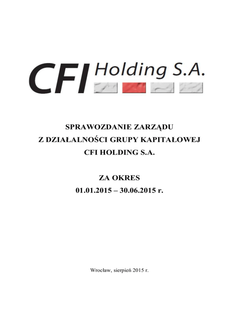 SPRAWOZDANIE ZARZĄDU Z DZIAŁALNOŚCI GRUPY KAPITAŁOWEJ CFI HOLDING S.A. ZA OKRES 01.01.2015 – 30.06.2015 r. Wrocław, sierpień 2015 r. Sprawozdanie Zarządu z działalności GRUPY KAPITAŁOWEJ CFI HOLDING S.A. za okres od 01.01.2015r. do 30.06.2015r. SPIS TREŚCI: 1. Podstawowe informacje o Grupie Kapitałowej ............................................................3 2.1. Dane rejestracyjne i adresowe podmiotu dominującego.......................................3 2.2. Informacje o powiązaniach kapitałowych lub organizacyjnych z innymi podmiotami .......................................................................................................................4 2.3. Podstawowe informacje o spółkach zależnych ......................................................5 2.4. Przedmiot działalności Grupy Kapitałowej...........................................................6 2.5. Kapitał zakładowy podmiotu dominującego .........................................................8 2.6. Rada Nadzorcza......................................................................................................9 2.7. Zarząd ................................................................................................................... 10 2.8. Rekompensaty dla osób zarządzających w przypadku rezygnacji lub zwolnienia z zajmowanego stanowiska bez ważnej przyczyny ........................................................ 11 2. Podstawowe dane ekonomiczno-finansowe Grupy Kapitałowej CFI HOLDING S.A. za I półrocze 2015 roku ...................................................................................................... 11 3. Charakterystyka działalności w I półroczu 2014 roku ............................................... 13 4. Najważniejsi odbiorcy w I półroczu 2015 roku .......................................................... 13 5. Budowy o największym poziomie przerobu w I półroczu 2015 roku ........................ 13 6. Najważniejsi dostawcy w I półroczu 2015 roku.......................................................... 13 7. Zawarte znaczące umowy i umowy zawarte pomiędzy akcjonariuszami ................. 13 8. Transakcje z podmiotami powiązanymi ..................................................................... 14 9. Informacje o zaciągniętych i wypowiedzianych umowach dotyczących kredytów i pożyczek ............................................................................................................................ 14 10. Informacje o udzielonych pożyczkach, poręczeniach i gwarancjach ........................ 15 11. Sprawy sądowe ............................................................................................................ 15 12. Istotne czynniki ryzyka ............................................................................................... 15 13. Emisja akcji i wykorzystanie wpływów z emisji......................................................... 18 14. Informacja dotycząca prognozy wyników .................................................................. 18 15. Zarządzanie zasobami finansowymi ........................................................................... 18 16. Ocena czynników nietypowych i zdarzeń mających wpływ na wynik....................... 19 17. Charakterystyka zewnętrznych i wewnętrznych czynników istotnych dla rozwoju Spółki oraz opis perspektyw rozwoju działalności ............................................................ 19 18. Zmiany w podstawowych zasadach zarządzania w Grupie Kapitałowej .................. 19 19. Liczba i wartość nominalna wszystkich akcji CFI HOLDING SA będących w posiadaniu osób nadzorujących i zarządzających ............................................................ 19 20. Informacje o znanych umowach, w wyniku których mogą w przyszłości nastąpić zmiany w proporcjach posiadanych akcji przez dotychczasowych akcjonariuszy ......... 20 21. Informacje o systemie kontroli programów akcji pracowniczych ............................. 20 22. Informacje o dacie zawarcia umowy z podmiotem uprawnionym do przeglądu sprawozdań finansowych, wynagrodzeniu za przegląd za I półrocze 2015 ...................... 20 23. Pozycje pozabilansowe ................................................................................................ 20 2 Sprawozdanie Zarządu z działalności GRUPY KAPITAŁOWEJ CFI HOLDING S.A. za okres od 01.01.2015r. do 30.06.2015r. Wprowadzenie do sprawozdania Sprawozdanie Zarządu z działalności Grupy Kapitałowej CFI Holding za I półrocze 2015 roku zostało przygotowane przy zastosowaniu zasad rachunkowości, zgodnie z Międzynarodowymi Standardami Sprawozdawczości Finansowej, które zostały zatwierdzone przez Unię Europejska oraz w zakresie wymaganym przez rozporządzenie Ministra Finansów z dnia 19 lutego 2009 roku w sprawie informacji bieżących i okresowych przekazywanych przez emitentów papierów wartościowych (Dz. U. Nr 33, poz. 259). 1. Podstawowe informacje o Grupie Kapitałowej 2.1. Dane rejestracyjne i adresowe podmiotu dominującego Podmiot dominujący Grupy Kapitałowej działa pod nazwą CFI HOLDING Spółka Akcyjna (nazwa skrócona CFI HOLDING S.A.) i jest wpisany do rejestru przedsiębiorców Krajowego Rejestru Sądowego prowadzonego przez Sąd Rejonowy dla Wrocławia Fabrycznej we Wrocławiu, VI Wydział Gospodarczy, pod numerem 0000292030. 6 marca 2015 roku zmieniła się nazwa spółki z INTAKUS S.A. na CFI Holding S.A. Siedziba Spółki znajduje się we Wrocławiu przy ul. Teatralnej. Biura Zarządu znajdują się we Wrocławiu przy ul. Teatralnej 10-12. Spółka ma nadany numer identyfikacji podatkowej NIP 898-10-51-431 i otrzymała numer identyfikacyjny REGON 930175372. Spółka prowadzi swoją stronę internetową www.cfiholding.pl 3 Sprawozdanie Zarządu z działalności GRUPY KAPITAŁOWEJ CFI HOLDING S.A. za okres od 01.01.2015r. do 30.06.2015r. 2.2. Informacje o powiązaniach k