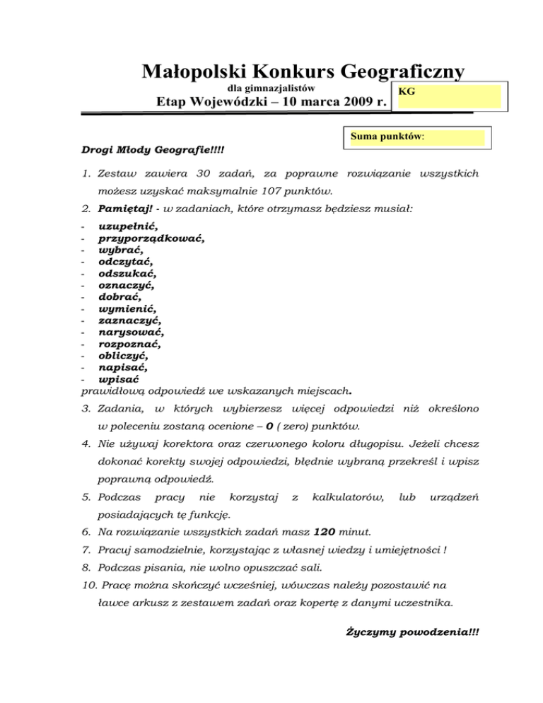 Małopolski Konkurs Geograficzny dla gimnazjalistów KG Etap Wojewódzki – 10 marca 2009 r. Suma punktów: Drogi Młody Geografie!!!! 1. Zestaw zawiera 30 zadań, za poprawne rozwiązanie wszystkich moŜesz uzyskać maksymalnie 107 punktów. 2. Pamiętaj! - w zadaniach, które otrzymasz będziesz musiał: - uzupełnić, - przyporządkować, - wybrać, - odczytać, - odszukać, - oznaczyć, - dobrać, - wymienić, - zaznaczyć, - narysować, - rozpoznać, - obliczyć, - napisać, - wpisać prawidłową odpowiedź we wskazanych miejscach. 3. Zadania, w których wybierzesz więcej odpowiedzi niŜ określono w poleceniu zostaną ocenione – 0 ( zero) punktów. 4. Nie uŜywaj korektora oraz czerwonego koloru długopisu. JeŜeli chcesz dokonać korekty swojej odpowiedzi, błędnie wybraną przekreśl i wpisz poprawną odpowiedź. 5. Podczas pracy nie korzystaj z kalkulatorów, lub urządzeń posiadających tę funkcję. 6. Na rozwiązanie wszystkich zadań masz 120 minut. 7. Pracuj samodzielnie, korzystając z własnej wiedzy i umiejętności ! 8. Podczas pisania, nie wolno opuszczać sali. 10. Pracę moŜna skończyć wcześniej, wówczas naleŜy pozostawić na ławce arkusz z zestawem zadań oraz kopertę z danymi uczestnika. śyczymy powodzenia!!! Zadanie 1. (0 – 6 pkt.) Uporządkuj podane poniŜej skale od największej do najmniejszej. a) 1: 500 000 d) 1 mm – 2 km b) 1 cm – 2 km e) 1 : 300 000 c) 1 : 1 000 000 f) 1 cm – 500 m 1. ....................... 2. ....................... 3. ....................... 4. ....................... 5. ....................... 6. ....................... Zadanie 2. (0 – 1 pkt) Oblicz i wybierz odpowiedź, która informuje jaką powierzchnię zajmuje jezioro na mapie w skali 1: 200 000, jeŜeli jego powierzchnia w terenie wynosi 56,8 km2. a) 14,2 cm2 b) 28,4 cm2 c) 56,8 cm2 d) 142 cm2 Zadanie 3. (0 – 11 pkt.) Korzystając z mapy okolic Szczawnicy (Załącznik nr 1) wykonaj polecenia A - H. A. Określ kierunek, w którym znajduje się miejscowość Leszczyny w stosunku do miejscowości Staszowa. ………………………………………… B. Korzystając ze skali mapy oblicz szerokość doliny Grajcarka w terenie w zaznaczonym na mapie miejscu – odcinek A – B. ………………………………………… C. Odczytaj na jakiej wysokości bezwzględnej połoŜony jest punkt C (w pobliŜu Leszczyny). ………………………………………… D. Oblicz wysokość względną, którą pokonasz wchodząc najkrótszą drogą z doliny Grajcarka na szczyt Jarmuta. (Uwaga: nie Jarmutka!) ………………………………………… E. Napisz nazwę góry, którą widzi turysta patrząc w kierunku północno-wschodnim ze szczytu Bryjarka. ………………………………………… F. Odszukaj na mapie opisane poniŜej obiekty geograficzne i wpisz w zaznaczone miejsca ich nazwy. • Potok, na którym znajduje się wodospad Zaskalnik. ……………………………………… • Góra, na wierzchołek której moŜesz dojechać wyciągiem krzesełkowym. ……………………………………… • Góra, na stoku której znajduje się nieczynna sztolnia. ……………………………………… G. Wymień dwa obiekty kultury materialnej, które moŜe zwiedzić turysta na terenie objętym mapą. ………………………………………………………………………………………… H. Wymień cztery rodzaje usług, z których moŜe skorzystać turysta przebywając w Szczawnicy. 1. ……………………………… 3. ……………………………… 2. ……………………………… 4. ................................................ Zadanie 4. (0 – 3 pkt.) Korzystając z mapy okolic Szczawnicy (Załącznik nr 1) wykonaj polecenia A - C. A. Zaznacz zgodnie z legendą w odpowiednim miejscu na mapie Przełęcz Maćkówki, która znajduje się w pobliŜu Palenicy. B. Zaznacz strzałką na mapie bieg Grajcarka. C. Narysuj trasę marszu z punktu D w okolicy Staszowej do punktu E w okolicy Niterbaku tak, aby prowadziła na tej samej wysokości. Wpisz wartość narysowanej w ten sposób poziomicy. Zadanie 5. (0 – 1 pkt) Statek płynący z portu A do portu B dnia12 maja przekroczył międzynarodową linie zmiany daty. Korzystając z zamieszczonego poniŜej rysunku wybierz odpowiedź, która informuje jaką datę powinien wpisać kapitan statku do dziennika pokładowego po północy. Kapitan statku powinien zapisać datę: a) 14 maja b) 12 maja c) 13 maja d) 11 maja Zadanie 6. (0 – 5 pkt.) Wymienionym nazwom tamy lub hydroelektrowni przyporządkuj nazwę rzeki, na której znajduje się dany obiekt. Rzeki do wyboru: Dunajec, San, Parana, Jenisej, Jangcy, Zambezi, Nil, a) Zapora Trzech Przełomów ………………………………… b) Itaipu ………………………………… c) Wielka Tama Asuańska ………………………………… d) Solina ………………………………… e) Krasnojarska ………………………………… Zadanie 7. (0 – 1 pkt) Wybierz odpowiedź, która informuje, jakie obszary Ziemi objęto nazwą Antarktyka. a) Wody oceanów otaczających Antarktydę do 66°30’S. b) Obszar wysp i oceanów wokół bieguna północnego do 66°30’N. c) Antarktydę i otaczające ją wody oceanów oraz połoŜone na nich wyspy do około 55°S. d) Antarktydę oraz otaczające ją wyspy połoŜone do 66°30’S. Zadanie 8. (0 –2 pkt.) Oblicz gęstość zaludnienia w Australii i w Singapurze i wpisz wynik do tabeli. Państwo Australia Singapur Powierzchnia w tys. km2 7692,2 0,7 Ludność w tys. Gęstość zaludnienia Osób/km2 20857 4564 Źródło: Rocznik Statystyczny RP GUS 2008 Zadanie 9. (0 – 8 pkt.) Wszystkie wymienione poniŜej nazwy regionów geograficznych świata wpisz odpowiednio do tabeli według podanego w pierwszej kolumnie kryterium przyporządkowania. Regiony: Kotlina Kalahari, Antarktyda, Grenlandia, Jawa, Nizina Gangesu, WyŜyna Śląska, Okr