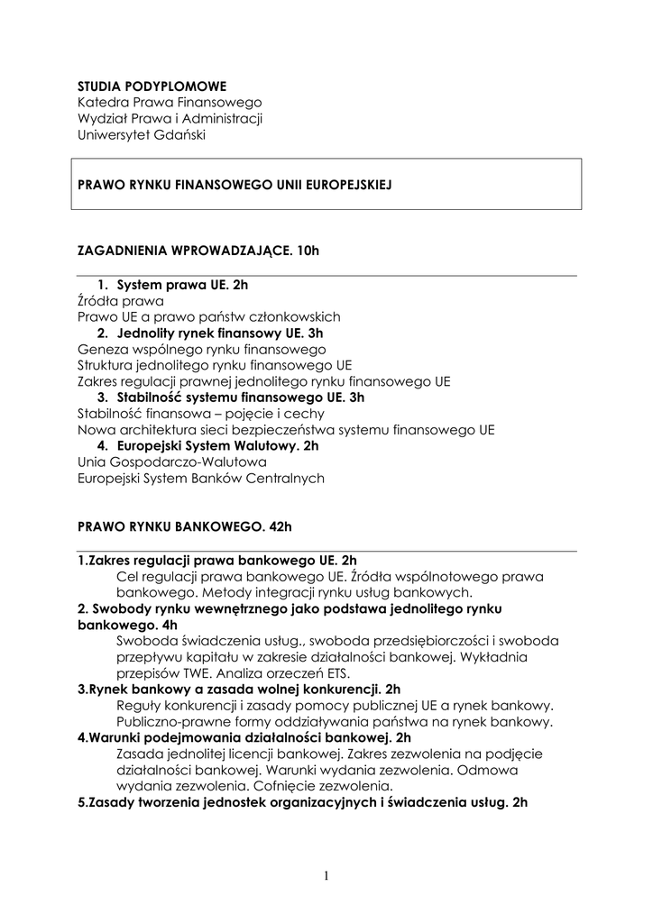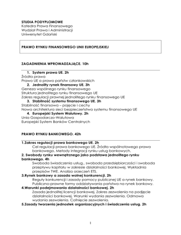 STUDIA PODYPLOMOWE Katedra Prawa Finansowego Wydział Prawa i Administracji Uniwersytet Gdański PRAWO RYNKU FINANSOWEGO UNII EUROPEJSKIEJ ZAGADNIENIA WPROWADZAJĄCE. 10h 1. System prawa UE. 2h Źródła prawa Prawo UE a prawo państw członkowskich 2. Jednolity rynek finansowy UE. 3h Geneza wspólnego rynku finansowego Struktura jednolitego rynku finansowego UE Zakres regulacji prawnej jednolitego rynku finansowego UE 3. Stabilność systemu finansowego UE. 3h Stabilność finansowa – pojęcie i cechy Nowa architektura sieci bezpieczeństwa systemu finansowego UE 4. Europejski System Walutowy. 2h Unia Gospodarczo-Walutowa Europejski System Banków Centralnych PRAWO RYNKU BANKOWEGO. 42h 1.Zakres regulacji prawa bankowego UE. 2h Cel regulacji prawa bankowego UE. Źródła wspólnotowego prawa bankowego. Metody integracji rynku usług bankowych. 2. Swobody rynku wewnętrznego jako podstawa jednolitego rynku bankowego. 4h Swoboda świadczenia usług., swoboda przedsiębiorczości i swoboda przepływu kapitału w zakresie działalności bankowej. Wykładnia przepisów TWE. Analiza orzeczeń ETS. 3.Rynek bankowy a zasada wolnej konkurencji. 2h Reguły konkurencji i zasady pomocy publicznej UE a rynek bankowy. Publiczno-prawne formy oddziaływania państwa na rynek bankowy. 4.Warunki podejmowania działalności bankowej. 2h Zasada jednolitej licencji bankowej. Zakres zezwolenia na podjęcie działalności bankowej. Warunki wydania zezwolenia. Odmowa wydania zezwolenia. Cofnięcie zezwolenia. 5.Zasady tworzenia jednostek organizacyjnych i świadczenia usług. 2h 1 Warunki utworzenia przedstawicielstwa, oddziału i filii instytucji kredytowej. Warunki prowadzenia działalności na zasadzie swobody świadczenia usług. 6.Sieć bezpieczeństwa rynku bankowego. 8h Bank centralny jako poŜyczkodawca ostatniej instancji. Nadzór nad rynkiem bankowym. Właściwość i jurysdykcja władz nadzorczych. Regulacje ostroŜnościowe. Adekwatność kapitalowa (Bazylea II). System gwarantowanie depozytów bankowych. 7. Elektroniczne instrumenty płatnicze. 6h Cel i zakres regulacji. Rodzaje instrumentów płatniczych. Karty płatnicze. Pieniądz elektroniczny. Usługi bankowości elektronicznej. 8. Jednolity Europejski Obszar Płatniczy. 4h Dyrektywa o usługach płatniczych (Payment Services Directive; PSD). Rodzaje usług płatniczych, dostawcy usług płatniczych (instytucje płatnicze), zasady podejmowania działalności i świadczenia usług płatniczych w UE. ZałoŜenia SEPA (Single Euro Payment Area), instrumenty SEPA. 9. Ochrona konsumenta na rynku bankowym. 4h Kredyt konsumencki, świadczenie usług finansowych na odległość. Ochrona konsumenta usług inwestycyjnych świadczonych przez banki w ramach dyrektywy MiFID. 10. Usługi finansowe w zakresie kapitału wysokiego ryzyka. 8 h (alternatywne formy finansowania przedsiębiorczości) Metody i instrumenty finansowania przedsiębiorców. Fundusze poŜyczkowe dla MSP. Fundusze poręczeń kredytowych. Fundusze private equity/venture capital. PRAWO RYNKU UBEZPIECZENIOWEGO. 38 h 1.Zagadnienia ogólne. 2h Źródła wspólnotowego prawa ubezpieczeniowego. Metody integracji rynku ubezpieczeniowego. Ewolucja prawa ubezpieczeniowego (podział na sektory). 2. Swobody gospodarcze jako fundamenty wspólnego rynku ubezpieczeniowego. 6h Swoboda przedsiębiorczości a rynek ubezpieczeniowy. Tzw. pierwsze dyrektywy ubezpieczeniowe wyrazem ułatwienia wykorzystania swobody przedsiębiorczości na rynku ubezpieczeniowym. Analiza orzeczeń ETS. Swoboda świadczenia usług a rynek ubezpieczeniowy. Sposoby korzystania z tej swobody na rynku ubezpieczeniowym. Tzw. drugie dyrektywy ubezpieczeniowe wyrazem ułatwienia wykorzystania 2 swobody świadczenia usług. MoŜliwości ograniczenia swobód przez państwa członkowskie. Analiza orzeczeń ETS. Swoboda przepływu kapitału a rynek ubezpieczeniowy. Analiza orzeczeń ETS (swoboda przepływu kapitału a swoboda przepływu usług). 3.Wolna konkurencja a rynek ubezpieczeniowy. 2h Zasady konkurencji. Zwolnienia blokowe (kategorie porozumień). 4. Znaczenie zasady jednolitej licencji dla funkcjonowania jednolitego rynku ubezpieczeniowego. 2h Zakres zezwolenia na podjęcie działalności ubezpieczeniowej. Warunki konieczne i dopuszczalne wydania zezwolenia. Odmowa wydania zezwolenia. Warunki utworzenia oddziału. Warunki prowadzenia działalności na zasadzie swobody świadczenia usług – zasada „otwartego okienka” (dyrektywy trzeciej generacji). 5. Nadzór nad rynkiem ubezpieczeniowym. 2h Zasada nadzoru państwa macierzystego. Właściwe organy i cele nadzoru finansowego. Zakres nadzoru i jego ograniczenia. 6. Solvency II jako nowa filozofia gwarancji wypłacalności ubezpieczycieli 2h Solvency I a Solvency II. Główne cele i załoŜenia. Trzy fillary. 7. Świadczenie ochrony ubezpieczeniowej. 6h Podstawowe pojęcia (ryzyko ubezpieczeniowe, wypadek ubezpieczeniowy, suma ubezpieczenia tp.). Strony umowy ubezpieczenia i ich obowiązki. Powstanie i wygaśnięcie stosunku ubezpieczenia. Świadczenie ubezpieczeniowe, jego rodzaje i sposoby ograniczania jego wysokości (franszyza, udział własny). Rola i charakter prawny ogólnych warunków ubezpieczenia, wniosku ubezpieczeniowego i polisy ubezpieczeniowej. Zakres ochrony ubezpieczeniowej. Zasady ustalania właściwości prawa. 8. Samorząd ubezpieczeniowy w UE. 2h Zadania, cele i rola ubezpieczeniowego samorządu gospodarczego w Europie. Samorządowe stowarzyszenia zakładów ubezpieczeń w państwach członkowskich UE. 9. Bancassurance jako forma współpracy na rynku finansowym. 2h Formy bankowości ubezpieczeniowej. Zalety i wady z punktu widzenia ubezpieczyciela, banku i ubezpieczonego. Perspektywy rozowoju. 10. Direct ubezpieczenia. 2h Rodzaje ubezpieczeń zawieranych przez Internet. Wady i zalety sprzedaŜy bezpośredniej. Kierunki rozwoju. 11.Sposoby podziału ryzyka ubezpieczeniowego. 2h Koasekuracja. Reasekuracja i retrocesja. Pool ubezpieczeniowy. Captive. 12. T
