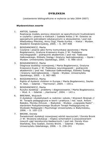 DYSLEKSJA (zestawienie bibliograficzne w wyborze za lata 2004-2007) Wydawnictwa zwarte 1. ANTOS, Izabela Realizacja modelu pomocy dzieciom ze specyficznymi trudnościami w czytaniu i pisaniu w Kielcach / Izabela Antos // W: Dziecko ze specjalnymi potrzebami edukacyjnymi w ekosystemie / pod red. Władysławy Pileckiej, Anny Ozgi, Pawła Kurtka. – Kielce : Wydaw. Akademii Świętokrzyskiej, 2005. – S. 397-408 2. BOGDANOWICZ, Marta Czytanie i pisanie jako formy komunikacji językowej / Marta Bogdanowicz, Grażyna Krasowicz-Kupis // W: Podstawy neurologopedii : podręcznik akademicki / pod red. Tadeusza Gałkowskiego, Elżbiety Szeląg i Grażyny Jastrzębowskiej. – Opole : Wydaw. Uniwersytetu Opolskiego, 2005. – S. 986-1015 3. BOGDANOWICZ, Marta Diagnoza dysleksji rozwojowej / Marta Bogdanowicz, Grażyna Krasowicz-Kupis // W: Podstawy neurologopedii : podręcznik akademicki / pod red. Tadeusza Gałkowskiego, Elżbiety Szaląg i Grażyny Jastrzębowskiej. – Opole : Wydaw. Uniwersytetu Opolskiego, 2005. – S. 967-985 4. BOGDANOWICZ, Marta Rights of dyslexic children in Europe / Marta Bogdanowicz, Sayles H. Alan. – Gdańsk : “Harmonia”, 2004. – 155 s. 5. BOGDANOWICZ, Marta Ryzyko dysleksji : problemy i diagnozowanie / Marta Bogdanowicz. – Wyd. 4. – Gdańsk : „Harmonia”, 2004. – 143 s. 6. BREJNAK, Wojciech O dysleksji i dyslektykach w rodzinie i szkole / Wojciech Brejnak // W: Terapia pedagogiczna w teorii i praktyce / red. nauk. Antoni Balejko, Monika Zińczuk. – Białystok : Wydaw. „Logopeda Radzi” : staraniem Podyplomowego Studium Terapii Pedagogicznej na Wydziale Pedagogiki i Psychologii Uniwersytetu w Białymstoku, 2006. – S. 105-115 7. BRONK, Dorota Świadomość dysleksji rozwojowej wśród nauczycieli / Dorota Bronk // W: Wczesna edukacja : między schematem a poszukiwaniem nowych ujęć teoretyczno-badawczych / pod red. Doroty KlusStańskiej, Ewy Szatan, Doroty Bronk. – Gdańsk : Wydaw. Uniwersytetu Gdańskiego, 2006. – S. 236-241 8. BUTKIEWICZ, Anna M. Dyslexia in the English classroom : techniki nauczania języka angielskiego uczniów z dysleksją / Anna Butkiewicz, Katarzyna Bogdanowicz. – Wyd. 2. – Gdańsk : „Harmonia”, 2006. – 95 s. 9. CIESZYŃSKA, Jadwiga Nauka czytania krok po kroku : jak przeciwdziałać dysleksji / Jadwiga Cieszyńska. – Wyd. 2 popr. i poszerz. – Kraków : Wydaw. Naukowe Akademii Pedagogicznej, 2005. – 139 s. 10. ĆWICZENIA w czytaniu i pisaniu : poradnik metodyczny do terapii dzieci dyslektycznych / Krystyna Grabałowska [et al.]. – Wyd. 3. – Toruń : Towarzystwo Naukowe Organizacji i Kierownictwa „Dom Organizatora”, 2005. – 324 s. 11. DAVIS, Ronald D. Dar uczenia się : sprawdzona nowa metoda korekcji ADD, problemów z matematyką i pisaniem odręcznym / Ronald D. Davis, Eldon M. Braun. – Poznań : Zysk i S-ka Wydaw., cop. 2006. – 380 s. 12. DAWID, Dorota Rozwijanie kreatywności uczniów dyslektycznych na lekcjach języka polskiego w klasach IV-VI szkoły podstawowej : [scenariusze zajęć] / Dorota Dawid. – Kraków : „Impuls”, 2004. – 89 s. 13. DŁUGOSZ, Małgorzata Zastosowanie Testu Językowego „Leksykon” w diagnozie uczniów dyslektycznych / Małgorzata Długosz, Bożena Rejnowska-Wawryn // W: Dysleksja : problem znany czy nieznany? / red. Małgorzata Kostka-Szymańska, Grażyna Krasowicz-Kupis. – Lublin : Wydaw. Uniwersytetu Marii Curie-Skłodowskiej, 2007. – S. 137-145 Materiały z konferencji naukowej „Dysleksja rozwojowa – problem znany czy nieznany?” zorg. przez Instytut Psychologii UMCS przy współpr. z Lubelskim Oddziałem Polskiego Towarzystwa Dysleksji, Lublin, 24-26 października 2005 r. 14. DYLON, Ewa Edukacja multimedialna – wykorzystanie edukacyjnych programów komputerowych w terapii pedagogicznej / Ewa Dylon // W: Dysleksja : problem znany czy nieznany? / red. Małgorzata Kostka-Szymańska, Grażyna Krasowicz-Kupis. – Lublin : Wydaw. Uniwersytetu Marii Curie-Skłodowskiej, 2007. – S. 353-359 Materiały z konferencji naukowej „Dysleksja rozwojowa – problem znany czy nieznany?” zorg. przez Instytut Psychologii UMCS przy współpr. z Lubelskim Oddziałem Polskiego Towarzystwa Dysleksji, Lublin, 24-26 października 2005 r. 15. DYRDA, Jolanta Style uczenia się dzieci dyslektycznych a wymagania poznawcze szkoły / Jolanta Dyrda. – Wyd. 2 zm. – Gdańsk : Wydaw. Uniwersytetu Gdańskiego, 2004. – 165 s. 16. DYSLEKSJA : problem znany czy nieznany? / red. Małgorzata Kostka-Szymańska, Grażyna Krasowicz-Kupis. – Lublin : Wydaw. Uniwersytetu Marii Curie-Skłodowskiej, 2007. – 359 s. 17. DYSLEKSJA w kontekście nauczania języków obcych / pod red. Marty Bogdanowicz i Marioli Smoleń. – Gdańsk : „Harmonia”, 2004. – 221 s. 18. FORYŚ, Maria Zdolności osób z dysleksją : przegląd literatury obcojęzycznej / Maria Foryś // W: Dylematy edukacji artystycznej. T. 2, Edukacja artystyczna a potencjał twórczy człowieka / pod red. nauk. Wiesławy Limont i Kamilli Nielek-Zawadzkiej. – Kraków : „Impuls”, 2006. – S. 64-81 19. GABINIEWICZ, Jolanta Wspomaganie rozwoju dziecka 9-letniego z ryzykiem dysleksji / Jolanta Gabiniewicz // W: Edukacja elementarna szansą nowej jakości wychowania [T. 2] / pod red. Andrzeja Cichockiego. – Białystok : „Trans Humana”, 2005. – S. 129-138 20. JAROSZ, Ewa Diagnoza psychopedagogiczna : podstawowe problemy i rozwiązania / Ewa Jarosz, Ewa Wysocka. – Warszawa : „Żak”, 2006. – 428 s. 21. JĘDRYKA-PLESIŃSKA, Marta Możliwości poprawy jakości życia dzieci ze specyficznymi trudnościami w uczeniu się / Marta Jędryka-Plesińska // W: Jakość życia w niepełnosprawności : mity a rzeczywistość / pod red. Marii Flanczewskiej-Wolny. – Gliwice : Kolegium Nauczycielskie ; Kraków : „Impuls”, 2007. – S. 135-139 Materiały z Międzynarodowej Konferencji Naukowej w Gliwicach, 24-25 maja 2005 r. 22. JĘDRZEJOWSKA, Ewa Profilaktyka, wczesna diagnoza i interwencja w przypa