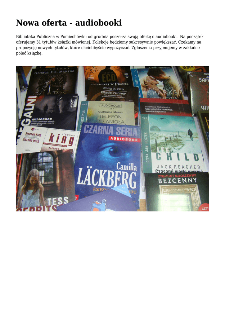Nowa oferta - audiobooki Biblioteka Publiczna w Pomiechówku od grudnia poszerza swoją ofertę o audiobooki. Na początek oferujemy 31 tytułów książki mówionej. Kolekcję będziemy sukcesywnie powiększać. Czekamy na propozycję nowych tytułów, które chcielibyście wypożyczać. Zgłoszenia przyjmujemy w zakładce poleć książkę.