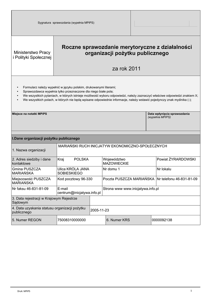 6\JQDWXUDVSUDZR]GDQLDZ\SHáQLD 6\JQDWXUDVSUDZR]GDQLDZ\SHáQLD03L36 MPiPS) Ministerstwo Pracy L3ROLW\NL6SRáHF]QHM 5RF]QHVSUDZR]GDQLHPHU\WRU\F]QH]G]LDáDOQRĞFL RUJDQL]DFMLSRĪ\WNXSXEOLF]QHJR za rok 2011 • • • • )RUPXODU]QDOHĪ\Z\SHáQLüZMĊ]\NXSROVNLPGUXNRZDQ\PLOLWHUDPL 6SUDZR]GDZFDZ\SHáQLDW\ONRSU]H]QDF]RQHGODQLHJRELDáHSROD :HZV]\VWNLFKS\WDQLDFKZNWyU\FKLVWQLHMHPRĪOLZRĞüZ\ERUXRGSRZLHG]LQDOHĪ\]D]QDF]\üZáDĞFLZHRGSRZLHG]L]QDNLHP; :HZV]\VWNLFKSRODFKZNWyU\FKQLHEĊGąZSLVDQHRGSRZLHGQLHLQIRUPDFMHQDOHĪ\ZVWDZLüSRMHG\QF]\]QDNP\ĞOQLND 'DWDZSá\QLĊFLDVSUDZR]GDQLD Z\SHáQLD03L36 Miejsce na notatki MPiPS ,'DQHRUJDQL]DFMLSRĪ\WNXSXEOLF]QHJR 0$5,$ē6.,58&+,1,&-$7<:(.2120,&=12632à(&=1<&+ 1. Nazwa organizacji Województwo MAZOWIECKIE 3RZLDWĩ<5$5'2:6., Ulica KRÓLA JANA SOBIESKIEGO Nr domu 1 Nr lokalu 0LHMVFRZRĞü386=&=$ 0$5,$ē6.$ Kod pocztowy 96-330 3RF]WD386=&=$0$5,$ē6.$ Nr telefonu 46-831-81-09 Nr faksu 46-831-81-09 E-mail Strona www www.inicjatywa.info.pl [email protected] 2. Adres siedziby i dane kontaktowe Kraj Gmina PUSZCZA 0$5,$ē6.$ POLSKA 3. Data rejestracji w Krajowym Rejestrze 6ąGRZ\P 'DWDX]\VNDQLDVWDWXVXRUJDQL]DFMLSRĪ\WNX publicznego 5. Numer REGON Druk: MPiPS 75008310000000 2005-11-23 6. Numer KRS 0000092138 1 6NáDGRUJDQX]DU]ąG]DMąFHJRRUJDQL]DFML 1DOHĪ\ZSLVDüLPLRQDQD]ZLVNDRUD]LQIRUPDFMHRIXQNFML SHáQLRQHMSU]H]SRV]F]HJyOQ\FKF]áRQNyZRUJDQX ]DU]ąG]DMąFHJR .U]\V]WRI0DWXVLDN3UH]HV=DU]ąGX =RILD2JURGQLN:LFHSUH]HV=DU]ąGX /HV]HN.DUNXFLĔVNL:LFHSUH]HV=DU]ąGX %RĪHQDàXNDVLN-ĊGU]HMHZVND&]áRQHN=DU]ąGX $QGU]HM/XEHFNL&]áRQHN=DU]ąGX 6NáDGRUJDQXNRQWUROLOXEQDG]RUXRUJDQL]DFML -DFHN=DZDG]NL3U]HZRGQLF]ąF\.RPLVML5HZL]\MQHM 1DOHĪ\ZSLVDüLPLRQDQD]ZLVNDRUD]LQIRUPDFMHRIXQNFML 0LURVáDZDàDGD&]áRQHN.RPLVML5HZL]\MQHM SHáQLRQHMSU]H]SRV]F]HJyOQ\FKF]áRQNyZRUJDQXNRQWUROL $QGU]HM'RPDJDáD&]áRQHN.RPLVML5HZL]\MQHM lub nadzoru) 9. Cele statutowe organizacji 1DOHĪ\RSLVDüFHOHQDSRGVWDZLHVWDWXWXRUJDQL]DFML Druk: MPiPS 2 1']LDáDQLDQDU]HF]UR]ZRMXHNRQRPLF]QRVSRáHF]QHJR*PLQ\ 3XV]F]D0DULDĔVNDL5HJLRQXSRSUDZ\SR]LRPXĪ\FLDLGREURE\WX PLHV]NDĔFyZ 2:VSRPDJDQLDUR]ZRMXSU\ZDWQHMSU]HGVLĊELRUF]RĞFL samozatrudnienia i restrukturyzacji zawodowej terenów wiejskich, promocja agrobiznesu i agroturystyki. 3. Promocji zatrudnienia i aktywizacji zawodowej osób SR]RVWDMąF\FKEH]SUDF\L]DJURĪRQ\FK]ZROQLHQLHP]SUDF\ 43RPRF\ZDGDSWDFMLPDá\FKLĞUHGQLFKSU]HGVLĊELRUVWZGR warunków rynkowych i wymogów Wspólnoty Europejskiej. 53URPRFMLG]LDáDMąF\FKQDWHUHQLH*PLQ\L5HJLRQXSRGPLRWyZ gospodarczych. 6']LDáDQLDQDU]HF]UR]ZRMXV\VWHPXZVSDUFLDRUJDQL]DF\MQHJR ILQDQVRZHJRLU]HF]RZHJRGODQRZRSRZVWDMąF\FKRUD]PDá\FKL ĞUHGQLFKSU]HGVLĊELRUVWZ 7']LDáDQLDQDU]HF]WZRU]HQLDJPLQQHMUHJLRQDOQHML SRQDGUHJLRQDOQHMVWUDWHJLLUR]ZRMXHNRQRPLF]QRVSRáHF]QHJR LQLFMRZDQLHZVSyáSUDF\LNRRSHUDFML 8. Wspomagania inicjatyw naukowych, edukacyjnych i RĞZLDWRZ\FK 97XU\VW\NLNUDMR]QDZVWZDRUD]Z\SRF]\QNXG]LHFLLPáRG]LHĪ\ 10. Promocji i organizacji wolontariatu. 11']LDáDQLDQDU]HF]RVyEQLHSHáQRVSUDZQ\FK 12. Podtrzymywania i upowszechniania tradycji narodowej, SLHOĊJQRZDQLDSROVNRĞFLRUD]UR]ZRMXĞZLDGRPRĞFLQDURGRZHM obywatelskiej i kulturowej. 138SRZV]HFKQLDQLDLRFKURQ\ZROQRĞFLLSUDZF]áRZLHNDRUD] VZREyGRE\ZDWHOVNLFKDWDNĪHG]LDáDĔZVSRPDJDMąF\FKUR]ZyM demokracji. 14']LDáDĔQDU]HF]LQWHJUDFMLHXURSHMVNLHMRUD]UR]ZLMDQLD NRQWDNWyZLZVSyáSUDF\PLĊG]\VSRáHF]HĔVWZDPL 15(NRORJLLLRFKURQ\]ZLHU]ąWRUD]RFKURQ\G]LHG]LFWZD przyrodniczego. 16. Kultury, sztuki, ochrony dóbr kultury i dziedzictwa narodowego. 17. Wspierania i upowszechniania kultury fizycznej. 183RPRF\VSRáHF]QHMZW\PSRPRF\URG]LQRPLRVRERPZ WUXGQHMV\WXDFMLĪ\FLRZHMRUD]Z\UyZQ\ZDQLDV]DQVW\FKURG]LQL osób. 19']LDáDOQRĞFLQDU]HF]LQWHJUDFMLLUHLQWHJUDFML]DZRGRZHML VSRáHF]QHMRVyE]DJURĪRQ\FKZ\NOXF]HQLHPVSRáHF]Q\P 20']LDáDOQRĞFLZVSRPDJDMąFHMUR]ZyMWHFKQLNLZ\QDOD]F]RĞFLL LQQRZDF\MQRĞFLRUD]UR]SRZV]HFKQLDQLHLZGUDĪDQLHQRZ\FK UR]ZLą]DĔWHFKQLF]Q\FKZSUDNW\FHJRVSRGDUF]HM 21']LDáDOQRĞFLZVSRPDJDMąFHMUR]ZyMZVSyOQRWLVSRáHF]QRĞFL lokalnych. 223URPRFML5]HF]\SRVSROLWHM3ROVNLHM]DJUDQLFą 23']LDáDOQRĞFLQDU]HF]RUJDQL]DFMLSR]DU]ąGRZ\FKRUD] podmiotów wymienionych w art. 3 ust. 38VWDZ\RG]LDáDOQRĞFL SRĪ\WNXSXEOLF]QHJRLRZRORQWDULDFLH]GQ24.04.2003U]SyĨQ ]PZ]DNUHVLHRNUHĞORQ\PZSNW1-22. Druk: MPiPS 3 10. Sposób realizacji celów statutowych organizacji 1DOHĪ\RSLVDüVSRVyEUHDOL]DFMLFHOyZVWDWXWRZ\FK organizacji na podstawie statutu organizacji) 1DMZDĪQLHMV]HVIHU\G]LDáDOQRĞFLSRĪ\WNX publicznego 1DOHĪ\ZVND]DüQLHZLĊFHMQLĪWU]\QDMZDĪQLHMV]HSRG Z]JOĊGHPZLHONRĞFLZ\GDWNRZDQ\FKĞURGNyZVIHU\ G]LDáDOQRĞFLSRĪ\WNXSXEOLF]QHJRRNWyU\FKPRZDZDUW XVWXVWDZ\]GQLDNZLHWQLDURG]LDáDOQRĞFL SRĪ\WNXSXEOLF]QHJRLRZRORQWDULDFLH(Dz. U. z 2010 r. Nr 234, poz. 1536), ]DF]\QDMąFRGQDMZDĪQLHMV]HM 13URZDG]HQLHV]NROHĔG]LDáDOQRĞFLLQIRUPDF\MQHMLGRUDGF]HMZ zakresie samozatrudnienia, agrobiznesu, agroturystyki i tworzenia PDáHJRSU]HGVLĊELRUVWZD 23URZDG]HQLHG]LDáDOQRĞFLZ\GDZQLF]HM 32UJDQL]RZDQLH]HEUDĔRGF]\WyZNRQIHUHQFMLV\PSR]MyZ NRQNXUVyZLV]NROHĔ 4,QLFMRZDQLHEDGDĔQDGUR]ZRMHPORNDOQ\PLUHJLRQDOQ\P SU]HGVLĊELRUF]RĞFLą]PLDQDPLVWUXNWXUDOQ\PLU\QNLHPSUDF\ 5:VSyáSUDFDLZVSyáG]LDáDQLH]6DPRU]ąGHPDGPLQLVWUDFMą WHUHQRZąLFHQWUDOQąRUD]LQQ\PLNUDMRZ\PLL]DJUDQLF]Q\PL instytucjami w zakresie realizacji celów statutowych. 6. Pozyskiwanie funduszy publicznych i prywatnych na finansowanie podejmowanych inicjatyw. 72EHMPRZDQLHRSLHNąRUJDQL]DF\MQąLNVLĊJRZąLQLFMDW\Z VSRáHF]Q\FKSRGHMPRZDQ\FKSU]H]PLHV]NDĔFyZ*PLQ\L5HJLRQX 8ĝZLDGF]HQLHXVáXJZ]DNUHVLHREVáXJLELXURZHMQDU]HF] VSRáHF]QRĞFLORNDOQHM QDXNDV]NROQLFWZRZ\ĪV]HHGXNDFMDRĞZLDWDLZ\FKRZDQLH G]LDáDOQRĞüZVSRPDJDMąFDUR]ZyMJRVSRGDUF]\ZW\PUR]ZyM SU]HGVLĊELRUF]RĞFL podtrzymywanie i upowszechnianie tradycji narodowej, SLHOĊJQRZDQLHSROVNRĞFLRUD]UR]ZyMĞZLDGRPRĞFLQDURGRZHM obywatelskiej i kulturowej ,,&KDUDNWHU\VW\NDG]LDáDOQRĞFLRUJDQL]DFMLSRĪ\WNXSXEOLF]QHJRZRNUHVLHVSUDZR]GDZF]\P 2SLVG]LDáDOQRĞFLSRĪ\WNXSXEOLF]QHJR 2SLVJáyZQ\FKG]LDáDĔ SRGMĊW\FKSU]H]RUJDQL]DFMĊ Druk: