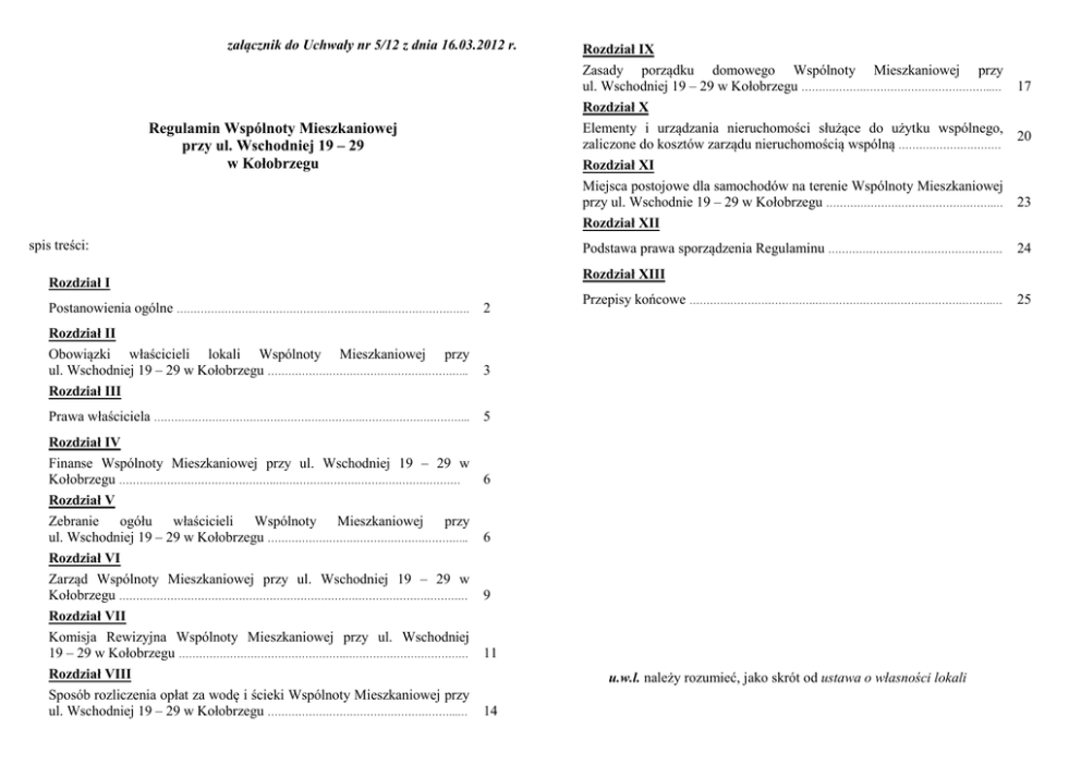 załącznik do Uchwały nr 5/12 z dnia 16.03.2012 r. Regulamin Wspólnoty Mieszkaniowej przy ul. Wschodniej 19 – 29 w Kołobrzegu spis treści: Podstawa prawa sporządzenia Regulaminu …………………………………………… 2 Przepisy końcowe ……………………………….…………………………………………….… Rozdział II Obowiązki właścicieli lokali Wspólnoty Mieszkaniowej przy ul. Wschodniej 19 – 29 w Kołobrzegu ………………………………………………….. 3 Rozdział III Prawa właściciela …………………………………………………….………………………….. 5 Rozdział IV Finanse Wspólnoty Mieszkaniowej przy ul. Wschodniej 19 – 29 w Kołobrzegu ……………………………………….……………………………………………… Rozdział V Zebranie ogółu właścicieli Wspólnoty Mieszkaniowej przy ul. Wschodniej 19 – 29 w Kołobrzegu ………………………………………………….. Rozdział VI Zarząd Wspólnoty Mieszkaniowej przy ul. Wschodniej 19 – 29 w Kołobrzegu ………………………………………………………………………………………… Rozdział VII Komisja Rewizyjna Wspólnoty Mieszkaniowej przy ul. Wschodniej 19 – 29 w Kołobrzegu ………………………………………….……………………………… Rozdział VIII Sposób rozliczenia opłat za wodę i ścieki Wspólnoty Mieszkaniowej przy ul. Wschodniej 19 – 29 w Kołobrzegu ………………………………………………..… 24 Rozdział XIII Rozdział I Postanowienia ogólne …………………………………………………….……………………. Rozdział IX Zasady porządku domowego Wspólnoty Mieszkaniowej przy ul. Wschodniej 19 – 29 w Kołobrzegu ………………………………………………..… 17 Rozdział X Elementy i urządzania nieruchomości służące do użytku wspólnego, 20 zaliczone do kosztów zarządu nieruchomością wspólną ………………………… Rozdział XI Miejsca postojowe dla samochodów na terenie Wspólnoty Mieszkaniowej przy ul. Wschodnie 19 – 29 w Kołobrzegu ………………………………………….… 23 Rozdział XII 6 6 9 11 u.w.l. należy rozumieć, jako skrót od ustawa o własności lokali 14 25 Rozdział I Postanowienia ogólne §1 1.Regulamin Wspólnoty Mieszkaniowej przy ul. Wschodniej 19 – 29 w Kołobrzegu określa prawa i obowiązki członków wspólnoty oraz zasady zarządzania nieruchomością. 2.W zakresie nieunormowanym niniejszym Regulaminem stosuje się przepisy obowiązującego prawa. §2 1.Wspólnotę Mieszkaniową przy ul. Wschodniej 19 – 29 w Kołobrzegu tworzy ogół właścicieli lokali mieszkalnych i użytkowych wchodzących w skład nieruchomości położonej w Kołobrzegu przy ulicy Wschodniej numery klatek schodowych: 19, 21, 23, 25, 27 i 29 na działce nr 5/25 (powierzchnia działki 15604 m2), obręb 14, księga wieczysta nr KO1L/00023197/9, prowadzona jest przez Sąd Rejonowy w Kołobrzegu Wydział Ksiąg Wieczystych art. 6 u.w.l.. 2.Wspólnota Mieszkaniowa może nabywać prawa i zaciągać zobowiązania, pozywać i być pozywana art. 6 u.w.l.. 3.Właścicielem lokalu jest osoba fizyczna, grono osób fizycznych lub osoba prawna posiadająca tytuł do własności, co najmniej jednego lokalu w nieruchomości, o której mowa w § 2 ustępie 1. 4.Wspólnota Mieszkaniowa może nabywać prawa i obowiązki do własnego majątku. 5.Wspólnota Mieszkaniowa zleca, w drodze umowy cywilno – prawnej, zarządzanie – administrowanie nieruchomością licencjonowanemu podmiotowi, zwanemu dalej „zarządcą/administratorem”. 6.Treść umowy o zarządzanie nieruchomością wspólną, Zarząd przedstawia do wiadomości i akceptacji ogółu właścicieli. 7.Adres siedziby zarządcy/administratora jest jednocześnie siedzibą i adresem Wspólnoty Mieszkaniowej. §3 1.Organami Wspólnoty Mieszkaniowej są: a) zebranie ogółu właścicieli lokali, b) Zarząd Wspólnoty Mieszkaniowej, 2.Wspołwłaściciele nieruchomości przy ul. Wschodniej 19 – 29 w Kołobrzegu mogą w drodze uchwały powołać Komisje rewizyjną wyłonioną z grona właścicieli. Rozdział II Obowiązki właścicieli lokali Wspólnoty Mieszkaniowej przy ul. Wschodniej 19 – 29 w Kołobrzegu §4 1.Właściciele lokali wchodzących w skład Wspólnoty Mieszkaniowej uczestniczą w zarządzaniu nieruchomością wspólną bezpośrednio poprzez udział w zebraniach ogółu właścicieli głosując za przyjęciem lub odrzuceniem uchwał zgłoszonych przez Zarząd, jak również właścicieli, albo w innej formie. 2.Właściciel ma obowiązek zgłoszenia zarządcy/administratorowi adresu do korespondencji i telefonu kontaktowego w sytuacji, gdy nie zamieszkuje w lokalu na stałe. 3.Właściciel lokalu ma prawo do współkorzystania z części wspólnej nieruchomości zgodnie z jej przeznaczeniem art. 12 ustęp 1 u.w.l.. 4.Pożytki i inne przychody z nieruchomości wspólnej służą pokrywaniu wydatków związanych z jej utrzymaniem, a w części przekraczającej te potrzeby przypadają właścicielom lokali proporcjonalnie do ich udziałów art. 12 ustęp 2 u.w.l.. 5.W takim samym stosunku właściciele lokali ponoszą wydatki i ciężary związane z utrzymaniem nieruchomości wspólnej w części nie znajdującej pokrycia w pożytkach i innych przychodach art. 12 ustęp 2 u.w.l.. 6.Właściciel ma obowiązek zgłaszać zarządcy/administratorowi, w ciągu 1 miesiąca od zaistnienia wszelkie zmiany dotyczące liczby osób zamieszkujących lokal, mające istotny wpływ na wysokość zaliczek liczonych od osoby, a także o zamiarze zbycia lokalu. §5 1.Właściciel ponosi koszty utrzymania swojego lokalu i części wspólnej oraz obowiązany jest: a) utrzymywać mieszkanie i pomieszczenie przynależne w należytym stanie technicznym i sanitarnym art. 13 ustęp1 u.w.l., b) przestrzegania zasad Por