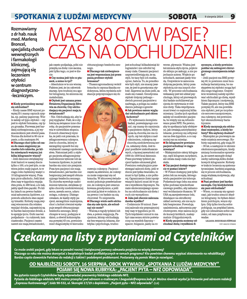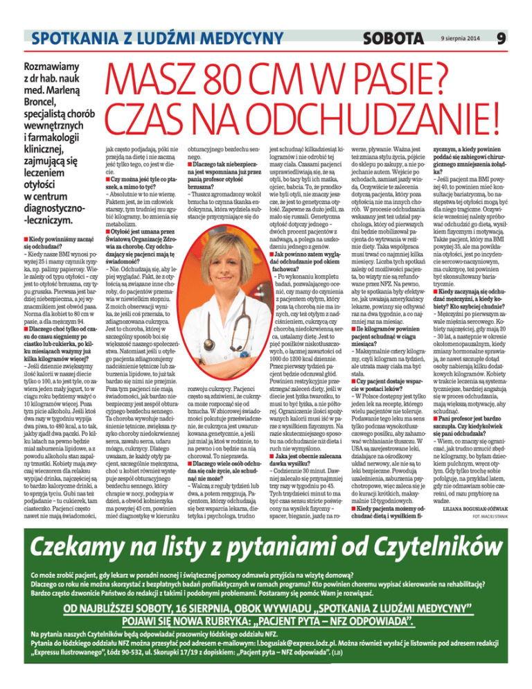 sPOtKania z luDźmi meDyCyny Rozmawiamy z dr hab. nauk med. Marleną Broncel, specjalistą chorób wewnętrznych i farmakologii klinicznej, zajmującą się leczeniem otyłości w centrum diagnostyczno-leczniczym. d Kiedy powinniśmy zacząć się odchudzać? – Kiedy nasze BMI wynosi powyżej 25 i mamy czynnik ryzyka, np. palimy papierosy. Wiele zależy od typu otyłości – czy jest to otyłość brzuszna, czy typu gruszka. Pierwsza jest bardziej niebezpieczna, a jej wyznacznikiem jest obwód pasa. Norma dla kobiet to 80 cm w pasie, a dla mężczyzn 94. d Dlaczego choć tylko od czasu do czasu sięgniemy po ciastko lub cukierka, po kilku miesiącach ważymy już kilka kilogramów więcej? – Jeśli dziennie zwiększymy ilość kalorii w naszej diecie tylko o 100, a to jest tyle, co zawiera jeden mały jogurt, to w ciągu roku będziemy ważyć o 10 kilogramów więcej. Poza tym picie alkoholu. Jeśli ktoś dwa razy w tygodniu wypija dwa piwa, to 480 kcal, a to tak, jakby zjadł dwa pączki. Po kilku latach na pewno będzie miał zaburzenia lipidowe, a z powodu alkoholu stan zapalny trzustki. Kobiety mają zwyczaj wieczorem dla relaksu wypijać drinka, najczęściej są to bardzo kaloryczne drinki, a to sprzyja tyciu. Gubi nas też podjadanie – tu cukierek, tam ciasteczko. Pacjenci często nawet nie mają świadomości, SOBOTA 9 sierpnia 2014 9 MASZ80CMWPASIE? CZASNAODCHUDZANIE! jak często podjadają, póki nie przejdą na dietę i nie zaczną jeść tylko tego, co jest w diecie. d Czy można jeść tyle co ptaszek, a mimo to tyć? – Absolutnie w to nie wierzę. Faktem jest, że im człowiek starszy, tym trudniej mu zgubić kilogramy, bo zmienia się metabolizm. d Otyłość jest uznana przez Światową Organizację Zdrowia za chorobę. Czy odchudzający się pacjenci mają tę świadomość? – Nie. Odchudzają się, aby lepiej wyglądać. Fakt, że z otyłością są związane inne choroby, do pacjentów przemawia w niewielkim stopniu. Z moich obserwacji wynika, że jeśli coś przeraża, to zdiagnozowana cukrzyca. Jest to choroba, której w szczególny sposób boi się większość naszego społeczeństwa. Natomiast jeśli u otyłego pacjenta zdiagnozujemy nadciśnienie tętnicze lub zaburzenia lipidowe, to już tak bardzo się nimi nie przejmie. Poza tym pacjenci nie mają świadomości, jak bardzo niebezpieczny jest zespół obturacyjnego bezdechu sennego. Ta choroba wywołuje nadciśnienie tętnicze, zwiększa ryzyko choroby niedokrwiennej serca, zawału serca, udaru mózgu, cukrzycy. Dlatego uważam, że każdy otyły pacjent, szczególnie mężczyzna, choć u kobiet również występuje zespół obturacyjnego bezdechu sennego, który chrapie w nocy, podsypia w dzień, a obwód kołnierzyka ma powyżej 43 cm, powinien mieć diagnostykę w kierunku obturacyjnego bezdechu sennego. d Dlaczego tak niebezpieczna jest wspomniana już przez panią profesor otyłość brzuszna? – Tłuszcz zgromadzony wokół brzucha to czynna tkanka endokrynna, która wydziela substancje przyczyniające się do rozwoju cukrzycy. Pacjenci często są zdziwieni, że cukrzyca może rozpocząć się od brzucha. W zbiorowej świadomości pokutuje przeświadczenie, że cukrzyca jest uwarunkowana genetycznie, a jeśli już miał ją ktoś w rodzinie, to na pewno i on będzie na nią chorował. To nieprawda. d Dlaczego wiele osób odchudza się całe życie, ale schudnąć nie może? – Walczą z reguły tydzień lub dwa, a potem rezygnują. Pacjentom, którzy odchudzają się bez wsparcia lekarza, dietetyka i psychologa, trudno jest schudnąć kilkadziesiąt kilogramów i nie odrobić tej masy ciała. Czasami pacjenci usprawiedliwiają się, że są otyli, bo tacy byli ich matka, ojciec, babcia. To, że przodkowie byli otyli, nie znaczy jeszcze, że jest to genetyczna otyłość. Zapewne za dużo jedli, za mało się ruszali. Genetyczna otyłość dotyczy jednego – dwóch procent pacjentów z nadwagą, a polega na uszkodzeniu jednego z genów. d Jak powinno zatem wyglądać odchudzanie pod okiem fachowca? – Po wykonaniu kompletu badań, pozwalającego ocenić, czy mamy do czynienia z pacjentem otyłym, który poza tą chorobą nie ma innych, czy też otyłym z nadciśnieniem, cukrzycą czy chorobą niedokrwienną serca, ustalamy dietę. Jest to pięć posiłków niskotłuszczowych, o łącznej zawartości od 1000 do 1200 kcal dziennie. Przez pierwszy tydzień pacjent będzie odczuwał głód. Powinien restrykcyjnie przestrzegać zaleceń diety, jeśli w diecie jest łyżka twarożku, to musi to być łyżka, a nie półtorej. Ograniczenie ilości spożywanych kalorii musi iść w parze z wysiłkiem fizycznym. Na razie skuteczniejszego sposobu na odchudzanie niż dieta i ruch nie wymyślono. d Jaka jest obecnie zalecana dawka wysiłku? – Codziennie 30 minut. Dawniej zalecało się przynajmniej trzy razy w tygodniu po 45. Tych trzydzieści minut to ma być czas sensu stricte poświęcony na wysiłek fizyczny – spacer, bieganie, jazdę na ro- werze, pływanie. Ważna jest też zmiana stylu życia, pójście do sklepu po zakupy, a nie pojechanie autem. Wejście po schodach, zamiast jazdy windą. Oczywiście te zalecenia dotyczą pacjenta, który poza otyłością nie ma innych chorób. W procesie odchudzania wskazany jest też udział psychologa, który od pierwszych dni będzie mobilizował pacjenta do wytrwania w reżimie diety. Taka współpraca musi trwać co najmniej kilka miesięcy. Liczba tych spotkań zależy od możliwości pacjenta, bo wizyty nie są refundowane przez NFZ. Na pewno, aby te spotkania były efektywne, jak uważają amerykańscy lekarze, powinny się odbywać raz na dwa tygodnie, a co najmniej raz na miesiąc. d Ile kilogramów powinien pacjent schudnąć w ciągu miesiąca? – Maksymalnie cztery kilogramy, czyli kilogram na tydzień, ale utrata masy ciała ma być stała. d Czy pacjent dostaje wsparcie w postaci leków? – W Polsce dostępny jest tylko jeden lek na rec