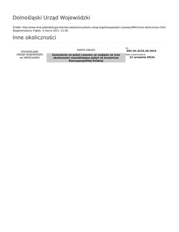 Dolnośląski Urząd Wojewódzki Źródło: http://www.duw.pl/pl/obsluga-klienta/cudzoziemcy/karty-uslug-legalizacja/pobyt-czasowy/9943,Inne-okolicznosci.html Wygenerowano: Piątek, 3 marca 2017, 21:56 Inne okoliczności DOLNOŚLĄSKI URZĄD WOJEWÓDZKI we WROCŁAWIU KARTA USŁUGI Zezwolenie na pobyt czasowy ze względu na inne okoliczności uzasadniające pobyt na terytorium Rzeczypospolitej Polskiej Nr: SOC-SC.0133.20.2014 Data zatwierdzenia: 12 września 2014r. Zezwolenia na pobyt czasowy ze względu na inne okoliczności udziela się cudzoziemcowi, jeżeli: 1. zamierza jako członek rodziny zamieszkiwać na terytorium Rzeczypospolitej Polskiej wspólnie z pracownikiem migrującym, o którym mowa w pkt 19 części I i art. 19 części II Europejskiej Karty Społecznej, sporządzonej w Turynie dnia 18 października 1961 r. (Dz. U. z 1999 r. Nr 8, poz. 67, z 2010 r. Nr 76, poz. 491 oraz z 2011 r. Nr 168, poz. 1007), lub z prowadzącym na tym terytorium działalność gospodarczą na własny rachunek cudzoziemcem, o którym mowa w art. 19 ust. 10 części II Europejskiej Karty Społecznej, sporządzonej w Turynie dnia 18 października 1961 r., jeżeli posiada: a). ubezpieczenie zdrowotne w rozumieniu ustawy z dnia 27 sierpnia 2004 r. o świadczeniach opieki zdrowotnej finansowanych ze środków publicznych lub potwierdzenie pokrycia przez ubezpieczyciela kosztów leczenia na terytorium Rzeczypospolitej Polskiej; b). źródło stabilnego i regularnego dochodu wystarczającego na pokrycie kosztów utrzymania siebie i członków rodziny pozostających na jego utrzymaniu. 2. jest urodzonym na terytorium Rzeczypospolitej Polskiej małoletnim dzieckiem cudzoziemca przebywającym na tym terytorium bez opieki, lub 3. posiada zezwolenie na pobyt rezydenta długoterminowego UE udzielone przez inne państwo członkowskie Unii Europejskiej oraz: 1. zamierza wykonywać pracę lub prowadzić działalność gospodarczą na terytorium Rzeczypospolitej Polskiej na podstawie przepisów obowiązujących w tym zakresie na tym terytorium lub 2. zamierza podjąć lub kontynuować na terytorium Rzeczypospolitej Polskiej studia lub szkolenie zawodowe, lub 3. wykaże, że zachodzą inne okoliczności uzasadniające jego zamieszkiwanie na terytorium Rzeczypospolitej Polskiej, jeżeli posiada: • ubezpieczenie zdrowotne w rozumieniu ustawy z dnia 27 sierpnia 2004r. o świadczeniach opieki zdrowotnej finansowanych ze środków publicznych lub potwierdzenie pokrycia przez ubezpieczyciela kosztów leczenia na terytorium Rzeczypospolitej Polskiej; • źródło stabilnego i regularnego dochodu wystarczającego na pokrycie kosztów utrzymania siebie i członków rodziny pozostających na jego utrzymaniu; • zapewnione na terytorium Rzeczypospolitej Polskiej miejsce zamieszkania Co chcę załatwić? 4. jest członkiem rodziny cudzoziemca, o którym mowa w pkt 3, z którym przebywał na terytorium innego państwa członkowskiego Unii Europejskiej i towarzyszy mu lub chce się z nim połączyć, jeżeli posiada: a).ubezpieczenie zdrowotne w rozumieniu ustawy z dnia 27 sierpnia 2004r. o świadczeniach opieki zdrowotnej finansowanych ze środków publicznych lub potwierdzenie pokrycia przez ubezpieczyciela kosztów leczenia na terytorium Rzeczypospolitej Polskiej; b). źródło stabilnego i regularnego dochodu wystarczającego na pokrycie kosztów utrzymania siebie i członków rodziny pozostających na jego utrzymaniu; c). zapewnione na terytorium Rzeczypospolitej Polskiej miejsce zamieszkania. 5. posiada uprawnienie do wykonywania pracy na terytorium Rzeczypospolitej Polskiej na zasadach określonych w decyzji nr 1/80 Rady Stowarzyszenia Republiki Tureckiej i EWG z dnia 19 września 1980 r. w sprawie rozwoju Stowarzyszenia, która to Rada została powołana na podstawie Układu ustanawiającego stowarzyszenie między Europejską Wspólnotą Gospodarczą a Turcją, podpisanego w Ankarze dnia 12 września 1963 r. (Dz. Urz. WE L 217 z 29.12.1964, str. 3685; Dz. Urz. UE Polskie wydanie specjalne, rozdz. 11, t. 11 str. 1), jeżeli posiada: a). ubezpieczenie zdrowotne w rozumieniu ustawy z dnia 27 sierpnia 2004r. świadczeniach opieki zdrowotnej finansowanych ze środków publicznych lub potwierdzenie pokrycia przez ubezpieczyciela kosztów leczenia na terytorium Rzeczypospolitej Polskiej; b). źródło stabilnego i regularnego dochodu wystarczającego na pokrycie kosztów utrzymania siebie i członków rodziny pozostających na jego utrzymaniu; c). zapewnione na terytorium Rzeczypospolitej Polskiej miejsce zamieszkania Zezwolenia na pobyt czasowy ze względu na inne okoliczności można udzielić cudzoziemcowi, jeżeli: 1. jest pokrzywdzonym, o którym mowa w art. 7 ust. 2 pkt 2, lub 2. bezpośrednio przed złożeniem wniosku o udzielenie zezwolenia przebywał na terytorium Rzeczypospolitej Polskiej na podstawie zezwolenia, o którym mowa w pkt 4, do czasu otrzymania zaległego wynagrodzenia od podmiotu powierzającego wykonywanie pracy albo podmiotu, o którym mowa w art. 6 lub art. 7 ustawy z dnia 15 czerwca 2012 r. o skutkach powierzania wykonywania pracy cudzoziemcom przebywającym wbrew przepisom na terytorium Rzeczypospolitej Polskiej jeżeli posiada: • ubezpieczenie zdrowotne w rozumieniu ustawy z dnia 27 sierpnia 2004r. o świadczeniach opieki zdrowotnej finansowanych ze środków publicznych lub potwierdzenie pokrycia przez ubezpieczyciela kosztów leczenia na terytorium Rzeczypospolitej Polskiej; • zapewnione na terytorium Rzeczypospolitej Polskiej miejsce zamieszkania; • ma zapewnione na terytorium Rzeczypospolitej Polskiej utrzymanie. 3. jego pobyt na terytorium Rzeczypospolitej Polskiej jest niezbędny z uwagi na konieczność poszanowania prawa do życia rodzinnego w rozumieniu Konwencji o ochronie praw człowieka i podstawowych wolności, sporządzonej w Rzymie dnia 4 listopada 1950 r., a cudzoziemiec przebywa na terytorium Rzeczypospolitej Polskiej nielegalnie, lub 4. jego wyjazd z terytorium Rzeczyposp