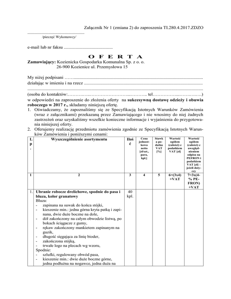 Załącznik Nr 1 (zmiana 2) do zaproszenia TI.280.4.2017.ZDZO ................................................. /pieczęć Wykonawcy/ e-mail lub nr faksu .......................................... O F E R T A Zamawiający: Kozienicka Gospodarka Komunalna Sp. z o. o. 26-900 Kozienice ul. Przemysłowa 15 My niżej podpisani ……............................................................................................................... działając w imieniu i na rzecz ...................................................................................................... ....................................................................................................................................................... (osoba do kontaktów:……….…..……………………...……….. tel……………...…….….….) w odpowiedzi na zaproszenie do złożenia oferty na sukcesywną dostawę odzieży i obuwia roboczego w 2017 r., składamy niniejszą ofertę. 1. Oświadczamy, że zapoznaliśmy się ze Specyfikacją Istotnych Warunków Zamówienia (wraz z załącznikami) przekazaną przez Zamawiającego i nie wnosimy do niej żadnych zastrzeżeń oraz uzyskaliśmy wszelkie konieczne informacje i wyjaśnienia do przygotowania niniejszej oferty. 2. Oferujemy realizację przedmiotu zamówienia zgodnie ze Specyfikacją Istotnych Warunków Zamówienia i poniższymi cenami: L p . Wyszczególnienie asortymentu Iloś ć Cena jednostkowa netto [zł/szt., para, kpl.] Stawk a podatku VAT [%] Wartość ogółem (całości) z podatkiem VAT [zł] Wartość ogółem (całości) z uwzględnieniem odpisu na PEFRON i podatkiem VAT [zł] – jeżeli dotyczy 1 2 3 4 5 6=(3x4) +VAT 7=3x(4% PEFRON) +VAT 1. Ubranie robocze drelichowe, spodnie do pasa i bluza, kolor granatowy Bluza: - zapinana na suwak do końca stójki, - kieszenie min.: jedna górna kryta patką i zapinana, dwie duże boczne na dole, - dół zakończony na całym obwodzie listwą, po bokach ściągacze z gumy, - rękaw zakończony mankietem zapinanym na guzik, - długość sięgająca za linię bioder, - zakończona stójką, - trwałe logo na plecach wg wzoru, Spodnie: - szlufki, regulowany obwód pasa, - kieszenie min.: dwie duże boczne górne, jedna podłużna na nogawce, jedna duża na 40 kpl. drugiej nogawce (udzie) boczna odstająca z patką zapinaną na guzik – tzw. bojówka, - wzmocnienia na kolanach z miejscami na nakolanniki, wkładane od dołu - rozporek zapinany na suwak, pokryty plisą. Tkanina o składzie mieszanki 35-40% poliester, 60-65% bawełna, gramatura tkaniny min. 270 g/m2, kurczliwość do 2%, temperatura prania i suszenia do 60 stopni, możliwość suszenia w suszarkach bębnowych. Podwójne szwy i dodatkowe wzmocnienia (ryglowane zakończenia szwów) w miejscach narażonych na rozerwanie. Trwale umieszczona na rękawach i dole bluzy oraz nogawkach spodni na całym obwodzie certyfikowana taśma odblaskowa o intensywnej widzialności - min. 5 cm szerokości. Trwale umieszczona etykietka określającą nazwę producenta wyrobu, znak CE, rozmiar, skład materiału i temperaturę prania. Spełniające wymagania: EN 340 lub PN-EN ISO 13688:2013-12. 2. Ubranie robocze, spodnie do pasa i bluza, kolor pomarańczowy Pozostałe warunki jak w pkt. 1. 3. Ubranie robocze, typ szwedzki, kolor granatowy Bluza: - zapinana na suwak do końca stójki, - kieszenie min.: jedna górna kryta patką i zapinana, min. dwie duże boczne na dole, - dół zakończony na całym obwodzie listwą, po bokach ściągacze z gumy, - rękaw zakończony mankietem zapinanym na guzik, - zakończona stójką, - trwałe logo na plecach wg wzoru. Spodnie ogrodniczki: - regulowane szelki, na szelkach sprzączki, - kieszenie min.: dwie duże boczne górne, jedna podłużna na nogawce, jedna duża na drugiej nogawce (udzie) boczna odstająca z patką zapinaną na guzik – tzw. bojówka, duża kieszeń w części przedniej zapinana na suwak, - wzmocnienia na kolanach z miejscami na nakolanniki, wkładane od dołu, - rozporek zapinany na suwak, pokryty plisą. Podwójne szwy i dodatkowe wzmocnienia (ryglowane zakończenia szwów) w miejscach narażonych na rozerwanie. Trwale umieszczona na rękawach i dole bluzy oraz nogawkach spodni na całym obwodzie certyfikowana taśma odblaskowa o intensywnej widzialności - min. 5 cm szerokości. 2 kpl. 70 kpl. 2 Trwale umieszczona etykietka określającą nazwę producenta wyrobu, znak CE, rozmiar, skład materiału i temperaturę prania. Spełniające wymagania: EN 340 lub PN-EN ISO 13688:2013-12. 4. Ubranie robocze drelichowe, typ szwedzki, kolor pomarańczowy Buza i spodnie – jak w pkt. 3. 5. Ubranie zimowe, ocieplane, kolor granatowy Bluza: - zapinana na suwak kryty plisą zapinaną na rzepy/napy, - kieszenie min.: jedna górna kryta patką i zapinana, dwie duże boczne na dole - rękaw zakończony mankietem zapinanym na guzik, - ściągacz w pasie (sznurek/guma), - długość 3/4, - zakończona stójką, - z kapturem ocieplanym ściąganym/regulowanym sznurkiem przy części twarzowej, - trwałe logo na plecach wg wzoru. Spodnie ogrodniczki: - regulowane szelki, na szelkach sprzączki, - kieszenie min.: dwie duże boczne górne, jedna podłużna na nogawce, jedna duża na drugiej nogawce (udzie) boczna odstająca z patką zapinaną na guzik – tzw. bojówka, duża kieszeń w części przedniej zapinana na suwak, - wzmocnienia na kolanach z miejscami na nakolanniki, wkładane od dołu - rozporek zapinany na suwak, pokryty plisą. Całość ocieplona włókniną wysoko puszystą o gramaturze min. 150 g/m2, podszewka. Tkanina zewnętrzna o składzie mieszanki 35-40% poliester, 60-65% bawełna, gramatura tkaniny min. 270 g/m2, kurczliwość do 2%, temperatura prania i suszenia do 60 stopni, możliwość suszenia w suszarkach bębnowych. Podwójne szwy i dodatkowe wzmocnienia (ryglowane zakończenia szwów) w miejscach narażonych na rozerwanie. Trwale umieszczona na rękawach i dole bluzy oraz nogawkach spo