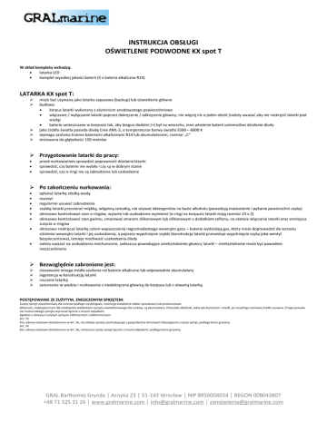 INSTRUKCJA OBSŁUGI OŚWIETLENIE PODWODNE KX spot T W skład kompletu wchodzą: latarka LED komplet wysokiej jakości baterii (3 x bateria alkaliczna R14) LATARKA KX spot T: może być używana jako latarka zapasowa (backup) lub oświetlenie główne budowa: korpus latarki wykonany z aluminium anodowanego powierzchniowo włączanie / wyłączanie latarki poprzez dokręcenie / odkręcenie głowicy, nie więcej niż o jeden obrót (należy uważać aby nie rozkręcić latarki pod wodą) baterie umieszczane w korpusie tak, aby biegun dodatni (+) był na wierzchu, inne włożenie baterii uniemożliwi działanie diody jako źródło światła posiada diodę Cree XML-2, o temperaturze barwy światła 5500 – 6000 K wymaga zasilania trzema bateriami alkalicznymi R14 lub akumulatorami, rozmiar „C” testowana do głębokości 150 metrów Przygotowanie latarki do pracy: przed nurkowaniem sprawdzić poprawność działania latarki sprawdzić, czy baterie nie wylały i czy są w dobrym stanie sprawdzić, czy o-ringi nie są zabrudzone lub uszkodzone Po zakończeniu nurkowania: opłukać latarkę słodką wodą osuszyć regularnie usuwać zabrudzenia szybkę latarki przecierać miękką, wilgotną szmatką, nie używać detergentów na bazie alkoholu (powodują matowienie i pękanie powierzchni szyby) okresowo kontrolować stan o-ringów, wytarte lub uszkodzone wymienić (o-ringi na korpusie latarki mają rozmiar 23 x 2) okresowo kontrolować stan gwintu, smarować smarem silikonowym lub silikonowym z dodatkiem teflonu, co ułatwia włączanie latarki oraz zmniejsza zużycie o-ringów okresowo rozkręcać latarkę celem wypuszczenia nagromadzonego wewnątrz gazu – baterie wydzielają gaz, który może doprowadzić do wzrostu ciśnienia wewnątrz latarki i jej uszkodzenia, a poprzez wypchnięcie szybki (konstrukcja latarki przewiduje wypchnięcie szyby jako wentyl bezpieczeństwa), istnieje możliwość uszkodzenia diody należy uważać na uszkodzenia mechaniczne, zwłaszcza powodujące zniekształcenie głowicy latarki – zniekształcenie może być powodem rozszczelnienia Bezwzględnie zabronione jest: stosowanie innego źródła zasilania niż baterie alkaliczne lub odpowiednie akumulatory ingerencja w konstrukcję latarki rzucanie latarką zanurzanie w wodzie i nurkowanie z niedokręcona głowicą do korpusu lub z otwartą latarką POSTĘPOWANIE ZE ZUŻYTYM, ZNISZCZONYM SPRZĘTEM: Zużyty sprzęt oświetleniowy dla nurków podlega recyklingowi, można go bezpłatnie oddać sprzedawcy lub producentowi. Głównym, niebezpiecznym dla środowiska składnikiem sprzętu oświetleniowego dla nurków, są akumulatory. Pozostałe składniki, takie jak aluminium i miedź, po recyklingu stanowią źródło surowca. Z tego powodu nie można takiego sprzętu wyrzucać łącznie z innymi odpadami. Zgodnie z Ustawą o zużytym sprzęcie elektrycznym i elektronicznym: Art. 73 Kto, wbrew zakazowi określonemu w Art. 35, nie oddaje sprzętu pochodzącego z gospodarstw domowych zbierającemu zużyty sprzęt, podlega karze grzywny. Art. 74 Kto, wbrew zakazowi określonemu w Art. 36, umieszcza zużyty sprzęt łącznie z innymi odpadami, podlega karze grzywny. GRAL Bartłomiej Grynda │ Asnyka 23 │ 51-143 Wrocław │ NIP 8950004034 │ REGON 008043807 +48 71 325 31 26 │ www.gralmarine.com │ [email protected] │ zamó[email protected]