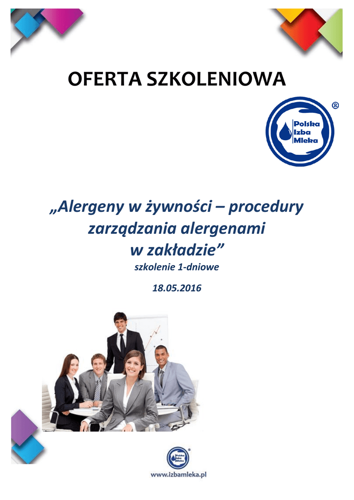 OFERTA SZKOLENIOWA „Alergeny w żywności – procedury zarządzania alergenami w zakładzie” szkolenie 1-dniowe 18.05.2016 DZIAŁ SZKOLEŃ PIM tel/fax (85) 874 43 88 [email protected] ul. Mickiewicza 7/23 15 - 213 Białystok Temat: Alergeny w żywności – procedury zarządzania alergenami w zakładzie. Jeżeli jesteś zainteresowany odpowiedzią na poniższe pytania, to powinieneś wziąć udział w organizowanym szkoleniu. Czy alergeny mogą stanowić potencjalne zagrożenie zdrowotne dla osób uczulonych? Kiedy i w jakich przypadkach? Jakie produkty najczęściej wywołują alergie? Co to jest obligatoryjna lista alergenów? Czy istnieje bezpieczny poziom alergenu dla osoby uczulonej? Jak informować konsumentów o zawartości alergenów w produkcie? Jak nadzorować znakowanie produktów alergenami? Co to jest znakowanie ostrzegawcze? Jak przeprowadzić identyfikację źródeł zagrożenia alergenami w zakładzie. Jakie środki nadzoru wprowadzić w zakładzie w ramach GMP aby zapobiegać zanieczyszczeniu krzyżowemu alergenami? Jak monitorować alergeny w ramach systemu HACCP? Jaką metodę badawczą wybrać: bezpośrednie wymazy linii, badanie wody czy testy wyrobu do monitorowania alergenów? Jak zaplanować i przeprowadzić walidacje procesów czyszczenia? Jak zaplanować szkolenia pracowników w procesie zarządzania alergenami? Przedmiot i cel szkolenia: Celem szkolenia jest zdobycie praktycznej wiedzy z zakresu ustanowienia i zarządzania alergenami w zakładzie oraz prawidłowe informowanie klientów za pomocą prawidłowego znakowania produktów spożywczych. Adresaci szkolenia: Szkolenie jest przeznaczone dla Pełnomocników ds. jakości odpowiedzialnych za zarządzanie jakością w firmie jak również dla kadry kierowniczej, pracowników nadzoru, pracowników laboratorium zakładowego. Przeznaczone dla osób, które pracują lub chcą się rozwijać i doskonalić w obszarze zarządzania alergenami. Umiejętności i wiedza zdobyte podczas szkolenia pozwolą na profesjonalne zarządzanie alergenami w firmie. Tematyka: 1. Pojęcie alergii i nietolerancji pokarmowa 2. Objawy alergii i nietolerancji pokarmowej, wstrząs anafilaktyczny. 3. Produkty wywołujące alergie. 4. Obligatoryjna lista alergenów. 5. Poziomy alergenów dla osoby uczulonej. 6. Znakowanie produktów spożywczych informacją o alergenach 7. Nadzór nad znakowaniem produktów. 8. Zarzadzanie alergenami w zakładzie - GMP 9. Zarzadzanie alergenami - system HACCP , analiza ryzyka. 10.Metody monitorowania alergenów w zakładzie. Omówienie metod badawczych. 11.Walidacja procesów czyszczenia w zakładzie, kryteria akceptacji dla procesów walidacji. 12.Szkolenia pracowników. Zakończenie szkolenia Szkolenie kończy się uzyskaniem zaświadczenia wystawionego przez PIM Sylwetka trenera Dr inż. Barbara Robak - Z wykształcenia Magister Inżynier Technolog Żywności i Żywienia oraz Doktor Nauk Rolniczych. Posiada duże doświadczenie we wdrażaniu. Ceniona przede wszystkim za rozległą wiedzę, profesjonalne podejście, rzetelność i dbanie o każdy szczegół szkolenia i projektów wdrożeniowych. Jako certyfikowany Trener Biznesu podczas prowadzenia szkoleń umiejętnie łączy wiedzę teoretyczną ze swoim bogatym doświadczeniem praktycznym. Zdobyte doświadczenia przy projektowaniu i wdrażaniu kilkudziesięciu systemów zarządzania pozwalają na zaoferowanie profesjonalnego doradztwa w całym sektorze rolno-spożywczym, w przedsiębiorstwach o różnych profilach produkcyjnych, magazynowologistycznych, transportowych, spedycyjnych itp. Specjalizuje się również w zakresie wymagań i norm przepisów prawa żywnościowego związanych m.in. z etykietowaniem, prowadzi doradztwo w zakresie oceny znakowania projektów opakowań. Przywoływane na szkoleniach różnorodne przypadki, z którymi zetknęła się w trakcie swoich doświadczeń pozwalają uczestnikom szkoleń na lepsze zrozumienie praktycznego zastosowania i dostosowanie do potrzeb swojego zakładu wymagań stawianych w takich m.in. w takich standardach jak IFS, BRC, HACCP, ISO 22000, FSSC, Food Defense, IFS Logistic, BRC IoP(Opakowania, GMP+(sektor paszowy). Współpracuje z wieloma międzynarodowymi jednostkami certyfikującymi m.in. Bureau Veritas Polska, TUV SUD Polska, TUV Nord Polska, Dekra Polska, SGS Polska, SAI GLOBAL i inne. Współpracuje również z organizacjami zrzeszającymi producentów żywności m.in. z Polską Izbą Mleka, Polską Izbą Makaronu, Zrzeszeniem Producentów Ryb „Pan Karp”, Zrzeszeniami Producentów Zbóż. Publikuje w czasopismach branżowych, występuje na konferencjach branżowych, szkoliła studentów na studiach podyplomowych – SGGW w Warszawie i wiele innych aktywności w obszarach sektora rolnospożywczego. Szkoliła z branży mleczarskiej m.in.: OSM SIERPC, SPOMLEK, MLEKPOL, ILIAS, LACTALIS, LAKTOPOL, inne branże: DR OETKER, CADBURY WEDEL, BROWARY ŁOMŻA, ADM SZAMOTUŁY, ZT KRUSZWICA, AGROS NOVA, MAKARONY POLSKIE, CHŁODNIA SZCZECIŃSKA, handel: CARREFOUR, JERONIMO MARTINS, opakowania ELOPAK, Peak Packaging Poland i wiele innych itd. Miejsce szkolenia MCC Mazurkas Conference Centre & Hotel ul. Poznańska 177 Ożarów Mazowiecki SZCZEGÓŁY OFERTY Temat Alergeny w żywności – procedury zarządzania alergenami w zakładzie MCC Mazurkas Conference Centre & Hotel Miejsce szkolenia Imię i nazwisko uczestnika …………………………………………………… proszę uzupełnić Termin 18.05.2016 Szkolenie jednodniowe Cena projektu szkoleniowego Cena szkolenia obejmuje: Warunki realizacji oferty 300 pln + 23% VAT (członkowie PIM) 420 pln + 23% VAT (niezrzeszeni w PIM) Obsługa trenerska Organizacja i koordynacja szkolenia Materiały szkoleniowe Zaświadczenia o ukończeniu szkolenia Przerwy kawowe (kawa, herbata, woda) Lunch Płatność za usługę będzie realizowana w formie zaliczki na podstawie faktury wystawionej na 7 dni przed realizacją szkolenia (Zarządzenie nr 01/2013 Dyre