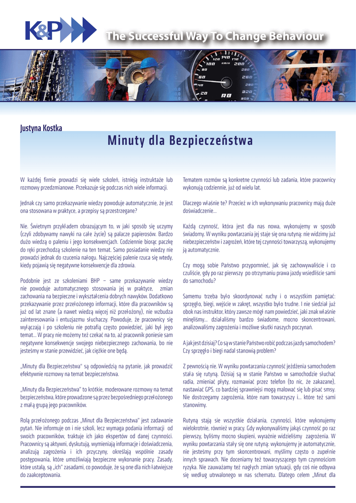 The Successful Way To Change Behaviour Justyna Kostka Minuty dla Bezpieczeństwa W każdej firmie prowadzi się wiele szkoleń, istnieją instruktaże lub rozmowy przedzmianowe. Przekazuje się podczas nich wiele informacji. Tematem rozmów są konkretne czynności lub zadania, które pracownicy wykonują codziennie, już od wielu lat. Jednak czy samo przekazywanie wiedzy powoduje automatycznie, że jest ona stosowana w praktyce, a przepisy są przestrzegane? Dlaczego właśnie te? Przecież w ich wykonywaniu pracownicy mają duże doświadczenie… Nie. Świetnym przykładem obrazującym to, w jaki sposób się uczymy (czyli zdobywamy nawyki na całe życie) są palacze papierosów. Bardzo dużo wiedzą o paleniu i jego konsekwencjach. Codziennie biorąc paczkę do ręki przechodzą szkolenie na ten temat. Samo posiadanie wiedzy nie prowadzi jednak do rzucenia nałogu. Najczęściej palenie rzuca się wtedy, kiedy pojawią się negatywne konsekwencje dla zdrowia. Każdą czynność, która jest dla nas nowa, wykonujemy w sposób świadomy. W wyniku powtarzania jej staje się ona rutyną: nie widzimy już niebezpieczeństw i zagrożeń, które tej czynności towarzyszą, wykonujemy ją automatycznie. Podobnie jest ze szkoleniami BHP – same przekazywanie wiedzy nie powoduje automatycznego stosowania jej w praktyce, zmian zachowania na bezpieczne i wykształcenia dobrych nawyków. Dodatkowo przekazywanie przez przełożonego informacji, które dla pracowników są już od lat znane (a nawet wiedzą więcej niż przełożony), nie wzbudza zainteresowania i entuzjazmu słuchaczy. Powoduje, że pracownicy się wyłączają i po szkoleniu nie potrafią często powiedzieć, jaki był jego temat... W pracy nie możemy też czekać na to, aż pracownik poniesie sam negatywne konsekwencje swojego niebezpiecznego zachowania, bo nie jesteśmy w stanie przewidzieć, jak ciężkie one będą. Czy mogą sobie Państwo przypomnieć, jak się zachowywaliście i co czuliście, gdy po raz pierwszy po otrzymaniu prawa jazdy wsiedliście sami do samochodu? Samemu trzeba było skoordynować ruchy i o wszystkim pamiętać: sprzęgło, biegi, wejście w zakręt, wszystko było trudne. I nie siedział już obok nas instruktor, który zawsze mógł nam powiedzieć, jaki znak właśnie minęliśmy… działaliśmy bardzo świadome, mocno skoncentrowani, analizowaliśmy zagrożenia i możliwe skutki naszych poczynań. A jak jest dzisiaj? Co są w stanie Państwo robić podczas jazdy samochodem? Czy sprzęgło i biegi nadal stanowią problem? „Minuty dla Bezpieczeństwa” to krótkie, moderowane rozmowy na temat bezpieczeństwa, które prowadzone są przez bezpośredniego przełożonego z małą grupą jego pracowników. Z pewnością nie. W wyniku powtarzania czynność jeżdżenia samochodem stała się rutyną. Dzisiaj są w stanie Państwo w samochodzie słuchać radia, zmieniać płyty, rozmawiać przez telefon (to nic, że zakazane), nastawiać GPS, co bardziej sprawniejsi mogą malować się lub pisać smsy. Nie dostrzegamy zagrożenia, które nam towarzyszy i… które też sami stanowimy. Rolą przełożonego podczas „Minut dla Bezpieczeństwa” jest zadawanie pytań. Nie informuje on i nie szkoli, lecz wymaga podania informacji od swoich pracowników, traktuje ich jako ekspertów od danej czynności. Pracownicy są aktywni, dyskutują, wymieniają informacje i doświadczenia, analizują zagrożenia i ich przyczyny, określają wspólnie zasady postępowania, które umożliwiają bezpieczne wykonanie pracy. Zasady, które ustalą, są „ich” zasadami, co powoduje, że są one dla nich łatwiejsze do zaakceptowania. Rutyną stają sie wszystkie działania, czynności, które wykonujemy wielokrotnie, również w pracy. Gdy wykonywaliśmy jakąś czynność po raz pierwszy, byliśmy mocno skupieni, wyraźnie widzieliśmy zagrożenia. W wyniku powtarzania stały się one rutyną: wykonujemy je automatycznie, nie jesteśmy przy tym skoncentrowani, myślimy często o zupełnie innych sprawach. Nie doceniamy też towarzyszącego tym czynnościom ryzyka. Nie zauważamy też nagłych zmian sytuacji, gdy coś nie odbywa się według utrwalonego w nas schematu. Dlatego celem „Minut dla „Minuty dla Bezpieczeństwa“ są odpowiedzią na pytanie, jak prowadzić efektywnie rozmowy na temat bezpieczeństwa. The Successful Way To Change Behaviour Bezpieczeństwa” jest omówienie rutynowych czynności, ponowne dostrzeżenie towarzyszących im zagrożeń, niebezpieczeństw i obciążeń. Poprzez rozmowę chcemy rozwinąć tzw. dobre nawyki, tzn. że normą nie będzie praca wbrew zasadom bezpieczeństwa, lecz przestrzeganie obowiązujących przepisów. Dzięki temu pracownicy uświadomią sobie ponownie zagrożenia, konsekwencje swojego zachowania, będą pracować bezpiecznie i nie będą stanowić zagrożenia dla samych siebie i innych współpracowników. Zostaną wyrwani ze „złej” rutyny. Podczas „Minut dla Bezpieczeństwa” pracownicy mają również możliwość przyjrzeć się istniejącym przepisom. W czasie rozmowy może okazać się, że sytuacja w firmie w ostatnim czasie zmieniła się znacząco i niektóre obowiązujące przepisy muszą zostać do niej dostosowane (aby pracownicy ich nie łamali). Wszystko musi oczywiście odpowiadać ogólnym normom prawnym. Pracownicy mogą również zauważyć zagrożenia, które dotychczas nie zostały ujęte w ocenie ryzyka. Mogą je wtedy zapisać i zaproponować uzupełnienie oceny ryzyka czy instrukcji stanowiskowej o dany zapis. Podczas rozmowy pracownicy mogą również przedyskutować i rozwiązać wiele problemów. Z naszego dotychczasowego doświadczenia wynika, że wspólna rozmowa w formie „Minut dla Bezpieczeństwa” i przemyślenie istniejących problemów w grupie pobudza kreatywność pracowników, którzy podczas tej rozmowy znajdują świetne, proste i często tanie rozwiązania problemów, z którymi firma borykała się od wielu