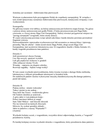 Jesteśmy juŜ uczniami - ślubowanie klas pierwszych WaŜnym wydarzeniem było przystąpienie Polski do wspólnoty europejskiej. W związku z tym został opracowany scenariusz ślubowania klas pierwszych, tematycznie związany z tym wydarzeniem. Scenografia: Na głównej ścianie wisi tablica, na której umieszczona jest kolorowa mapa Europy. Na górze z prawej strony umieszczone jest godło Polski. Z boku przymocowana jest flaga białoczerwona, a z lewej strony flaga Unii Europejskiej. NaleŜy równieŜ przygotować miejsce na "pociąg europejski" (wagoniki, które niosły dzieci). W części artystycznej powinna wziąć udział cała klasa i kaŜde dziecko powinno powiedzieć fragment wiersza. Pierwszoklasistów wprowadza wychowawczyni lub uczennica ze starszej klasy i śpiewają piosenkę "Idę do szkoły". Jeden uczeń niesie flagę Polski, drugi uczeń flagę Unii Europejskiej, inni uczniowie lokomotywę oraz 16 wagoników (kartki z bloku formatu A3, kaŜdy wagonik przedstawia inne państwo. Dziecko I: Jeśli przemierzyć chcesz Europę I na Alp szczyty, spojrzeć wysokie Lub gdy popływać zechcesz w gondoli Albo zobaczyć słynne Tivoli, Wsiadaj – zaprasza cię ekspres szkolny, RozwiąŜ zagadkę – będzie wstęp wolny! W tym czasie wychodzi pierwszoklasista, który trzyma wycięta z duŜego bloku niebieską lokomotywę z Ŝółtymi gwiazdkami ułoŜonymi w kształcie koła. Do niektórych państw moŜna wykorzystać muzykę charakterystyczną dla danego państwa, pieśń lub taniec. Dziecko II: Piękna stolica - miasto walczyka! Tańca i pieśni tu nie unikaj... Nasz król Jan Trzeci - wodzowska głowa Od Turków dzielnie je uratował... A góry jakie w tym pięknym kraju Polscy narciarze dobrze je znają! Sam Adaś Małysz - nad skoczki skoczek Nie raz trenował na tamtych zboczach. Mówcie, by zyskać gromkie oklaski Jakie to państwo z naszej "Piętnastki"? (Austria) Wychodzi kolejny uczeń, z wagonikiem, wszystkie dzieci odpowiadają Austria, a "wagonik" przedstawia Austrię. Po kaŜdej kolejnej zwrotce wychodzi dziecko z wagonikiem, który przedstawia dane państwo. Dziecko III: Państwo bogate, chociaŜ nieduŜe W Europejskiej Unii „na górze”. Jego stolica – Unii stolicą! Jakie to państwo? Bystrzy wnet chwycą... (Belgia) Dziecko IV: Tam się wykluło brzydkie kaczątko... Tam z zapałkami marzło dziewczątko – Snuł pan Andersen swych baśni wątek... I klocków „LEGO” tam był początek! Jakie to państwo – zgadniecie łatwo – A więc do dzieła, roztropna dziatwo! (Dania) Dziecko V: Jest ponoć krajem jezior tysiąca I choć nie parzy tu nadmiar słońca MoŜesz przebywać w florze przy faunie, A ciepło znajdziesz w gościnnej saunie – Lub się ogrzejesz przy reniferze... Jakie to państwo? Śmiało i szczerze... (Finlandia) Dziecko VI: Płynie Sekwana u stóp Notre Dame W Luwrze naczelnym punktem programu Jest Mony Lizy uśmiech przesławny... A nad Loarą czar zamków dawnych... I lazurowe kusi wybrzeŜe... Jakie to państwo? – śmiało i szczerze... (Francja) Dziecko VII: Pod Akropolem – stare kamienie, Amfiteatry, chóry na scenie... Gaje oliwne, Korynt, Pireus, Z wyŜyn Olimpu spogląda Zeus... Morze Egejskie z wodą wspaniałą... Jakie to państwo? Szczerze i śmiało! (Grecja) Dziecko VIII: W rytmie flamenco napięcie rośnie, A kastaniety klaszczą donośnie... Korrida wabi Ŝądnych tych wraŜeń, Innych Majorka – ten przedmiot marzeń... I Costa Brava cudne wybrzeŜe... Jakie to państwo? Śmiało i szczerze! (Hiszpania) Dziecko IX: Część tego kraju to są poldery – Wydarty morzu grunt Ŝyzny, szczery... Wiatrak tam stoi blisko wiatraka... I tulipanów obfitość taka... Co to za państwo? Odgadnąć łatwo... A więc odpowiedz – szanowna dziatwo! (Holandia) Dziecko X: Zieloną wyspą często jest zwana, Z Anglią przez wiele wieków związana Dziś protestanci i katolicy Nie lubią innych w swej okolicy... Na kobzie grają melodie Ŝwawe – Jakie to państwo? Bardzo ciekawe... (Irlandia) Dziecko XI: Małe państewko – lecz Księstwo Wielkie, Na mapie widzisz jakby kropelkę Pomiędzy Belgią, Francją, Niemcami... Jakie to państwo? Zgadnijcie sami... (Luksemburg) Dziecko XII: Po zjednoczeniu – wielka potęga, Po dobrobytu trofea sięga Tego bliskiego Polski sąsiada Wnet odgadniecie... Kto odpowiada? (Niemcy) Dziecko XIII: Kraina piękna, ciepła, szczęśliwa, Atlantyk plaŜ jej stopy obmywa... Do Sanktuarium w cichej Fatimie Co roku strumień pielgrzymów płynie... śeglarze Ŝyją tu i górale... Co to za państwo/ Nietrudne wcale... (Portugalia) Dziecko XIV: Ongiś z „potopem” do nas przybyli, Lecz Częstochowy...nie! Nie zdobyli... Dali nam królów spod znaku Wazy – Dziś nie czujemy do nich urazy... O jakie państwo z „Piętnastki” chodzi? Odpowiadajcie, geniusze młodzi... (Szwecja) Dziecko XIV: Big Ben wydzwania swoją piosenkę, ElŜbiecie Drugiej czyniąc podziękę, śe juŜ pół wieku włada wzorowo Wyspiarskim krajem. Więc ruszcie głową – I pociągnąwszy łyczek herbatki – Jakie to państwo? Powiedzcie dziatki! (Wielka Brytania) Dziecko XV: Na mapie – jakby wielkie bucisko – Jest tam Wezuwiusz, Pompei blisko... I Wieczne Miasto, które zachwyca Oraz Piotrowa święta stolica... śe mądrej głowie – to dość dwie słowie – Jakie to państwo? KtóŜ mi odpowie? (Włochy) W tym momencie, gdy został utworzony pociąg europejski, moŜna zaprosić wszystkich do wysłuchania hymnu - utwór "Oda do radości" z finału IX Symfonii Ludwiga van Beethovena ze słowami Fryderyka Schillera). Wcześniej naleŜy dzieciom zwrócić uwagę na prawidłową postawę. Po hymnie uczniowie wagoniki umieszczają z boku ściany Dziecko XVI (uczeń wchodzi z biało-czerwoną flagą na środek sceny, a cicho rozbrzmiewa np. polonez F. Chopina): Pora juŜ wracać tutaj, nad Wisłę, Gdzie Stare Miasto... Most Świętokrzyski... I gdzie od wieków nasz polski orzeł Nad kontynentem fruwał niezgor